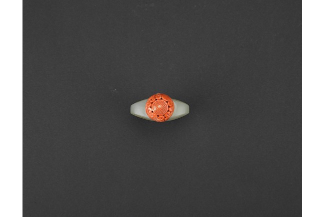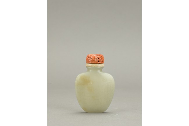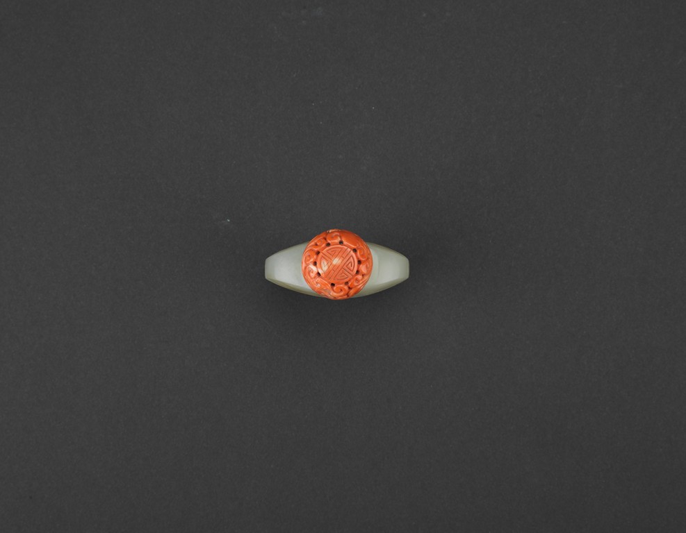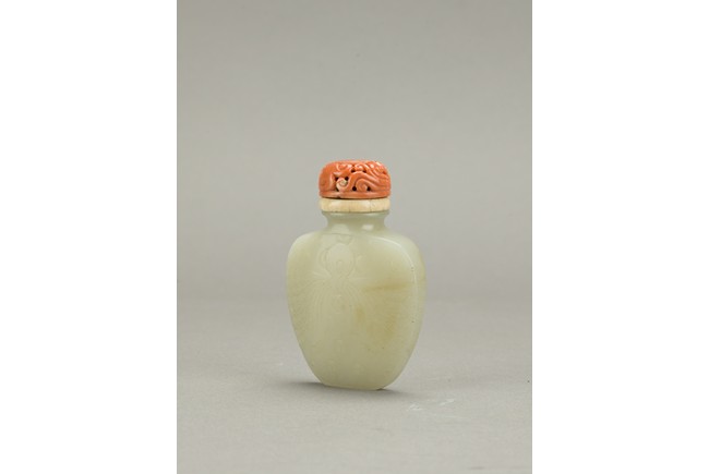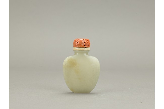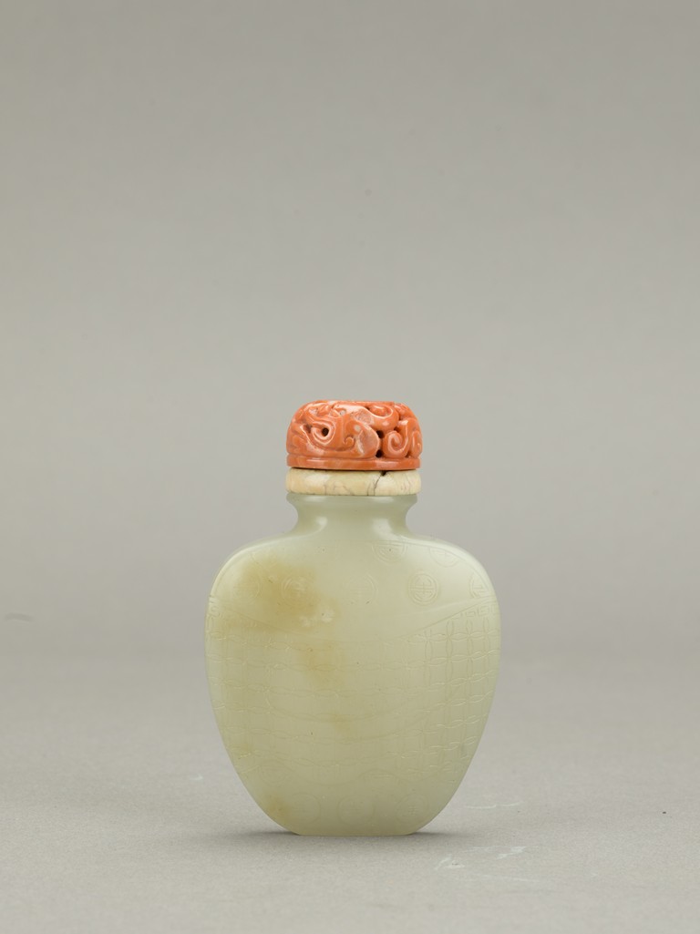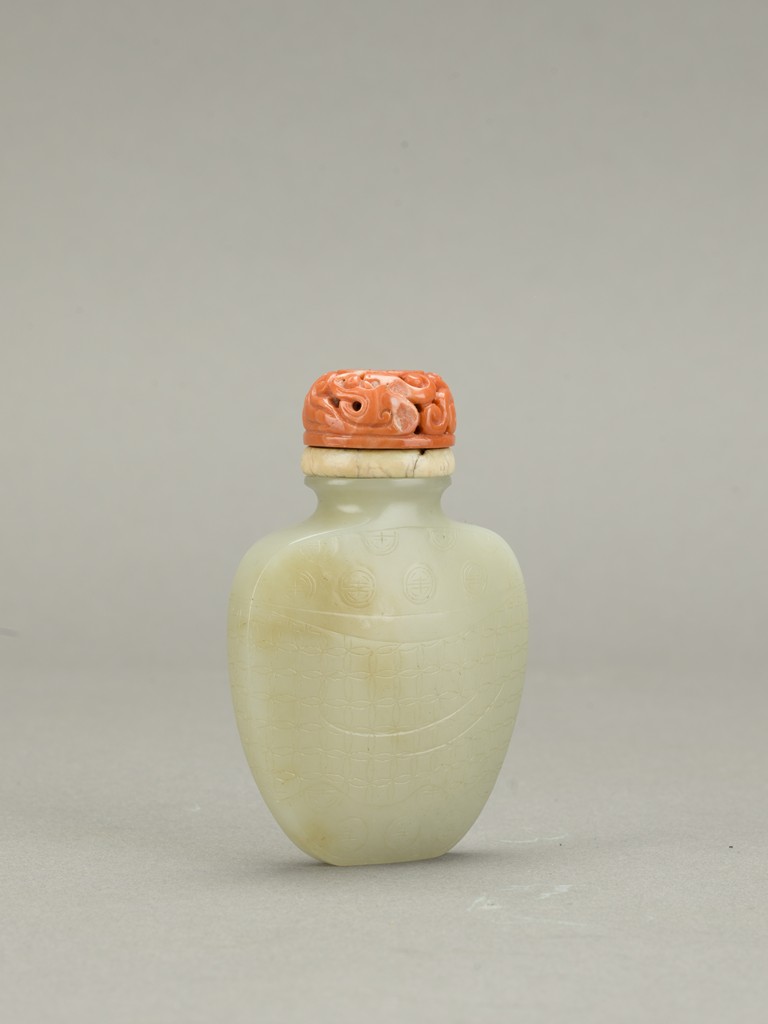 Of flattened spade shaped, the body carved in shallow relief a brocade sash tied to the center reserved on a ground with stylized shou roundels, the stone is of even white tone, accompanied with carved coral stopper. Qing Dynasty period.
