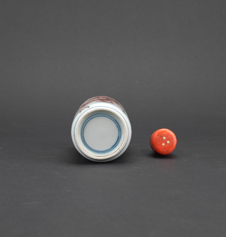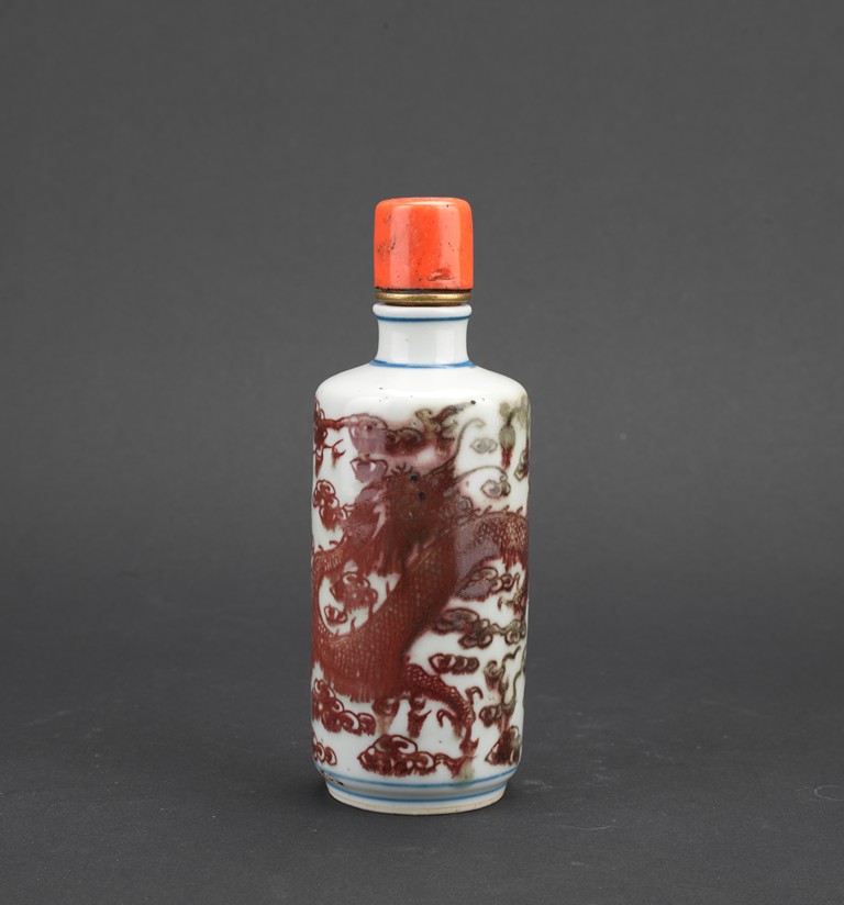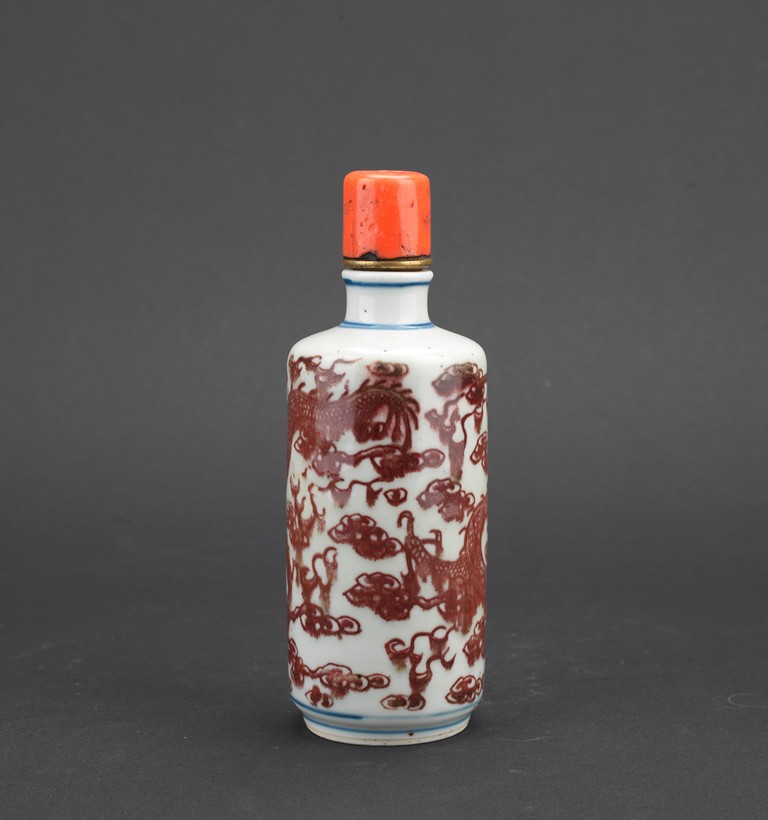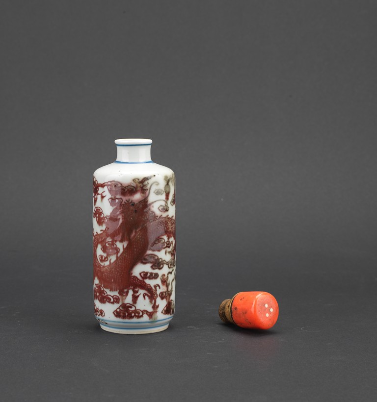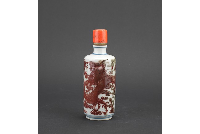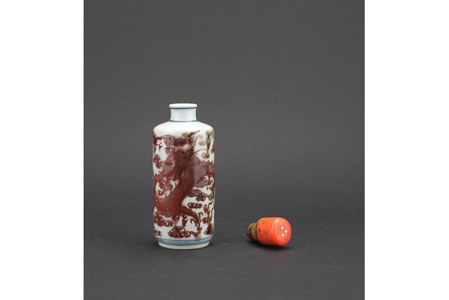 Of cylindrical form, the body painted in underglaze red with dragon amidst auspicious clouds, with a coral stopper. Qing Dynasty period.