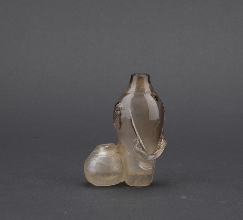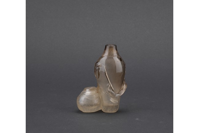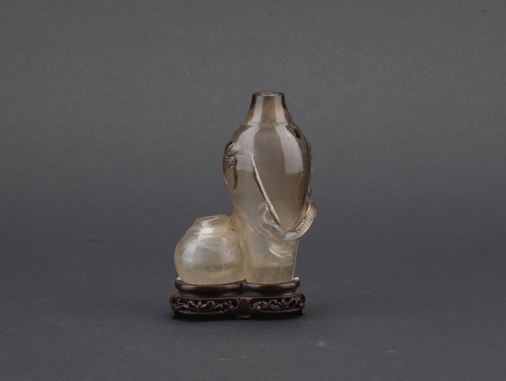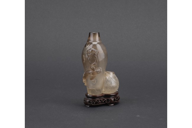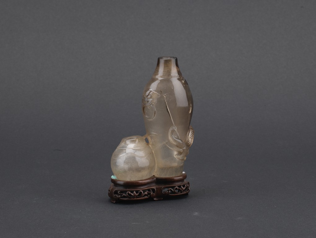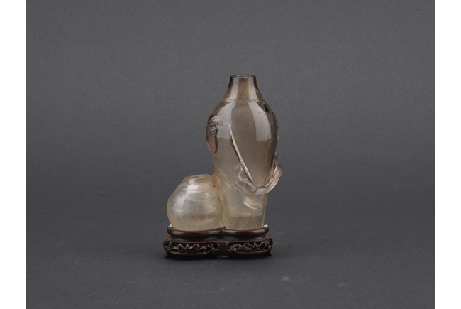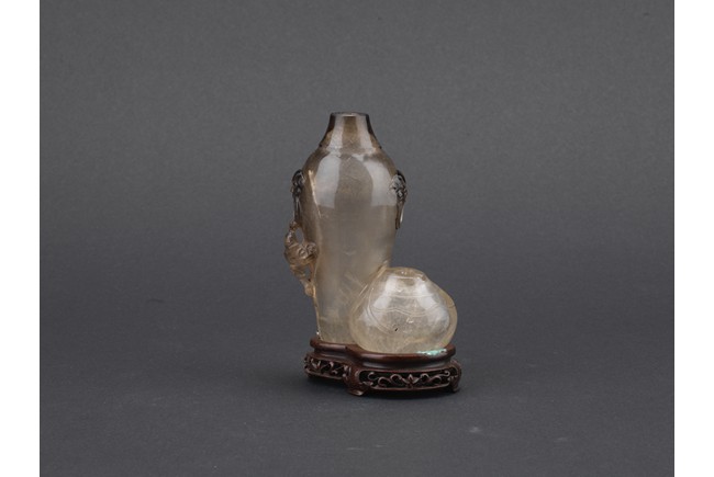 Carved in the form of two joined vessel, the taller vase with two raised handles and carved with a chilong clambering on the body in high relief, all supported on a hardwood stand. Qing Dynasty period.