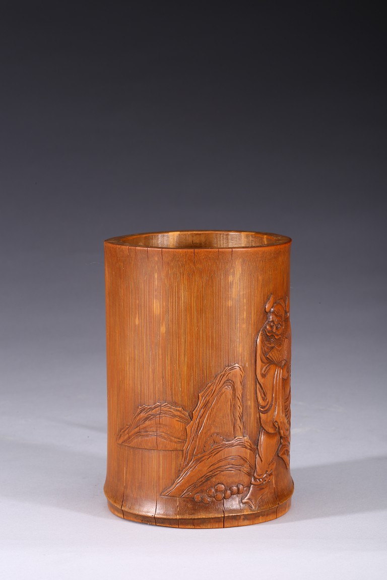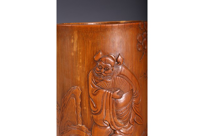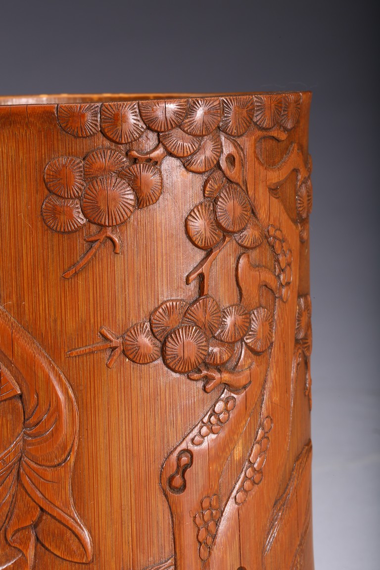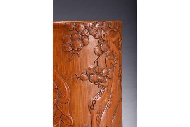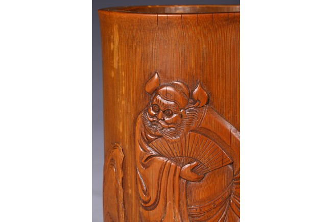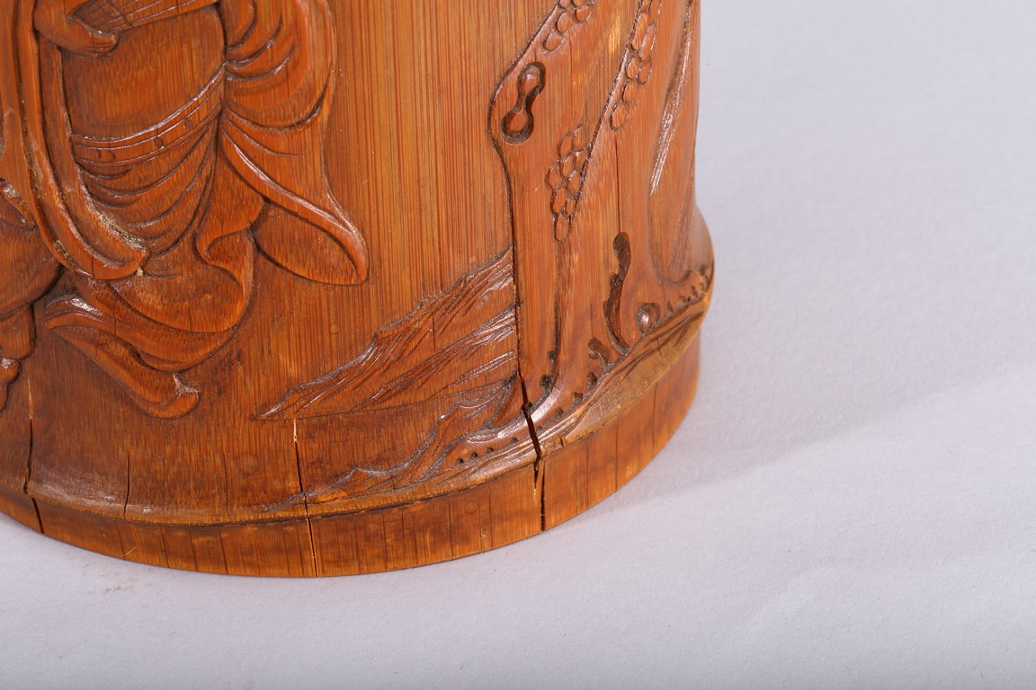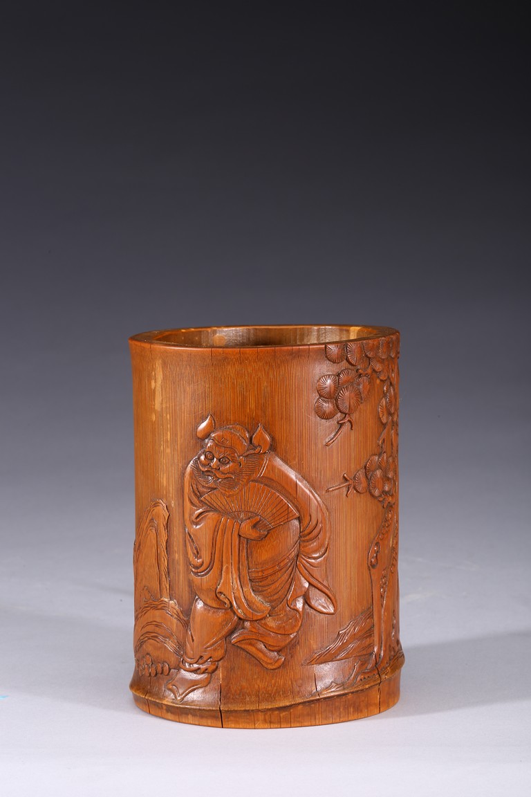 Of cylindrical form, carved to the exterior in relief with Zhongkui the bearded demon queller walking between a pine tree and boulders, holding a fan in his hand, with his head turned to one side. the bamboo of a rich ochre patina. Republic period.