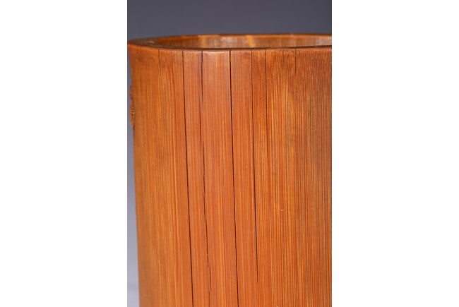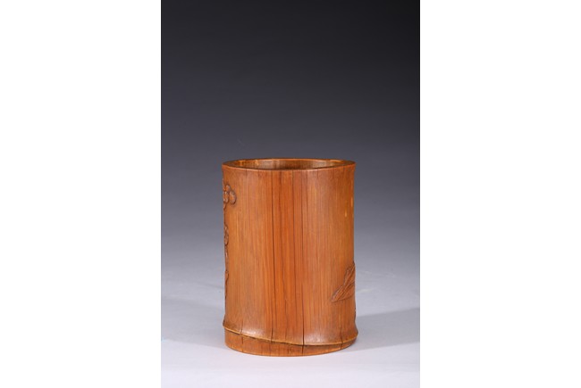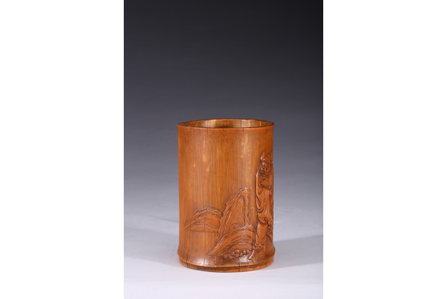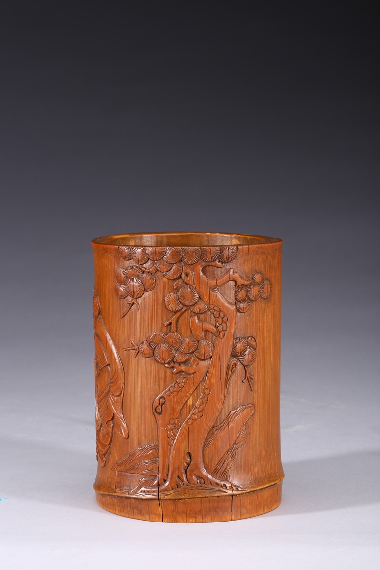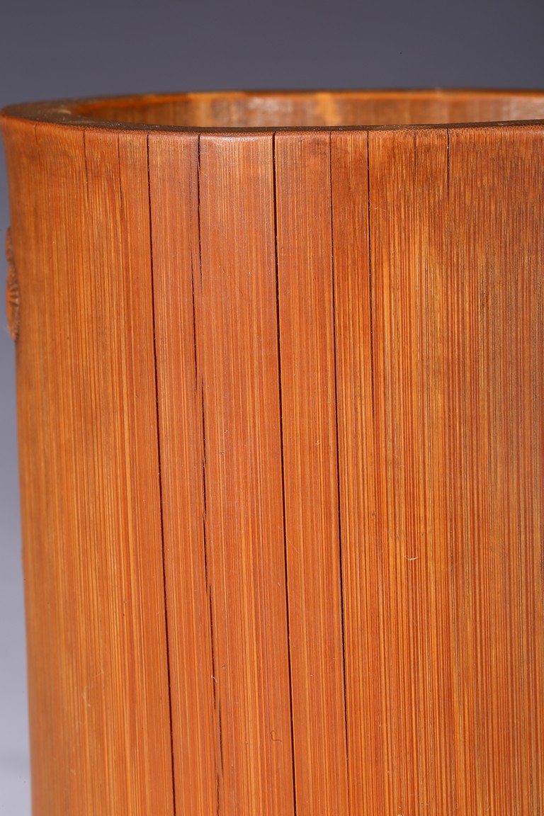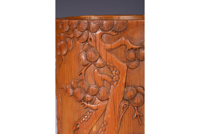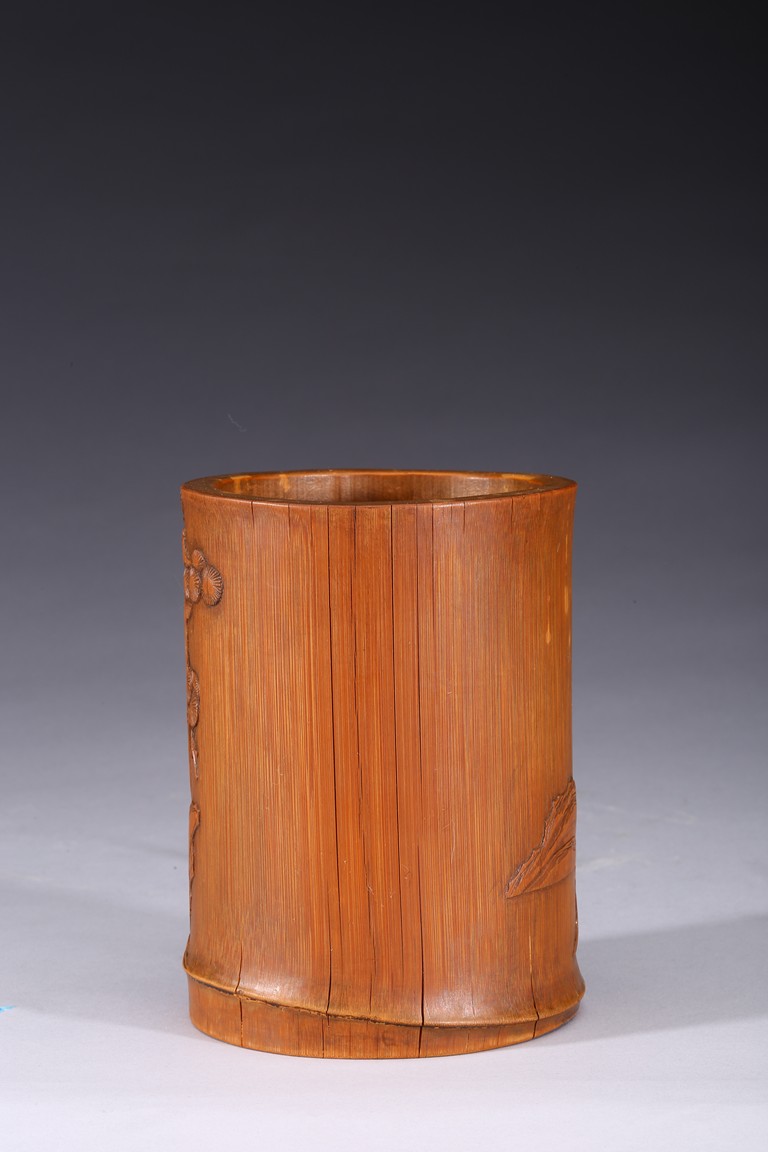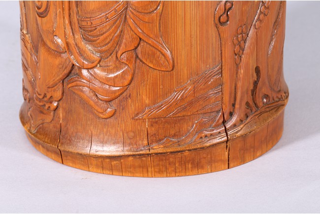 Of cylindrical form, carved to the exterior in relief with Zhongkui the bearded demon queller walking between a pine tree and boulders, holding a fan in his hand, with his head turned to one side. the bamboo of a rich ochre patina. Republic period.