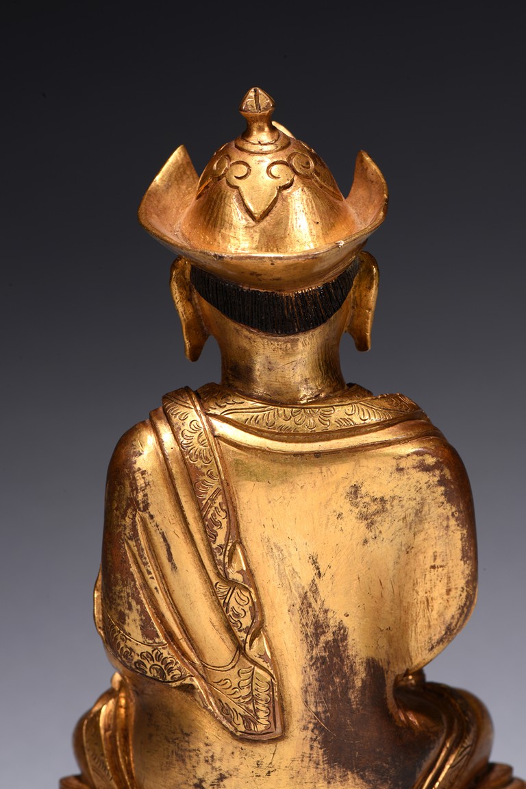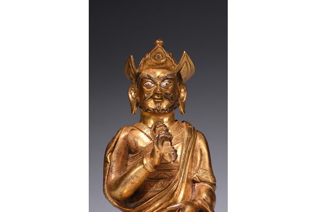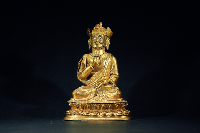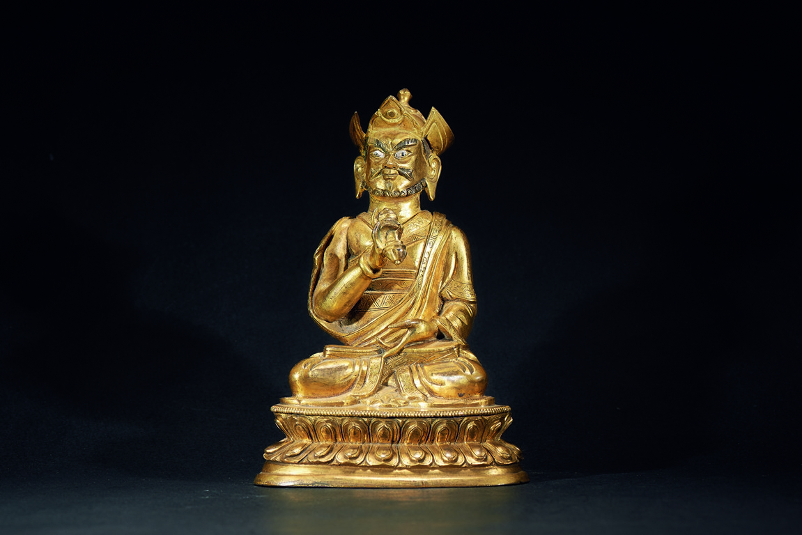 Shown seated in dhyanasana on a double lotus throne, right hand raised holding a vajra, wearing dhoti with incised hems, face with intense expression, wearing pointed hat, overall richly gilt. Qing Dynasty period.