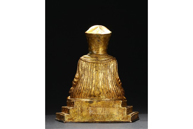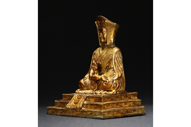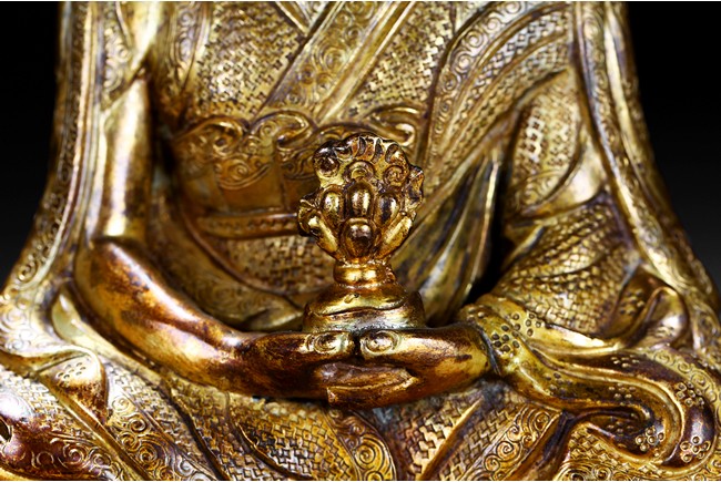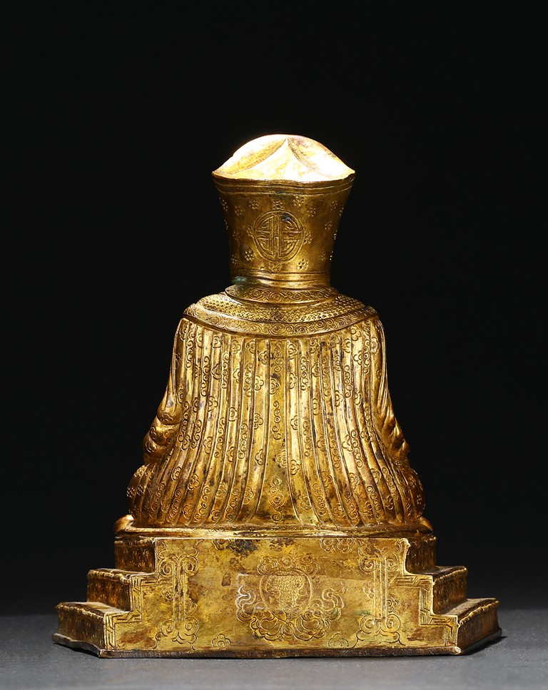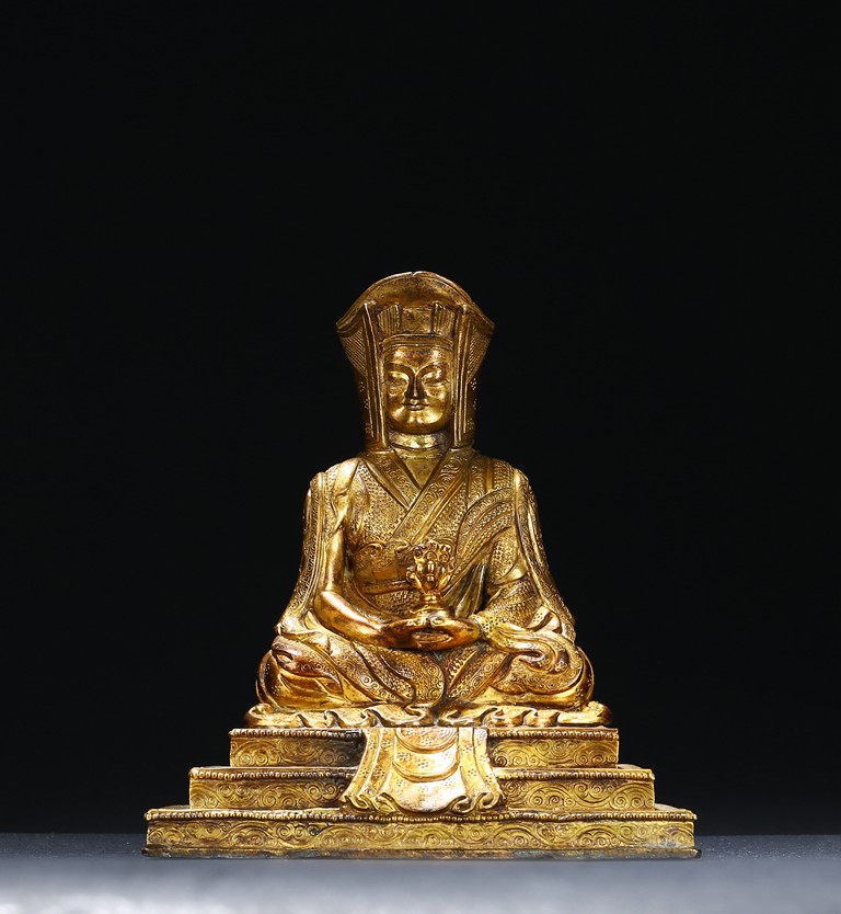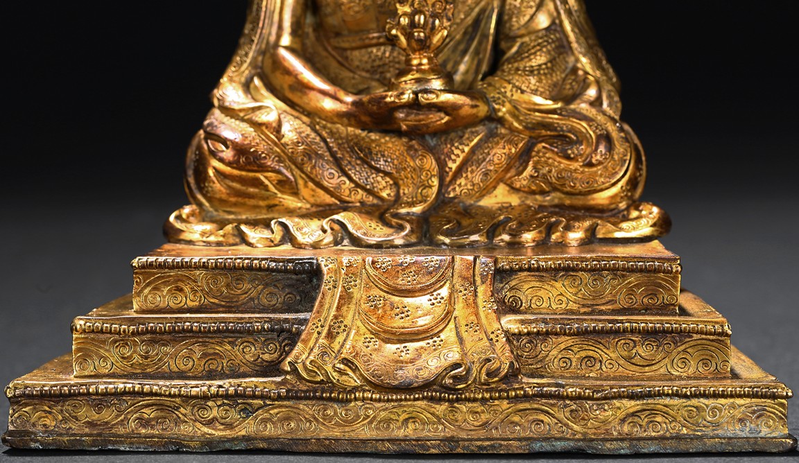 Seated on a stepped plinth, hands holding a ritual object, wearing voluminous robe decorated dense pattern, face in meditation. Qing Dynasty period.