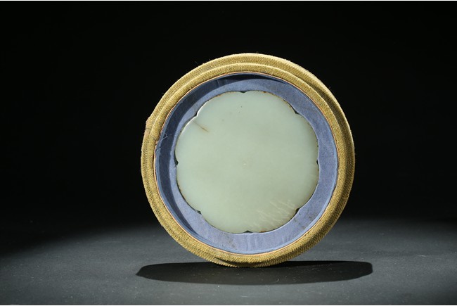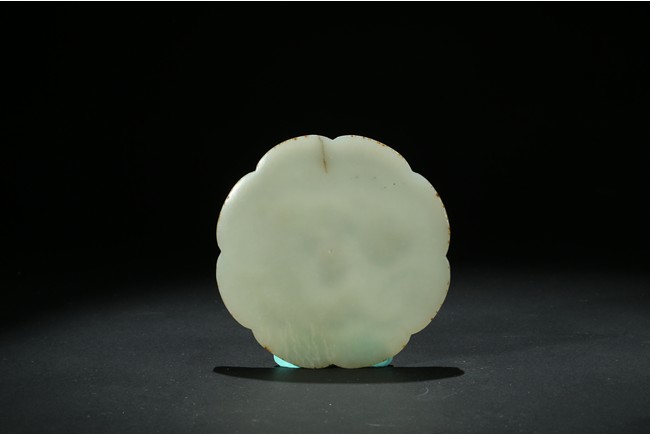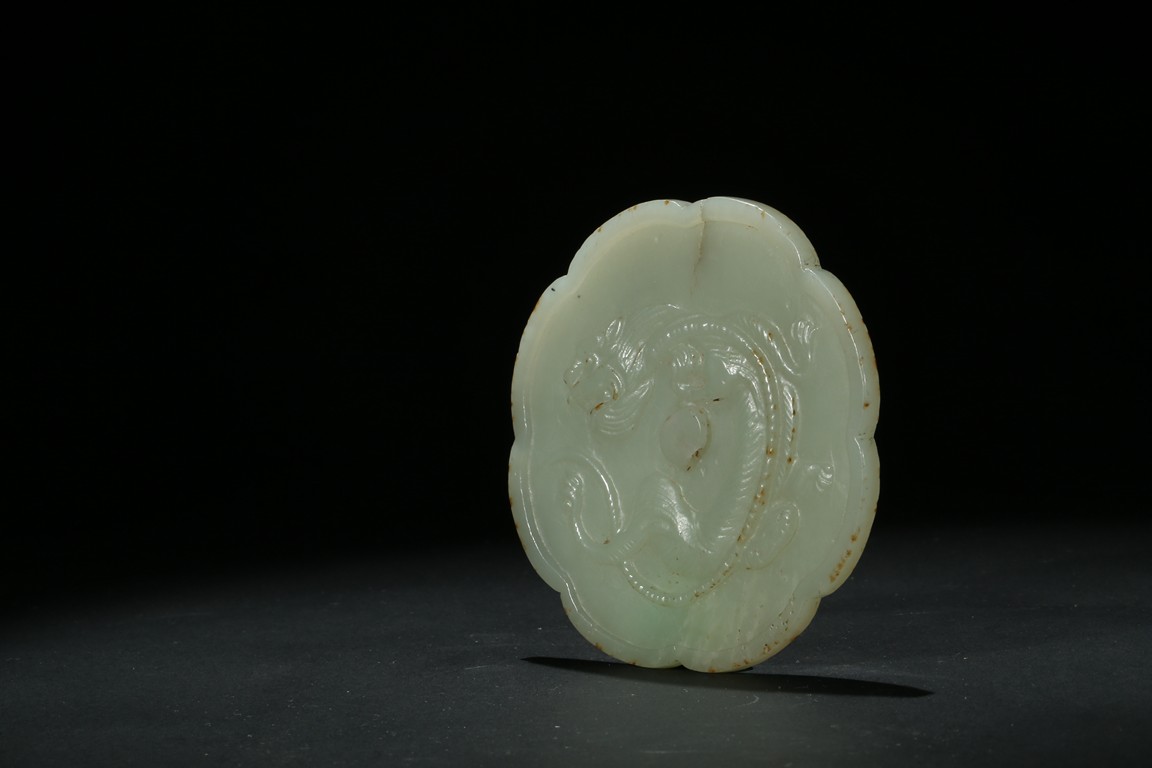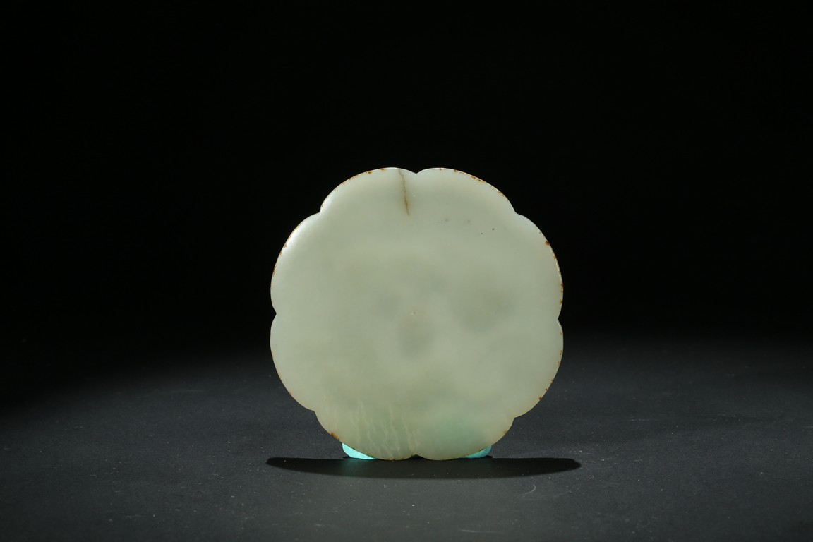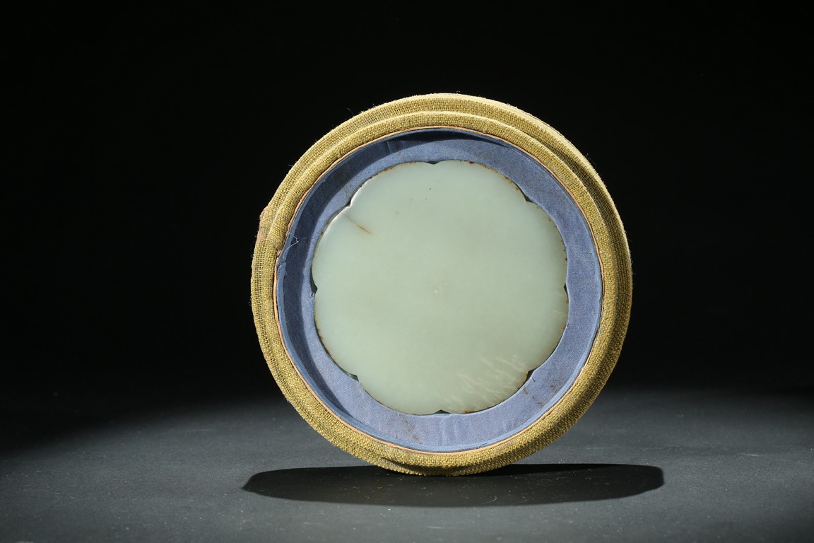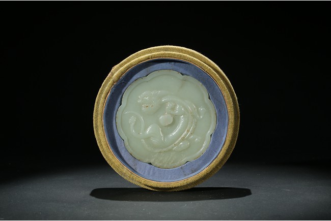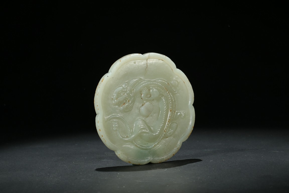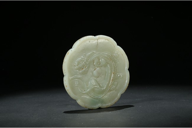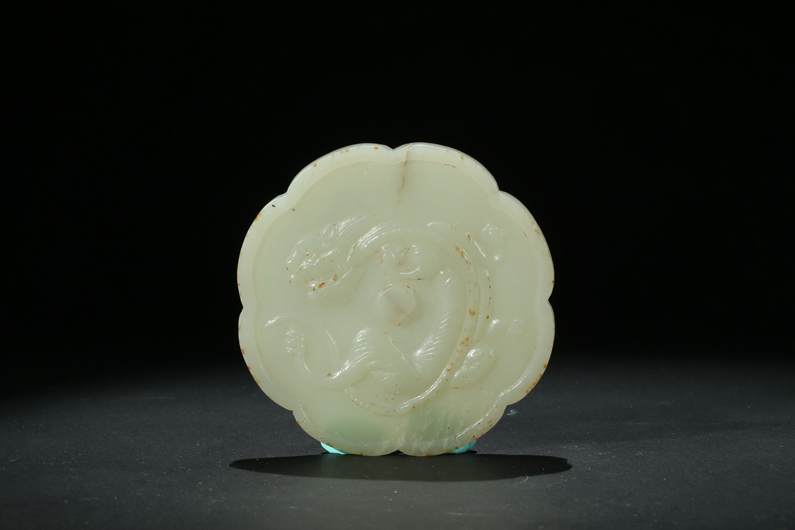 Of lobed shaped, finely carved with ferocious chilong writhing in relief around the center. The stone is of even white tone, with some russet inclusions. Qing Dynasty period.