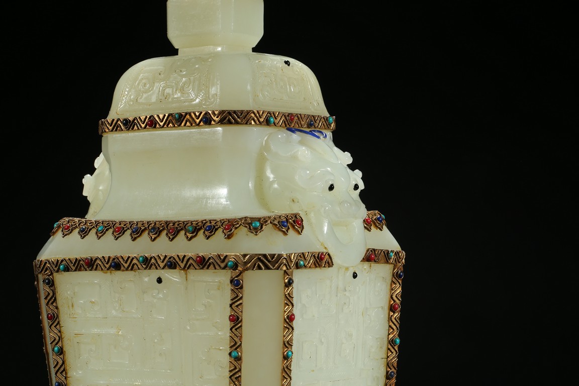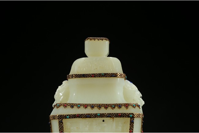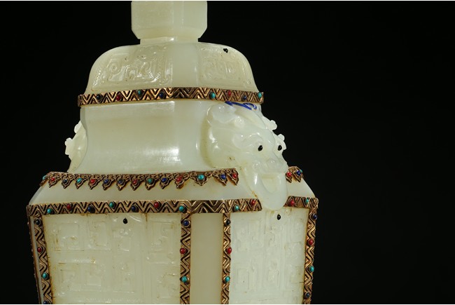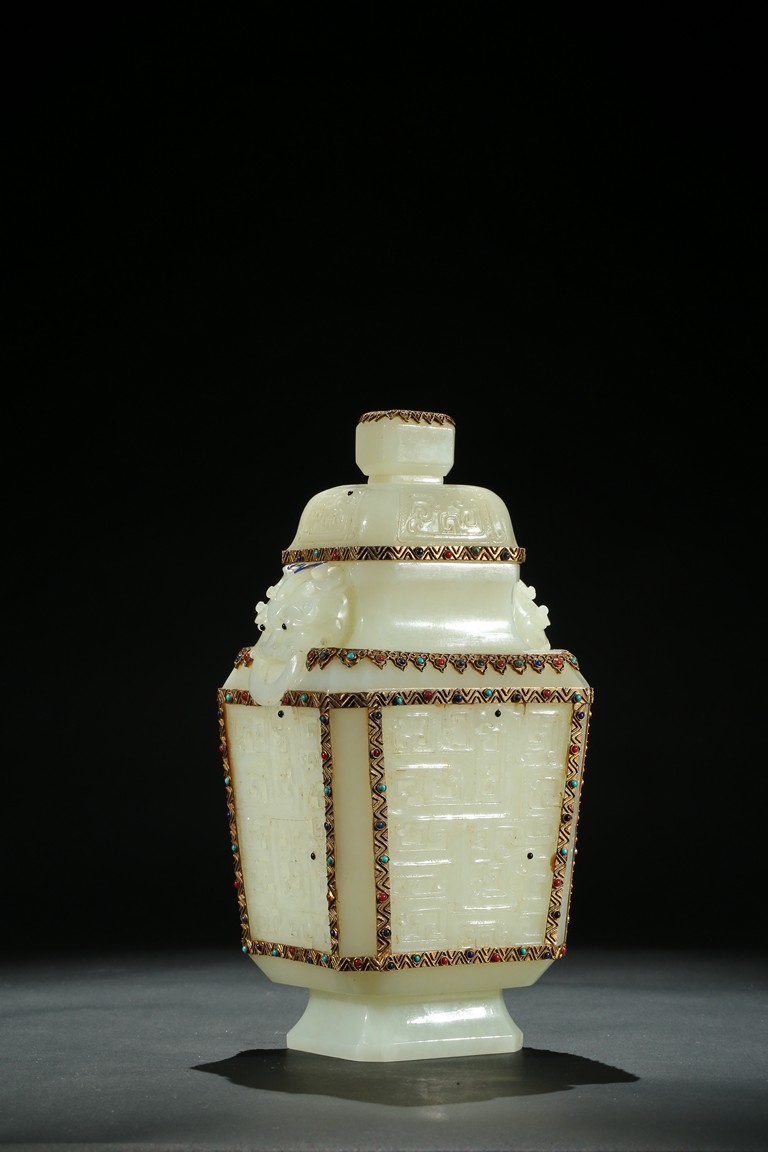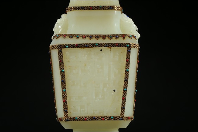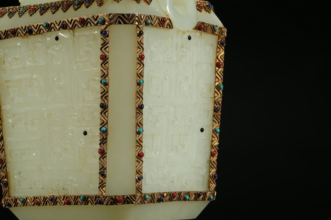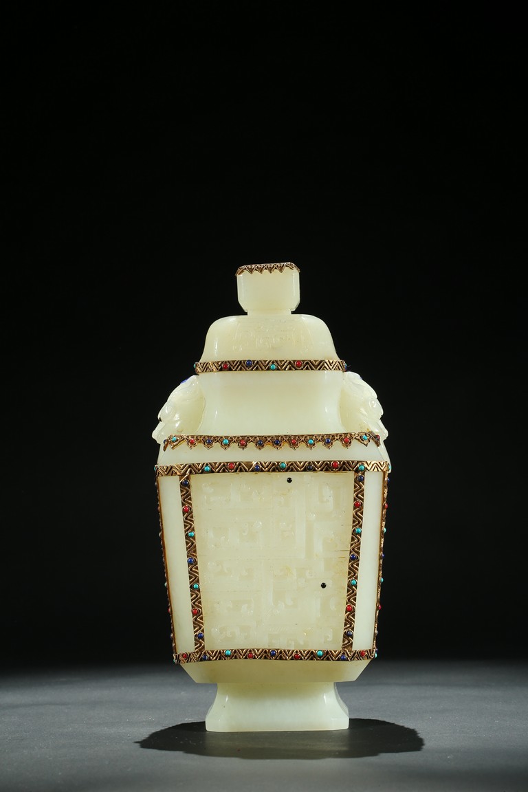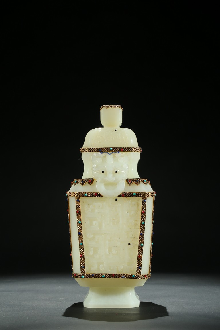 此瓶取和田玉雕琢而成,玉質堅密,色澤溫潤,用料考究,敦厚莊重,紋飾古雅簡樸,做工謹慎精細,穩重大方,呈現雅麗高貴之氣,十分珍貴。華美的造型,精湛的工藝,又嵌金邊,無不體現出此瓶出身的顯貴。