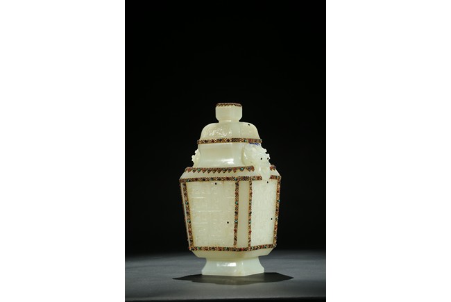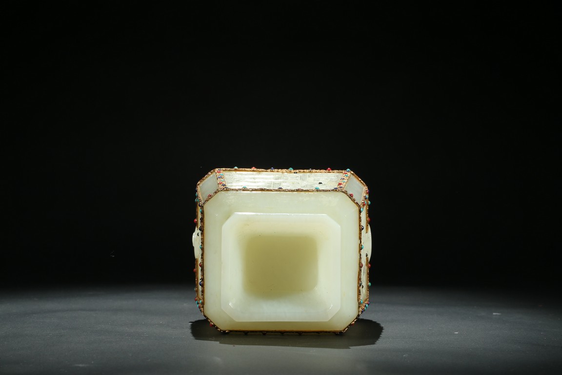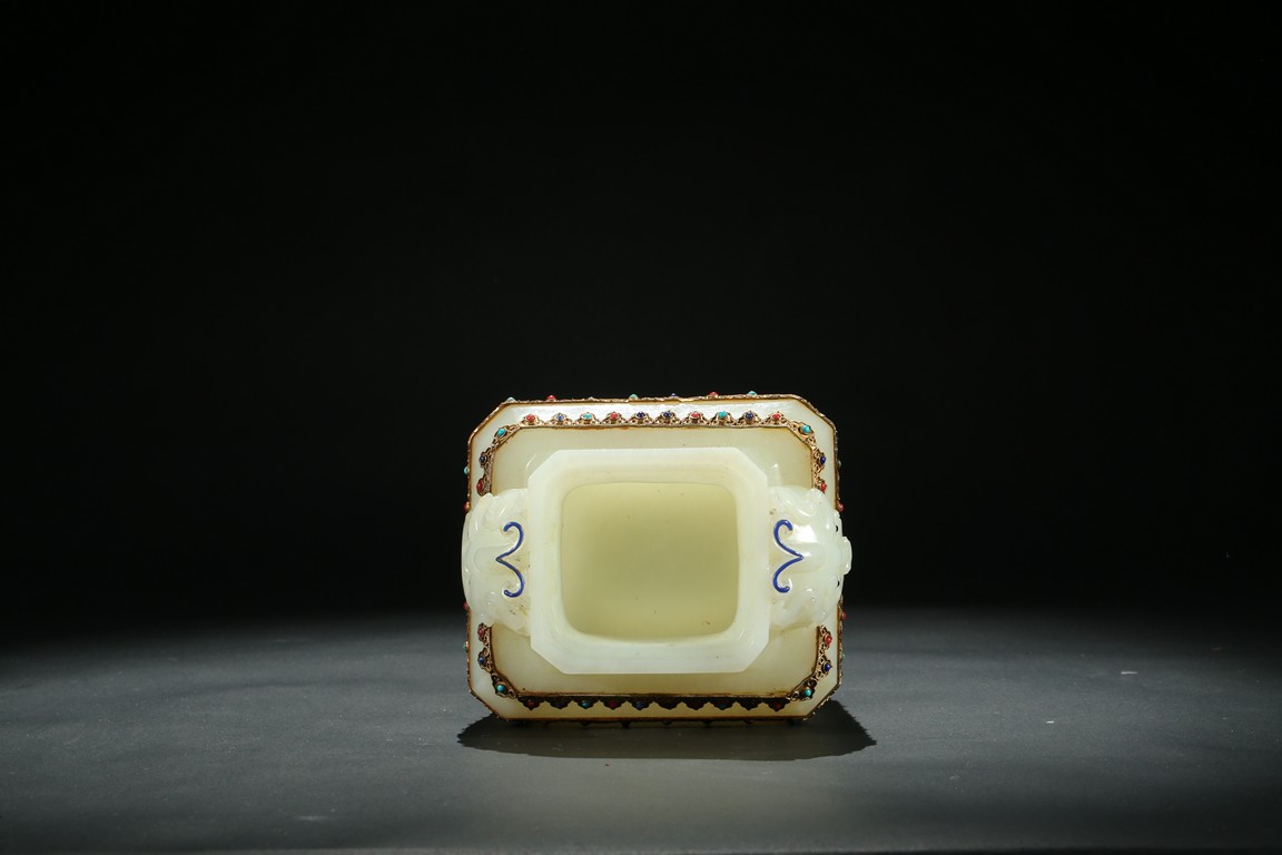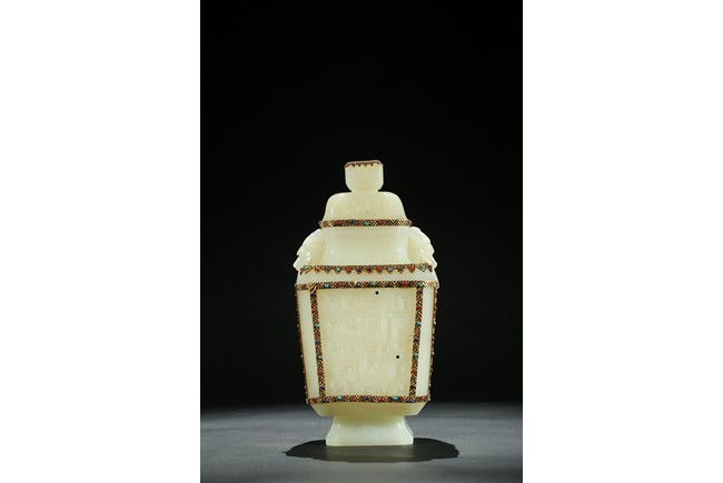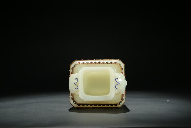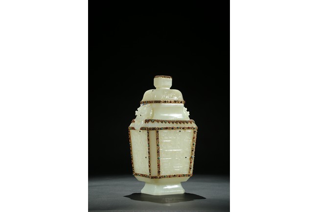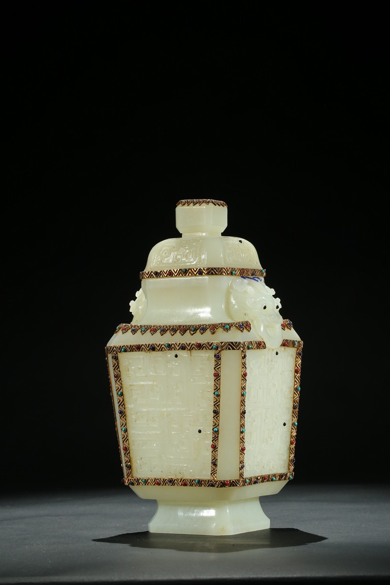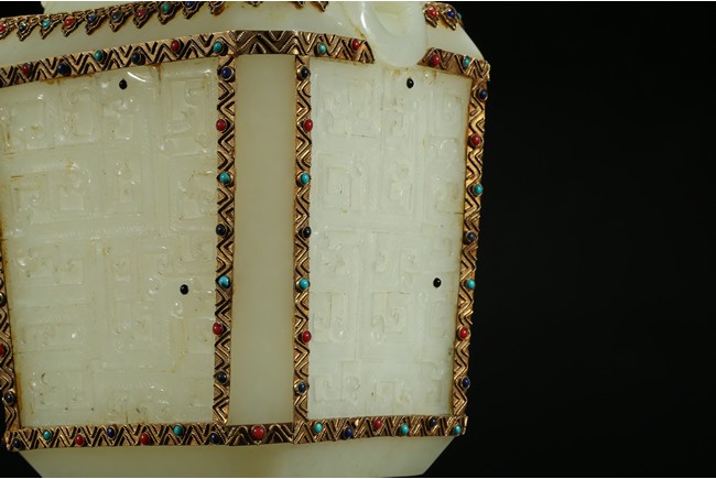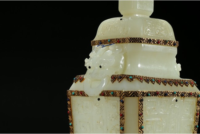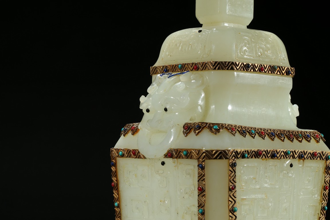 此瓶取和田玉雕琢而成,玉質堅密,色澤溫潤,用料考究,敦厚莊重,紋飾古雅簡樸,做工謹慎精細,穩重大方,呈現雅麗高貴之氣,十分珍貴。華美的造型,精湛的工藝,又嵌金邊,無不體現出此瓶出身的顯貴。