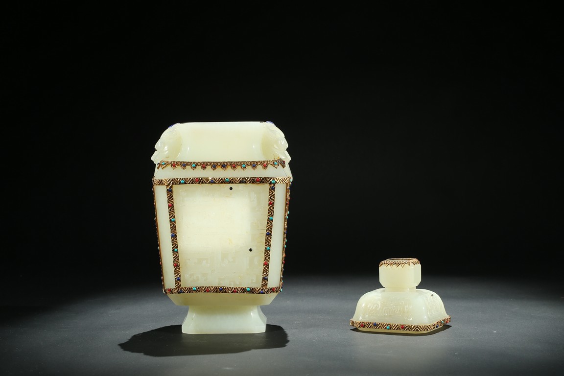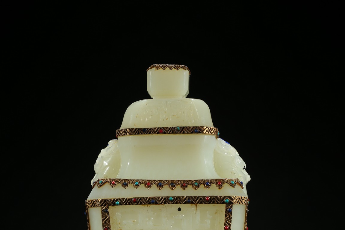 Of square section, the vase carved with geometric pattern to the body and decorated with gilt bronze sides and inlaid with semi-precious gems including turquoise, coral, and lapis lazuli beads, the neck flanked by two mythical beast handles and fitted with a domed cover.