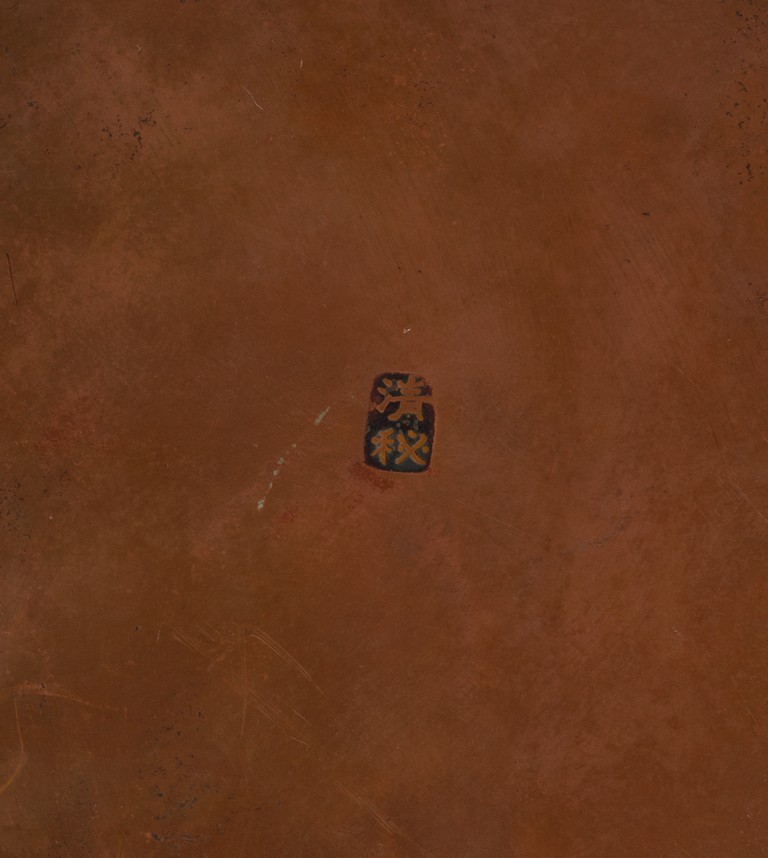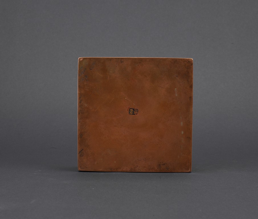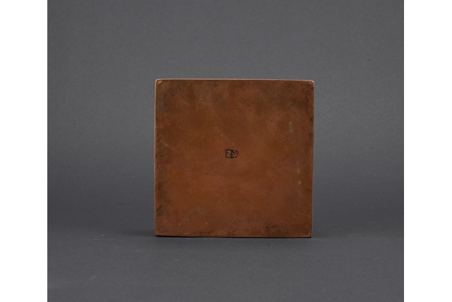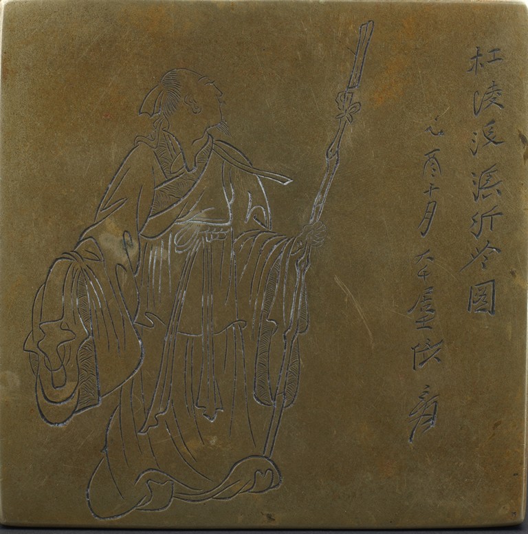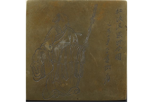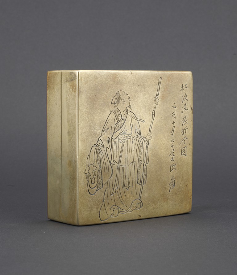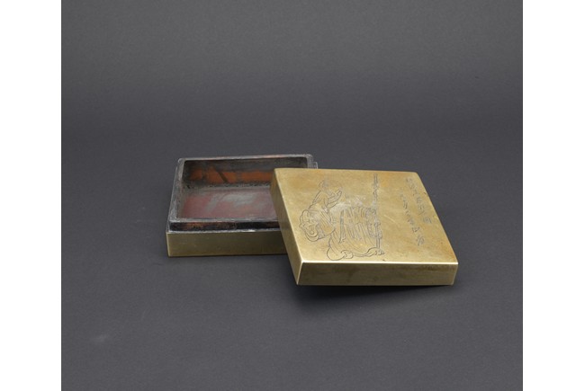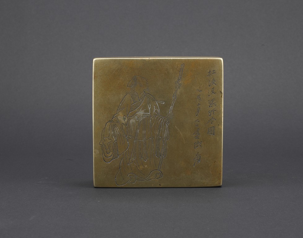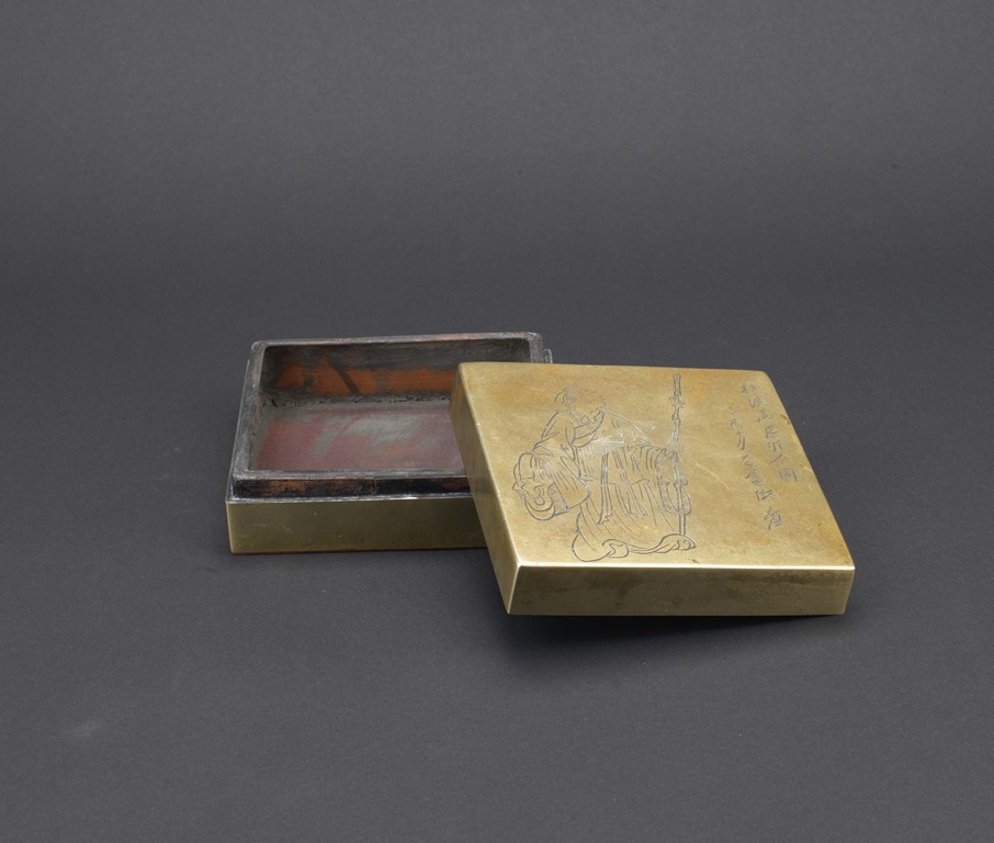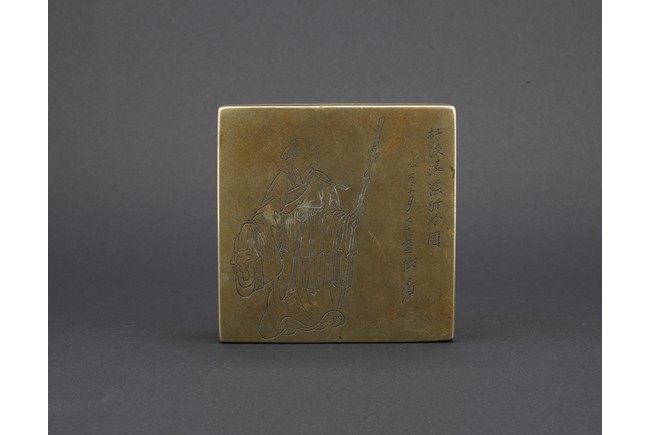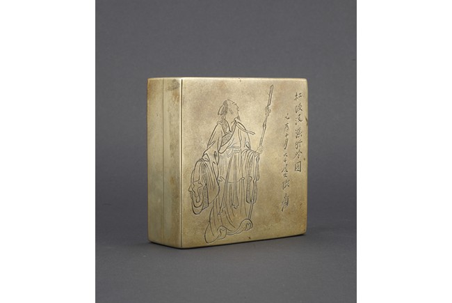 Of square section, the cover decorated with a figure and inscription in the style of Zhang Daqian's works, the underside with two character mark.