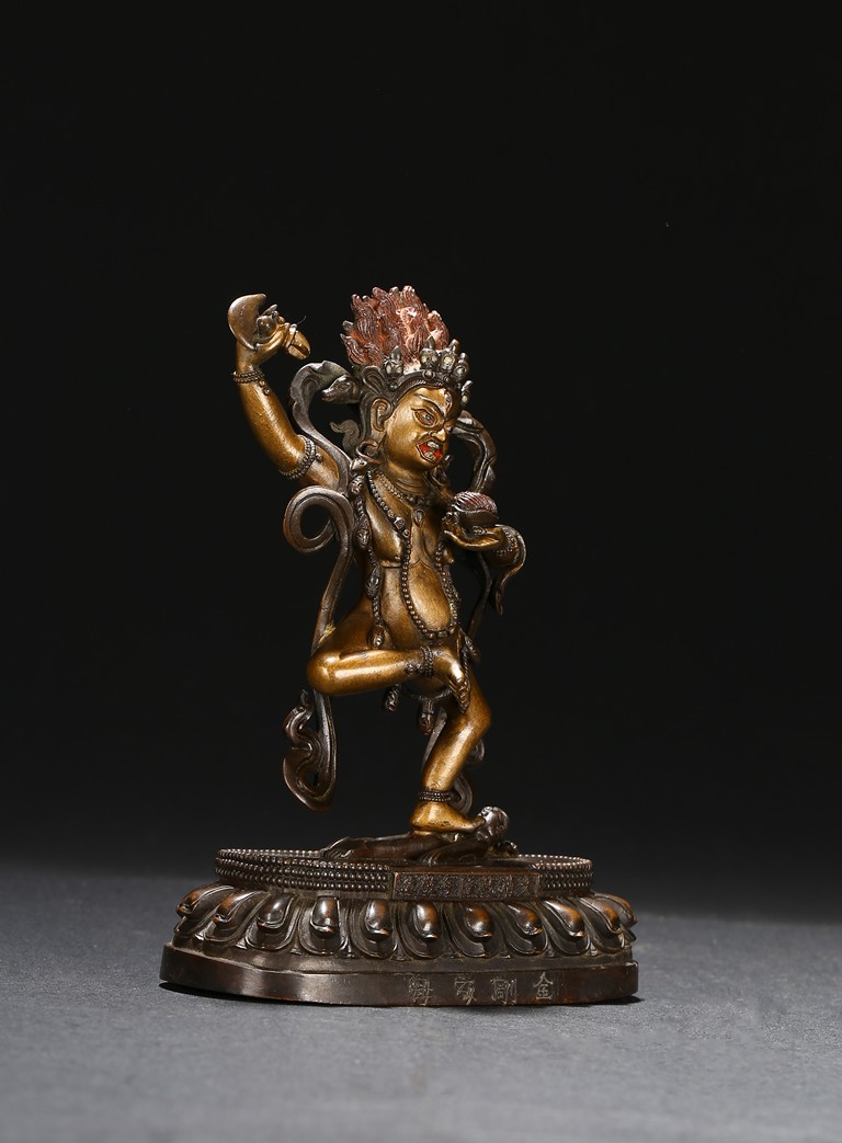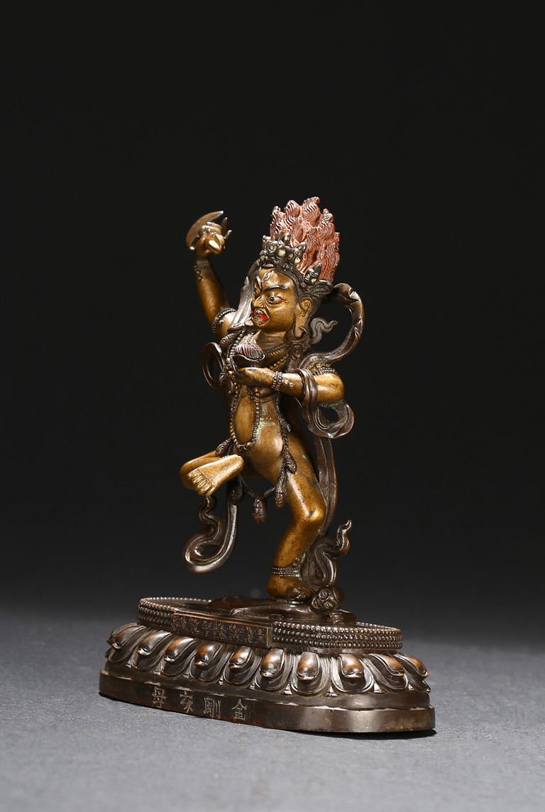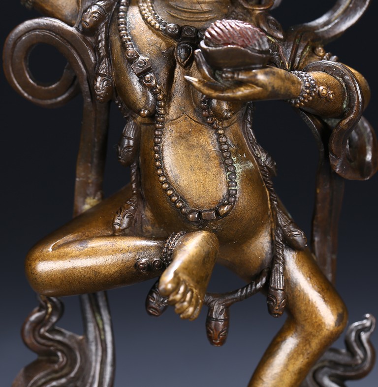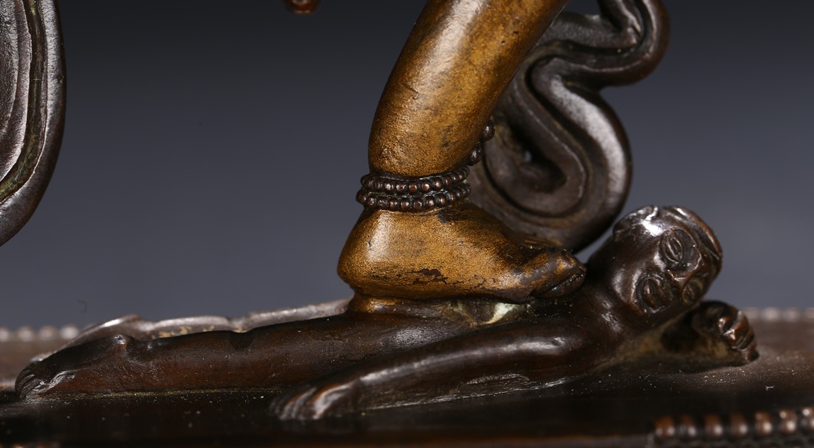 Expressively cast dancing on a prostrated figure over a round lotus base, brandishing the vajra and skull cup, wearing a garland, necklace and beaded sash securing the short dhoti, her braided hair gathered in a high chignon, base with marks. Qing Dynasty period.