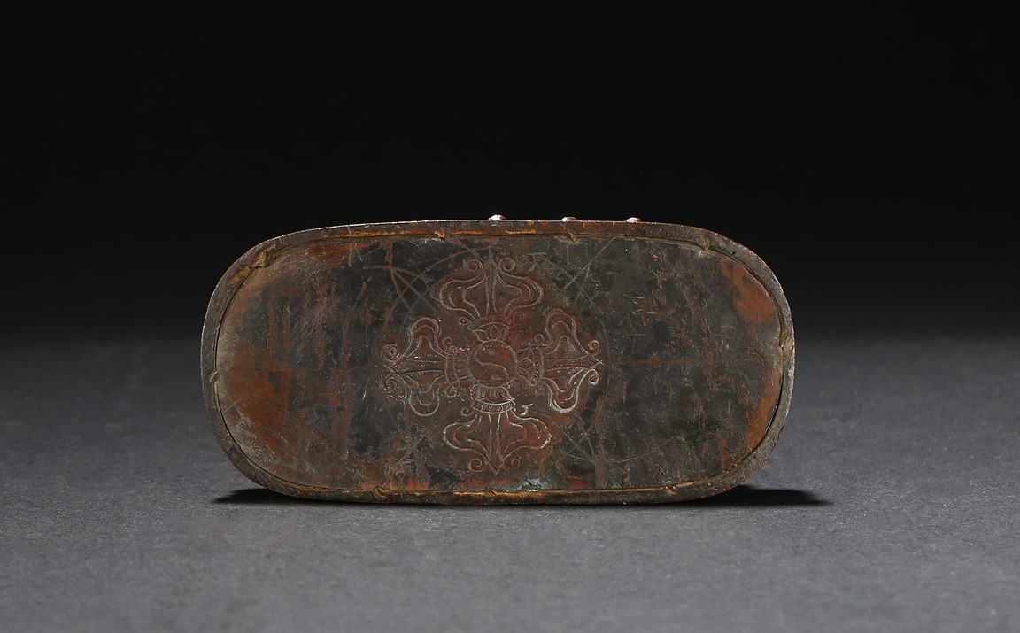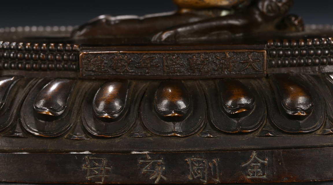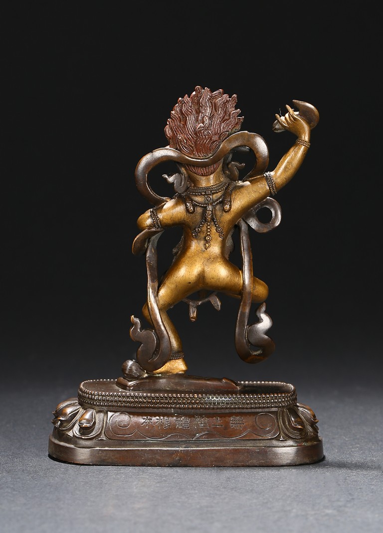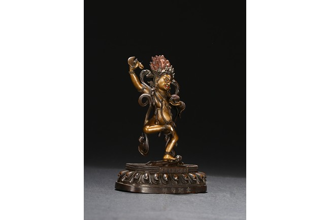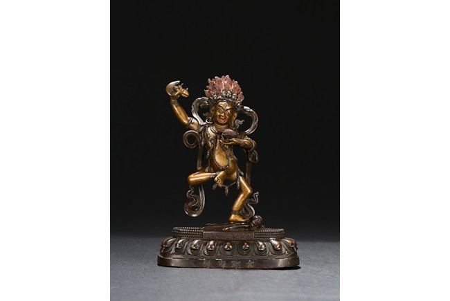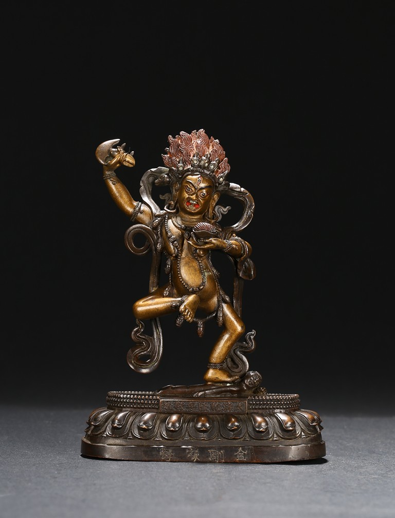 Expressively cast dancing on a prostrated figure over a round lotus base, brandishing the vajra and skull cup, wearing a garland, necklace and beaded sash securing the short dhoti, her braided hair gathered in a high chignon, base with marks. Qing Dynasty period.