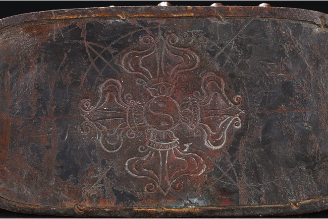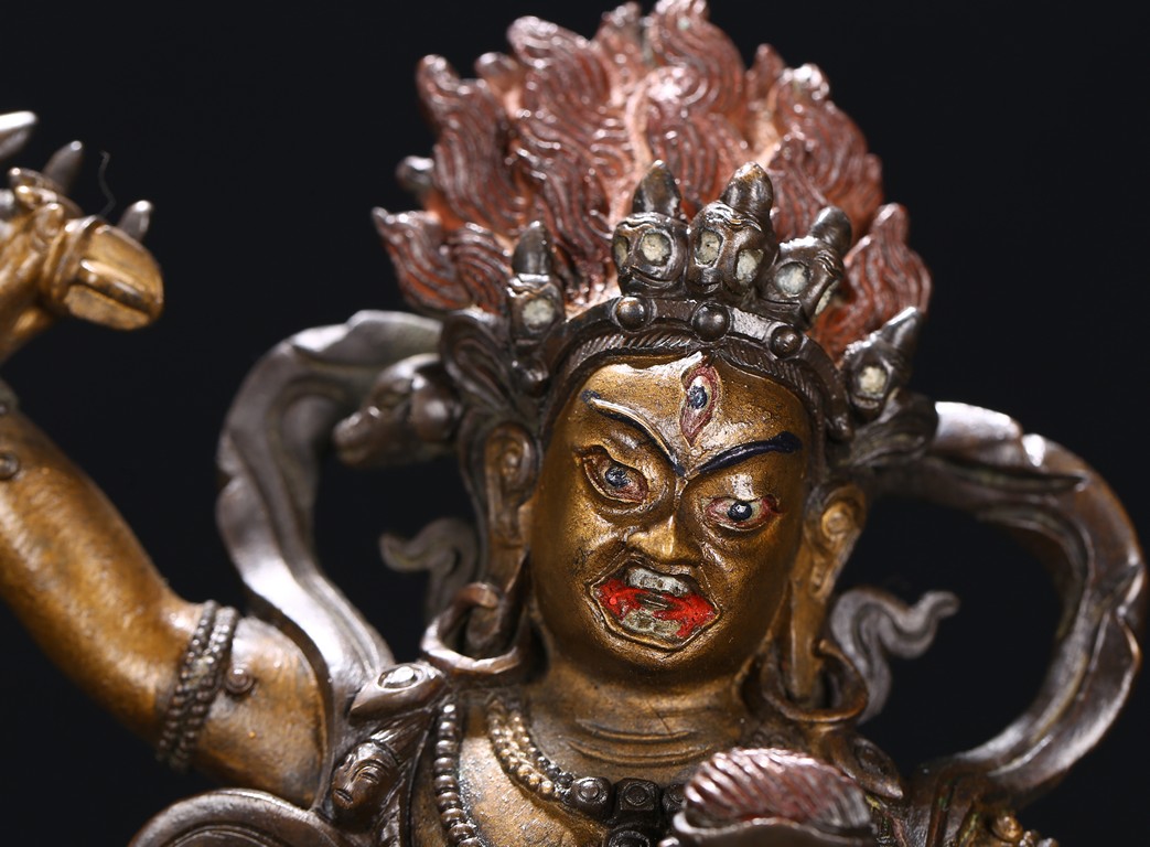 在藏傳佛教噶舉派中, 金剛亥母為女性本尊之首, 在格魯派中,她是三大本尊之一上樂金剛的明妃。此尊左腿單腿立於蓮花寶台之上,呈舞蹈姿,袒胸露乳,右手持鉞刀上舉,象徵清除人的一切愚昧,勾召真性智慧;左手應托盛滿鮮血的嘎巴拉碗,象徵她獲得了極樂的體驗,修證事業的成功。