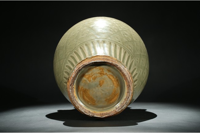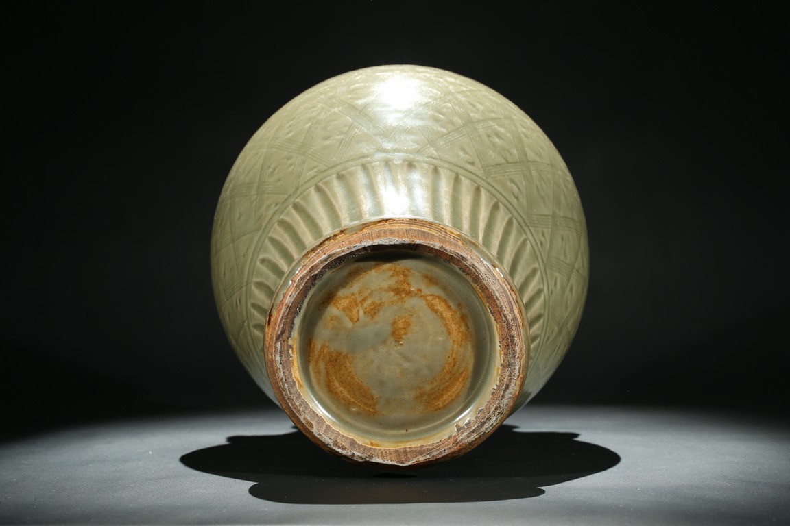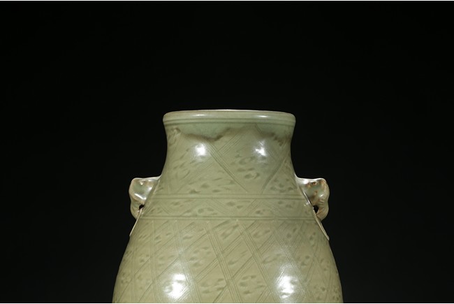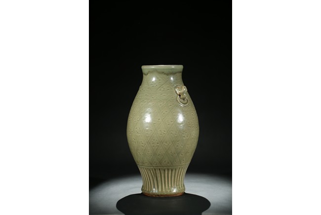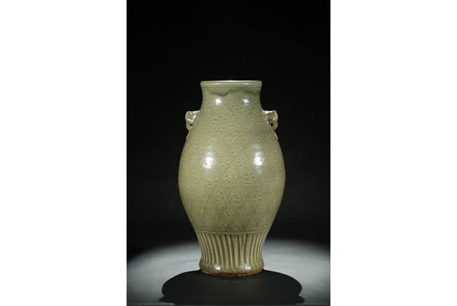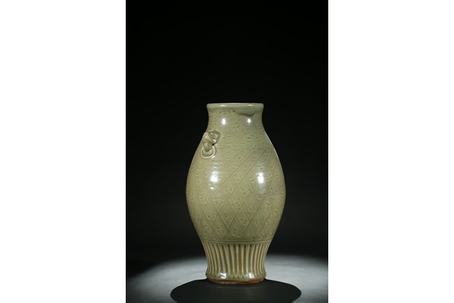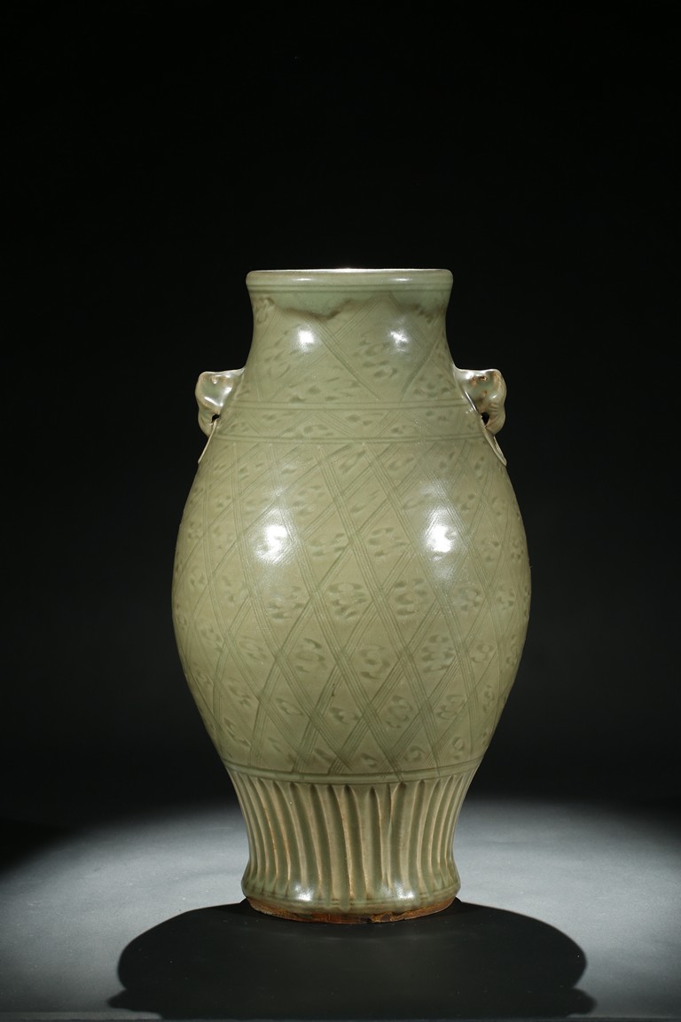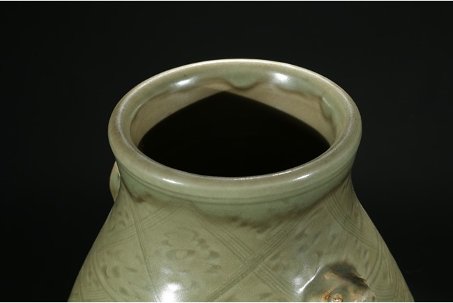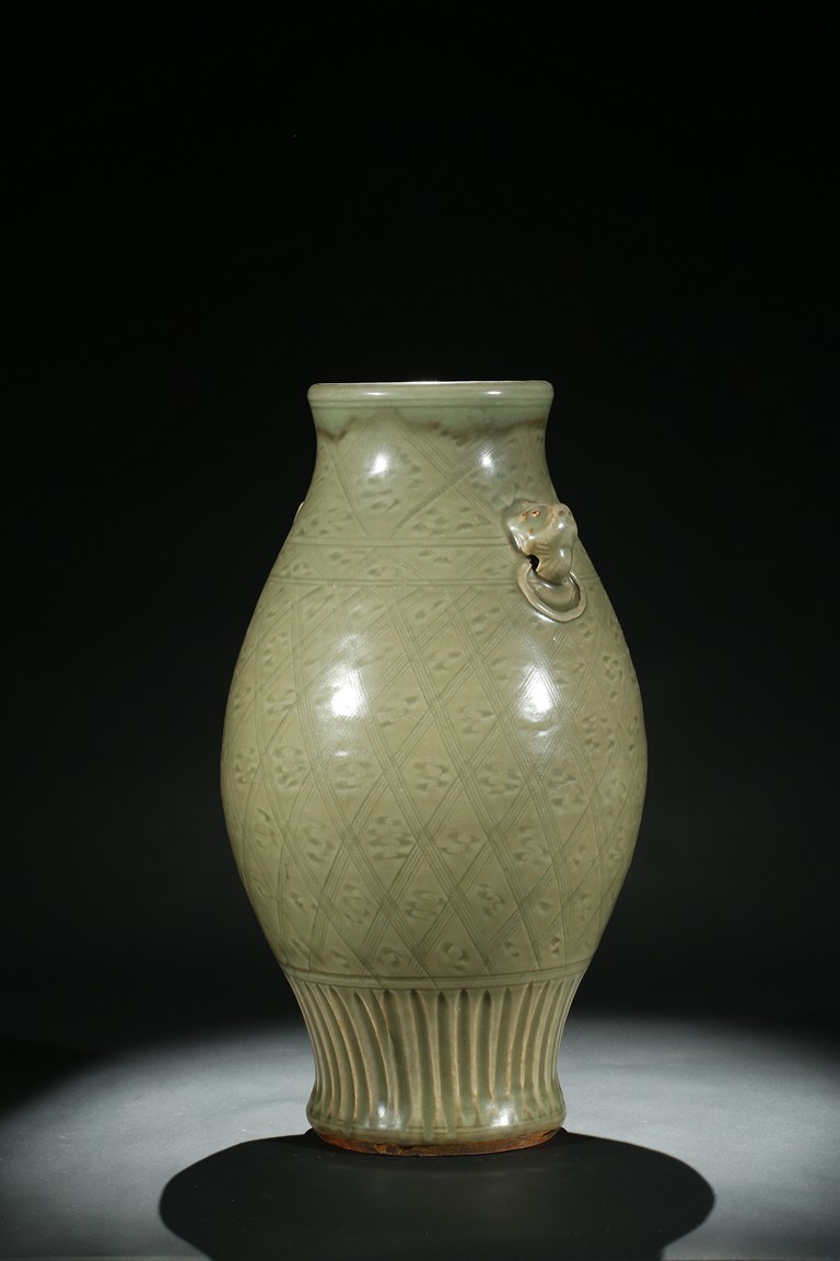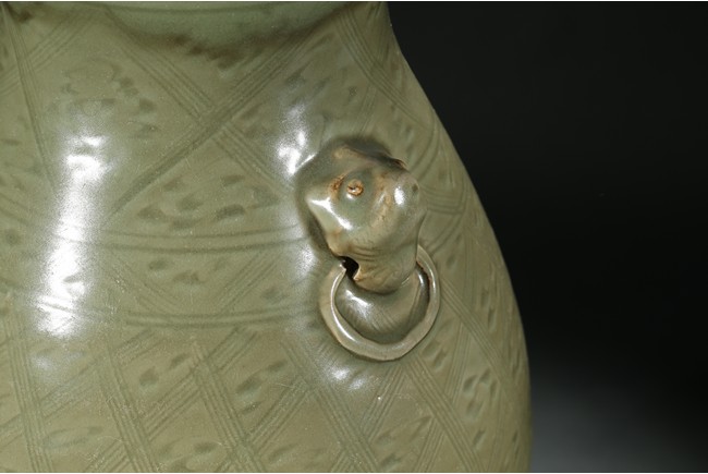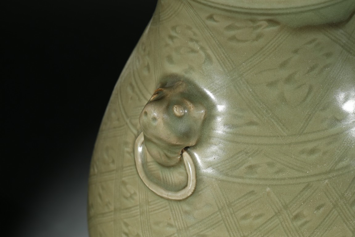 Of ovoid form, with rounded sides rising to a flared rim, the body overall decorated with geometric pattern, the neck flanked by two molded raised mythical beast handles suspending ring, all covered in attractive sea-green glaze. Song Dynasty period.