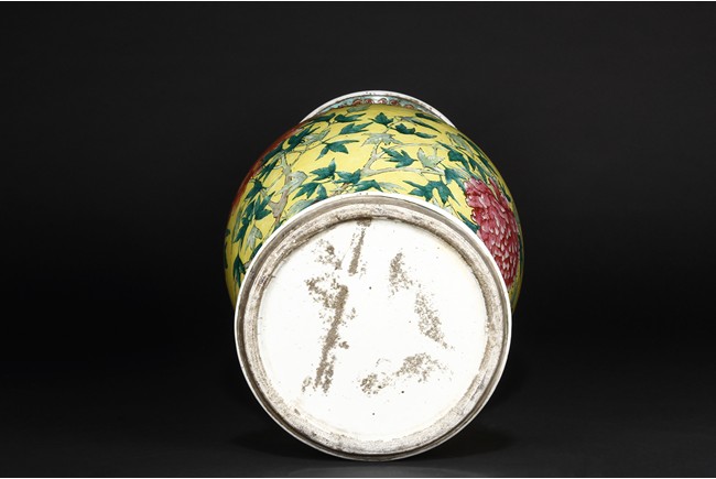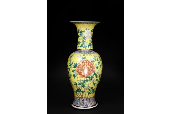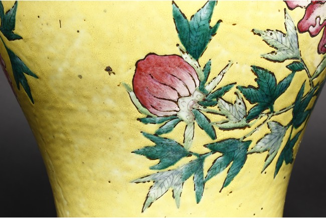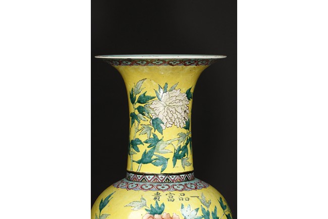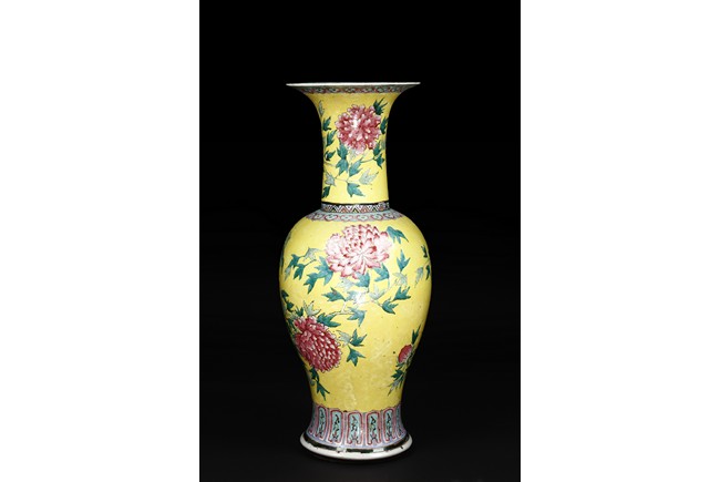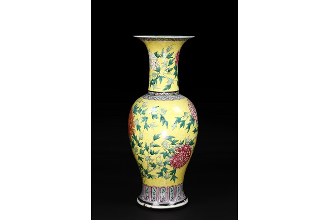 Of baluster form, the vase is brightly painted around the body with red, orange-glazed chrysanthemum flowers amongst leafy branches and four characters 'Yi Pin Fu Gui' all against yellow-glazed background. The long flaring neck is decorated in similar manner with chrysanthemum design. The neck and body are bordered between a key-fret and a ruyi-motif band. Qing Dynasty Period.