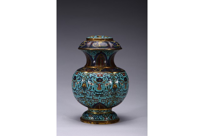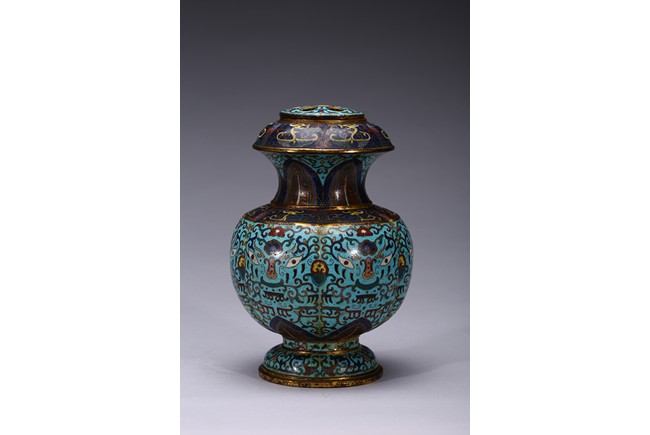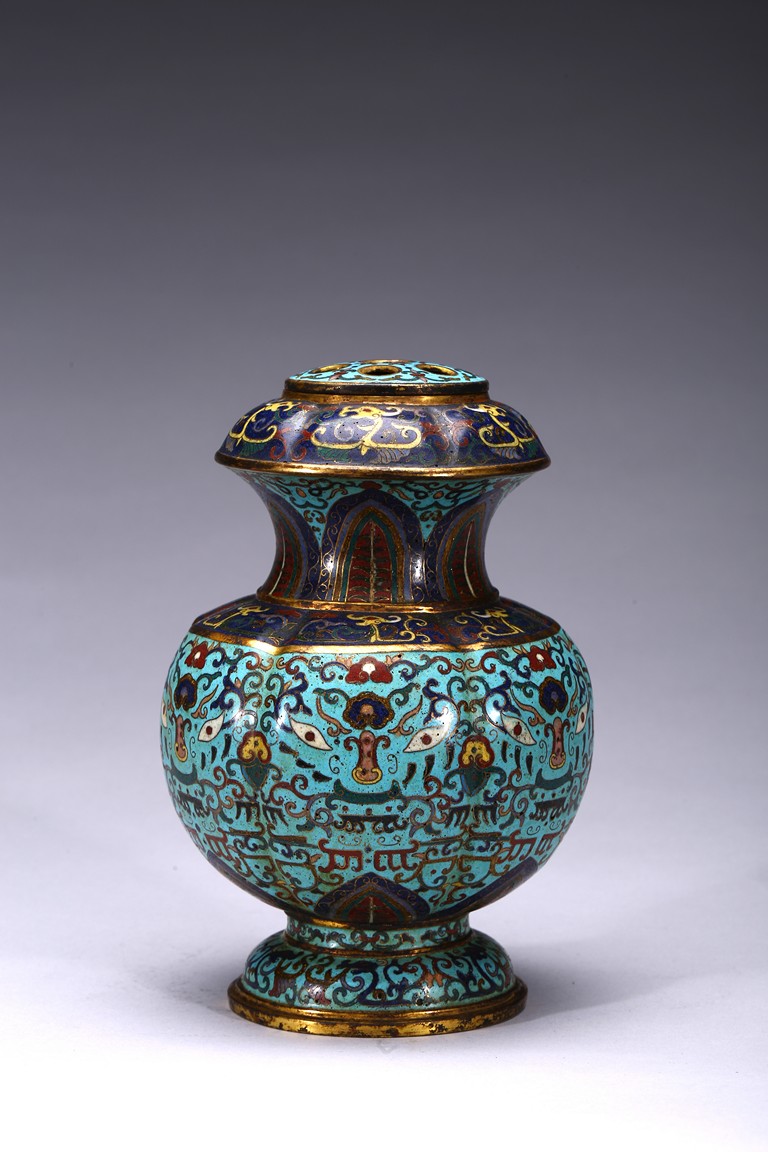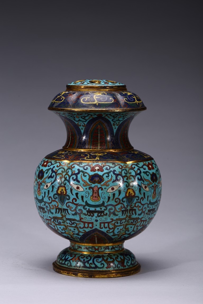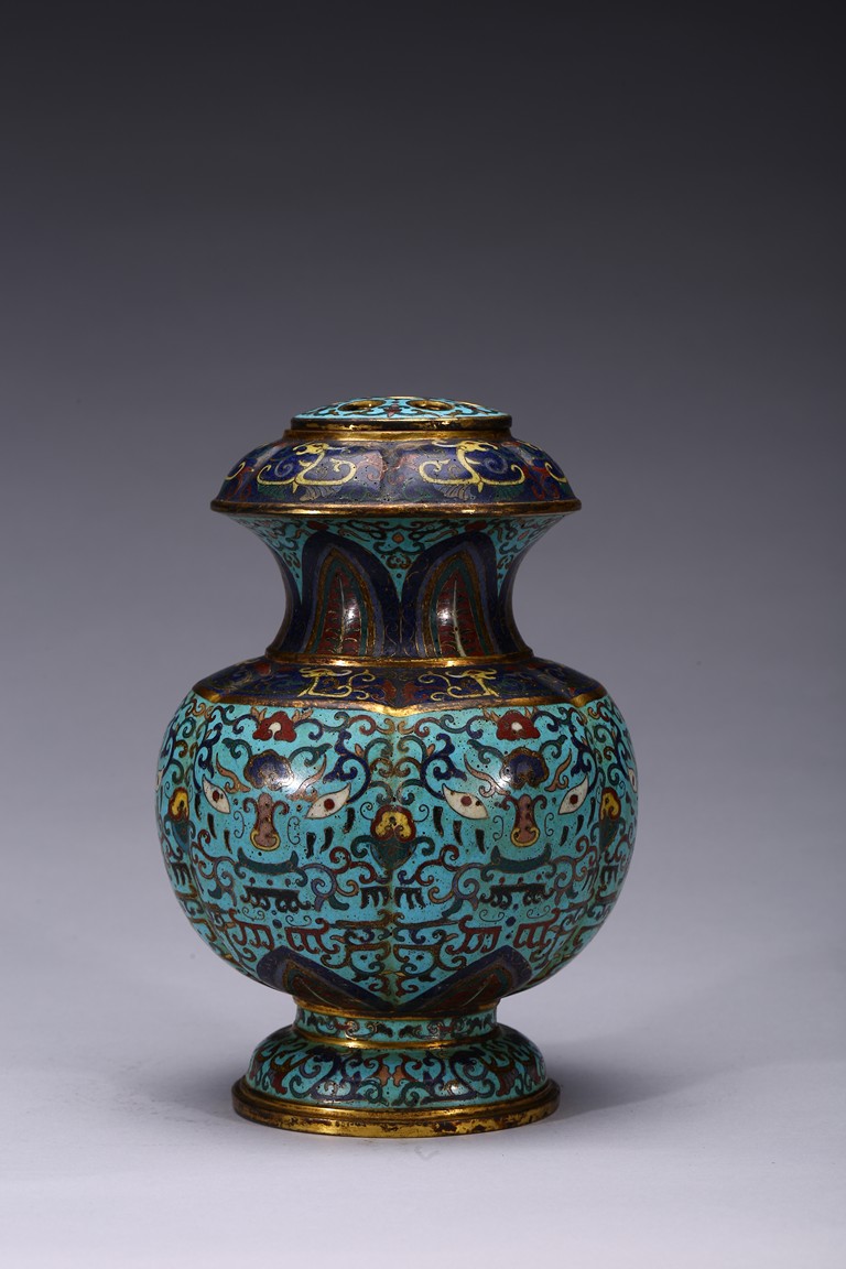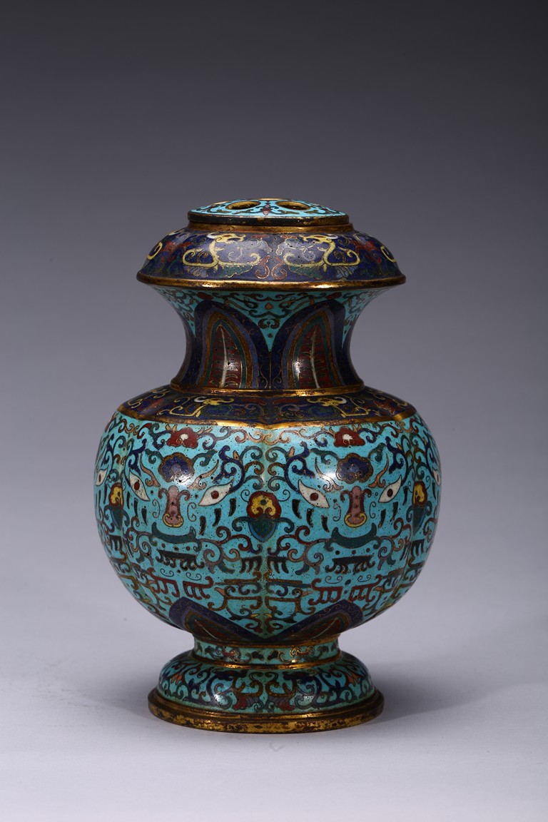 Of six-lobed form, the bulbous vase rising to waisted neck, the body enamelled with taotie mask on each lobe all reserved on turquoise-tone ground, the neck decorated with a band of leave lappet, the circular cover with five apertures as flower receptacle, the base enamelled with lotus floral scrolls. Early Qing Dynasty period.