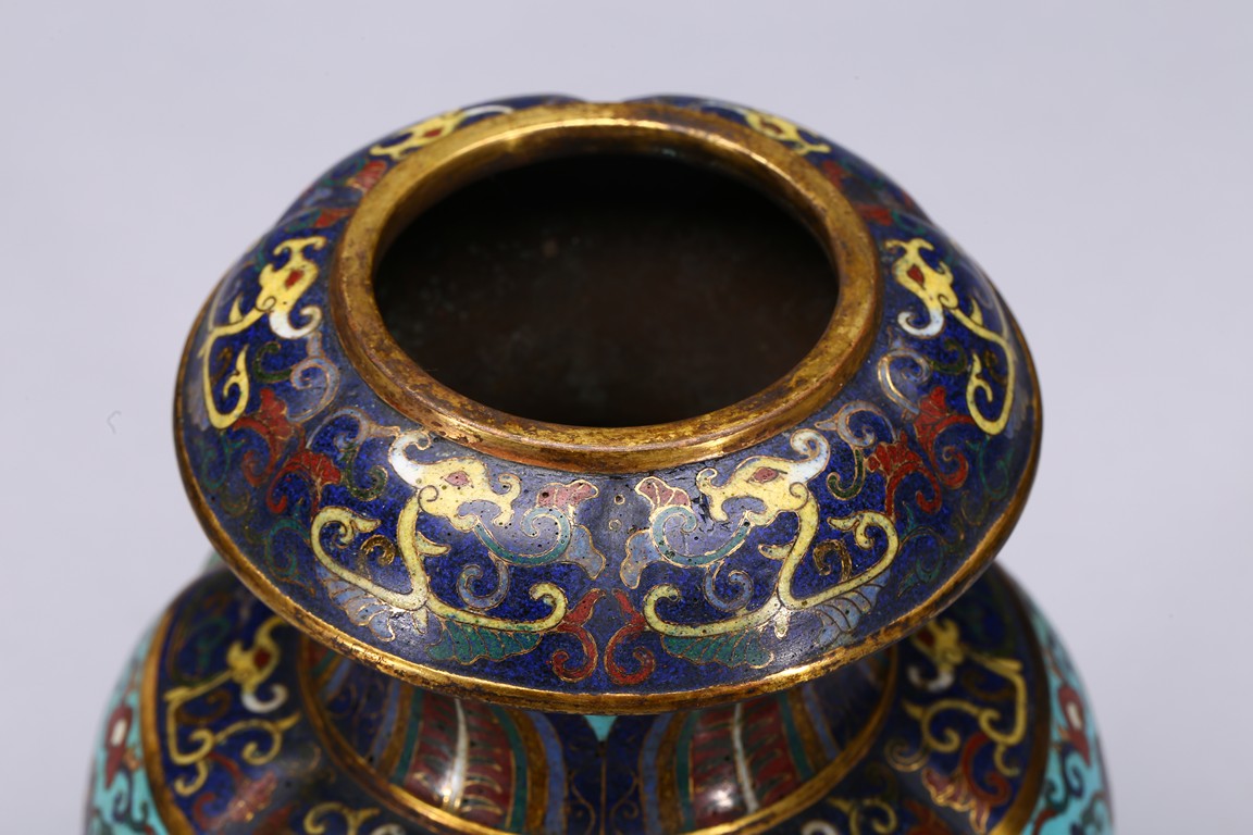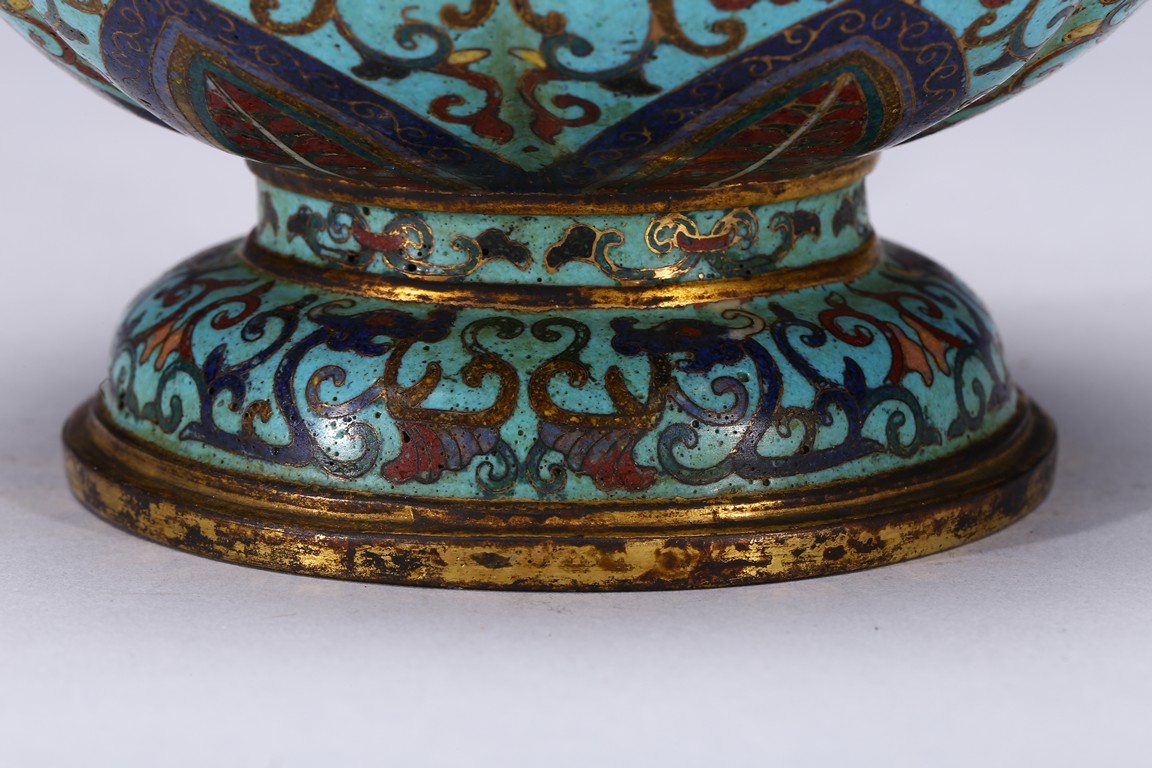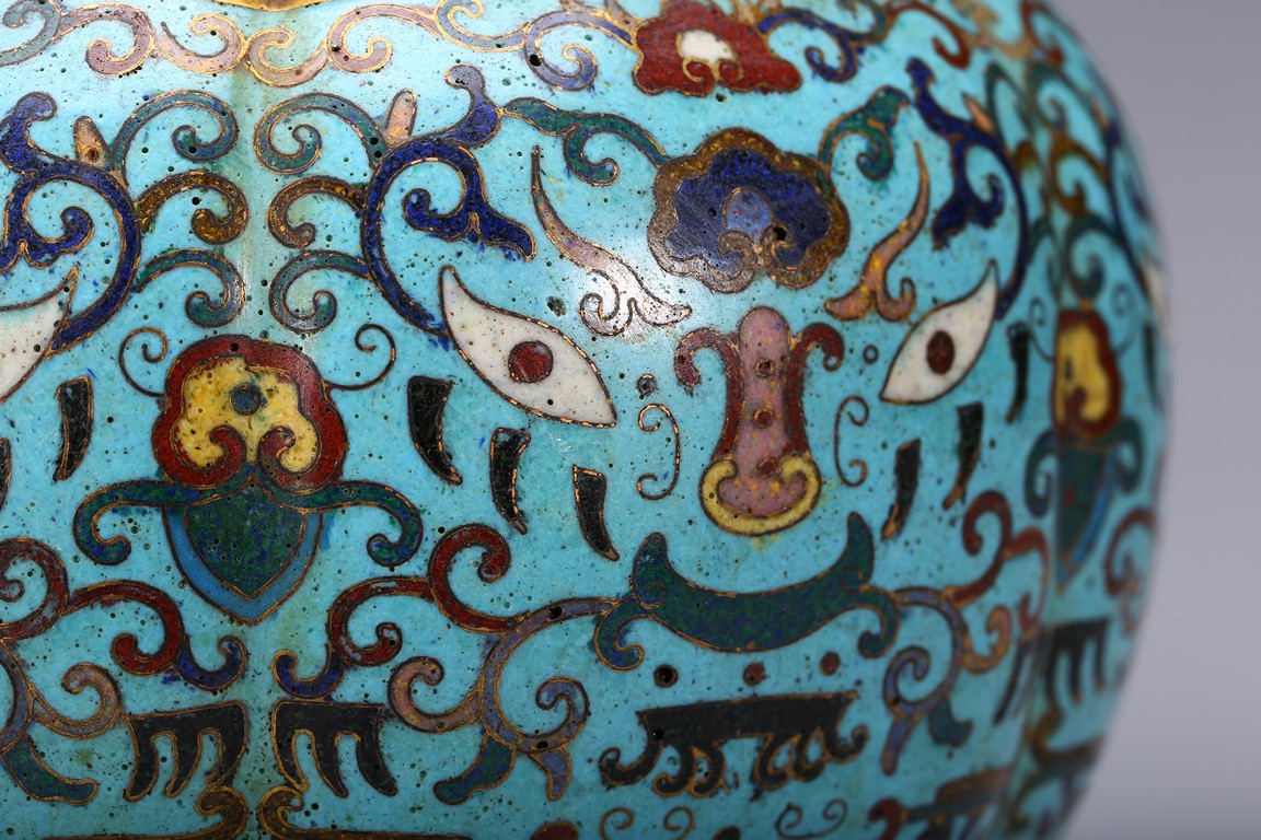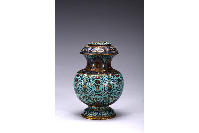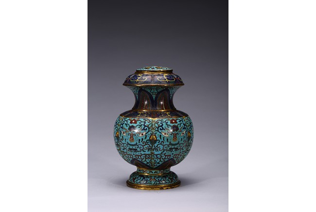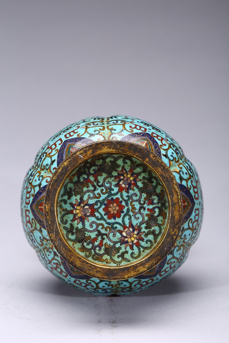 Of six-lobed form, the bulbous vase rising to waisted neck, the body enamelled with taotie mask on each lobe all reserved on turquoise-tone ground, the neck decorated with a band of leave lappet, the circular cover with five apertures as flower receptacle, the base enamelled with lotus floral scrolls. Early Qing Dynasty period.