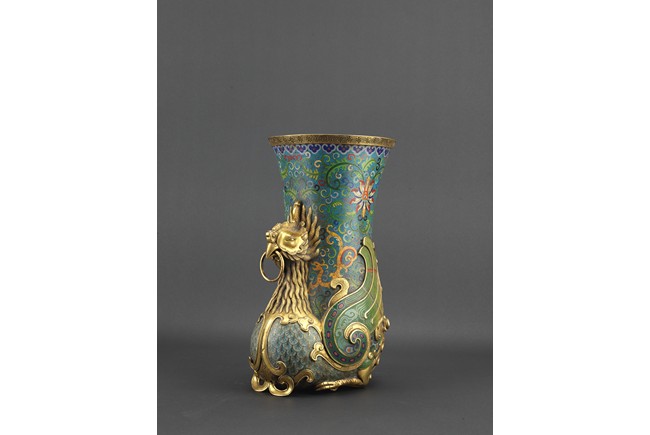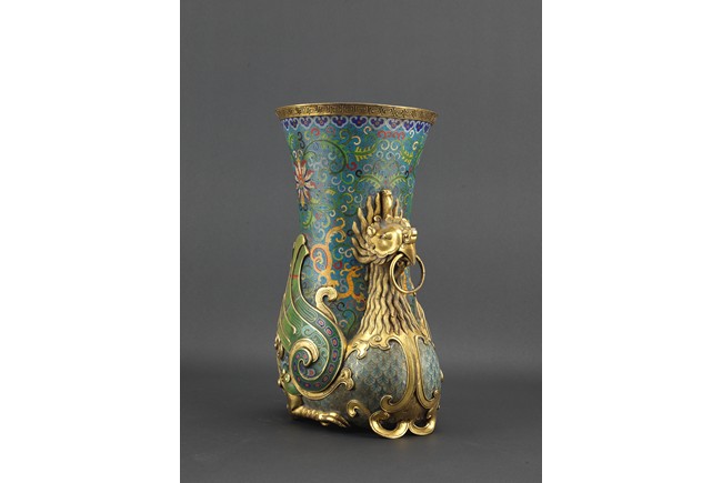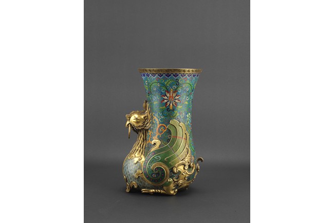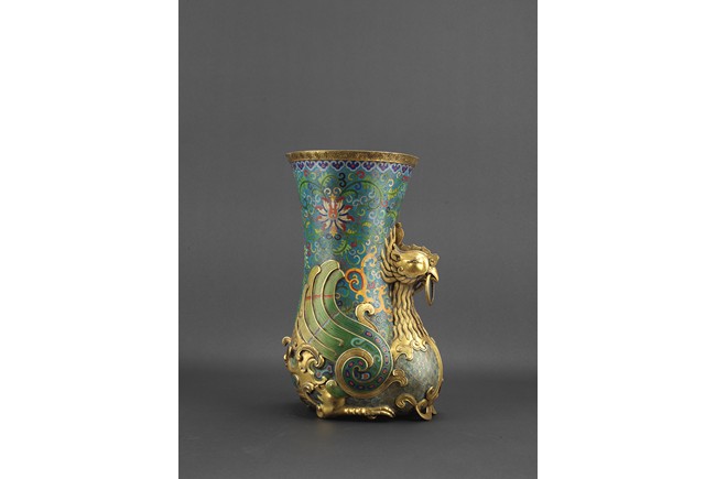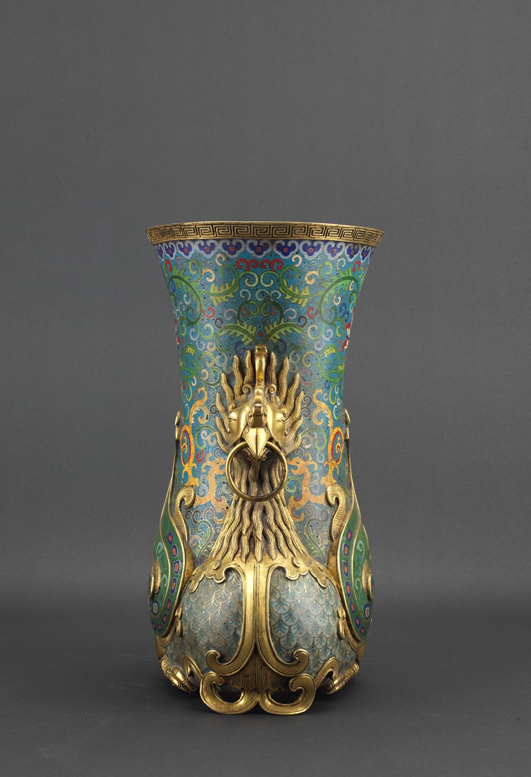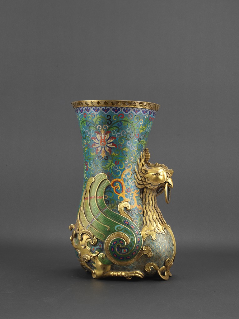 The vessel is cast in the shaped of a phoenix supporting a large flared vase, the vase exterior finely enamelled with dense lotus scrolls on turquoise green ground, the gilt bronze phoenix head with a loose ring in beak and wings enamelled in attractive green tone, the underside impressed with a four character Qianlong mark. Qing Dynasty period.