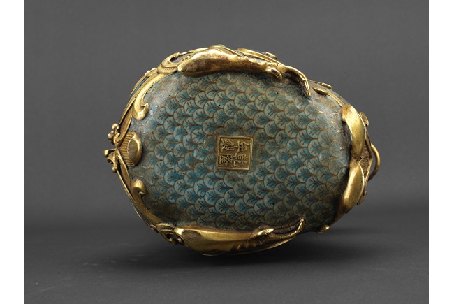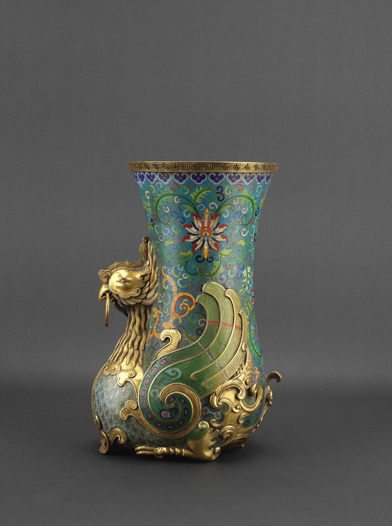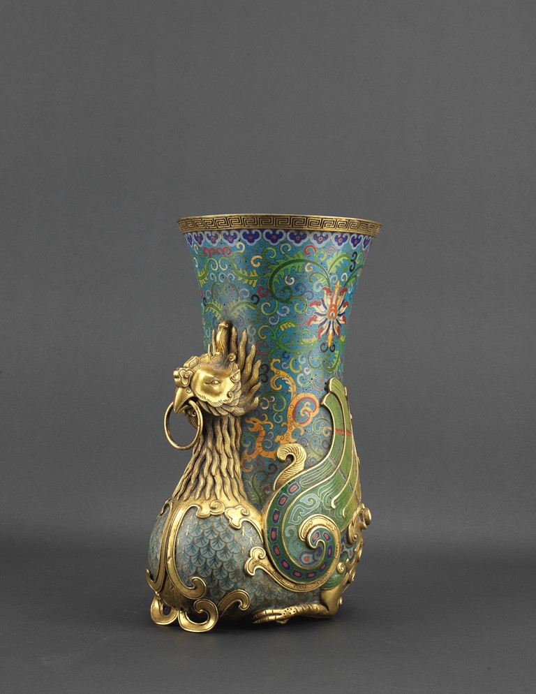 鳳凰是中國古代傳說中的百鳥之王,常用來象徵祥瑞,鳳凰齊飛,是吉祥和諧的象徵,自古就是中國文化的重要元素。中國對鳳鳥的崇拜自上古而始,商代以鳳鳥為圖騰,周代將其視作守護神。自秦漢以後,龍鳳逐漸成為帝王的象徵。此件掐絲琺瑯鳳鳥尊身形圓潤,以藍色琺瑯釉等為地,鳳首銜鎏金環,形象栩栩如生,背部及尾部浮雕出翅膀及尾羽,匠心獨具。背開一圓槽,裝連橢圓形尊,作卷尾立式。整件器形端莊雅緻,莊重之感呼之欲出。掐絲細緻,各式琺瑯色澤純正,高貴典雅,十分難得。底部款“乾隆年制”。