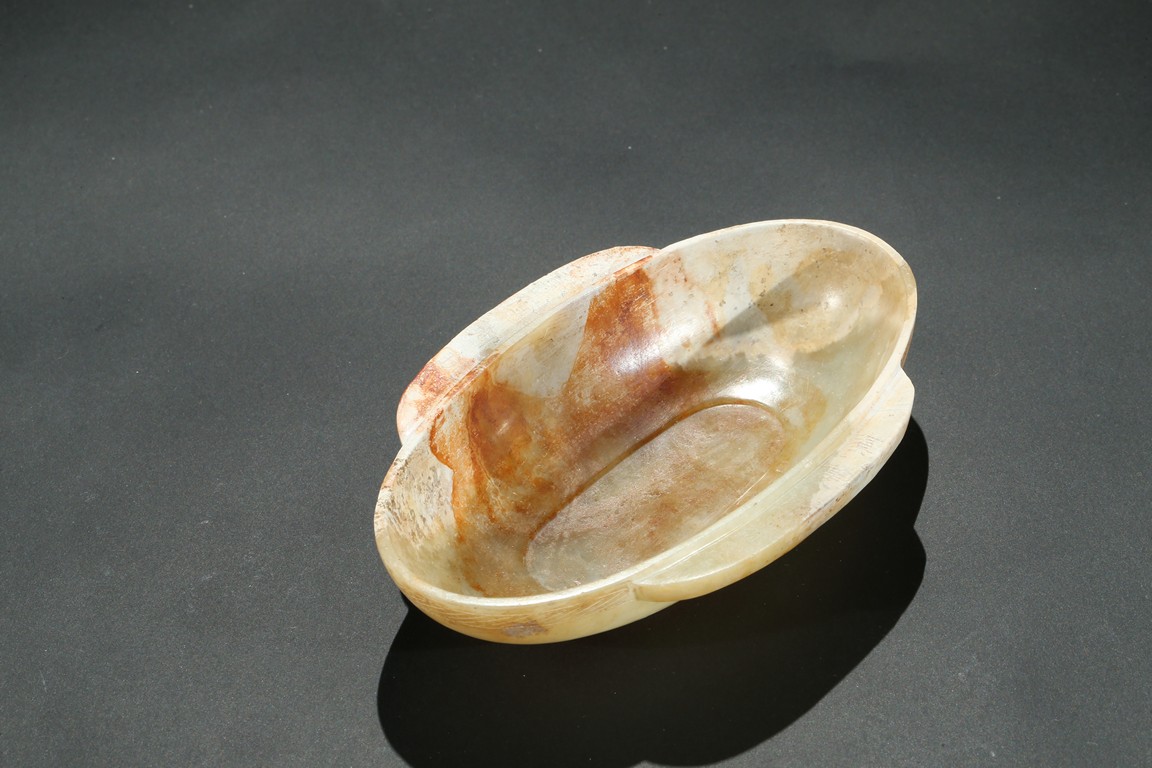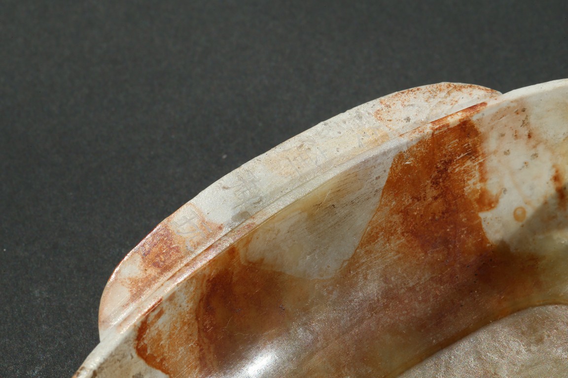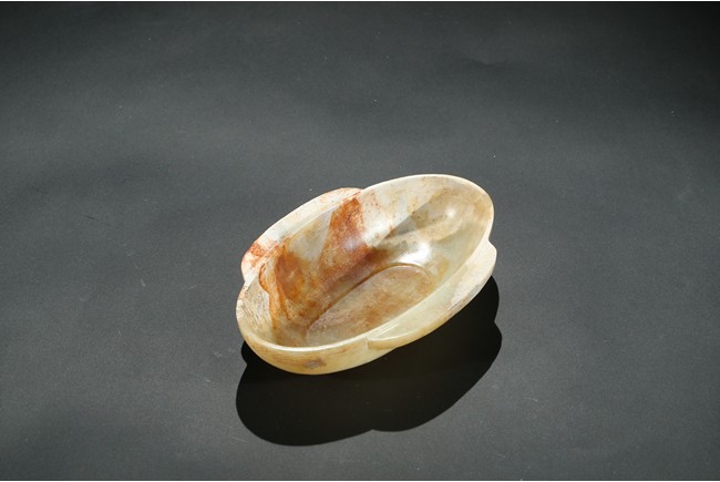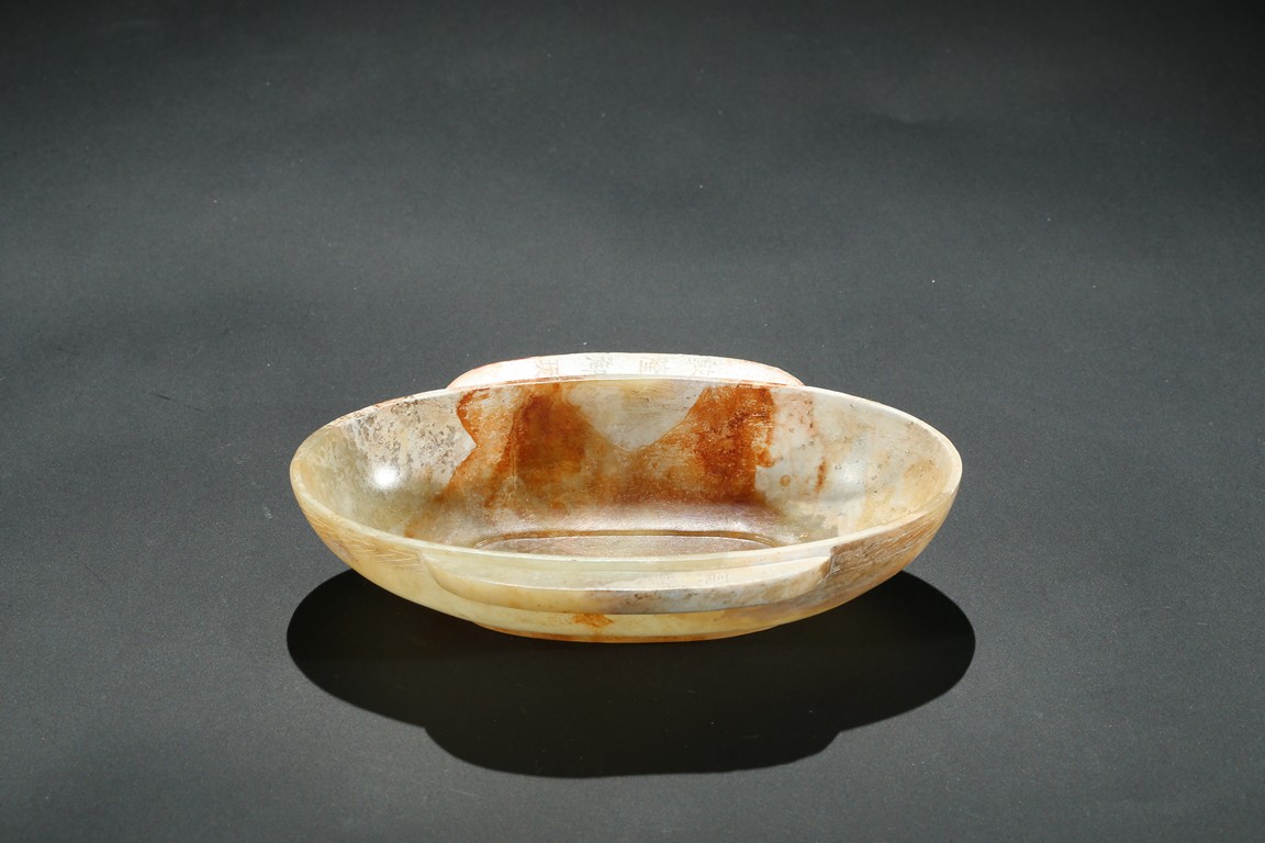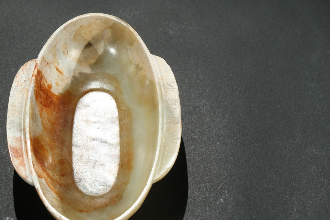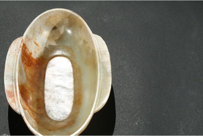The shallow oval-shaped bowl rising from a short foot, flanked by a pair of elongated ‘C’-shaped ‘ear’ handles with later inscriptions extending just below the mouthrim. Han Dynasty period.