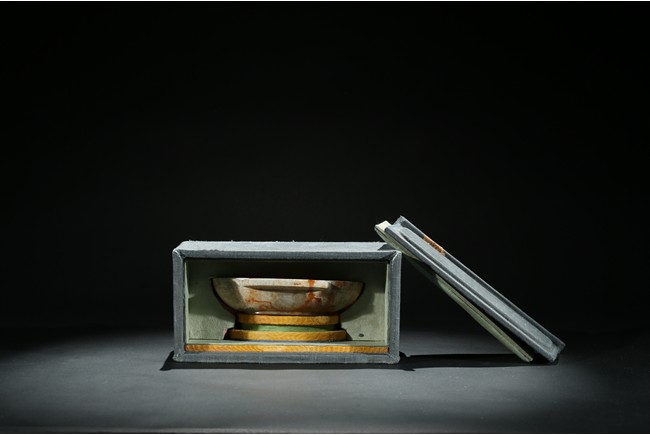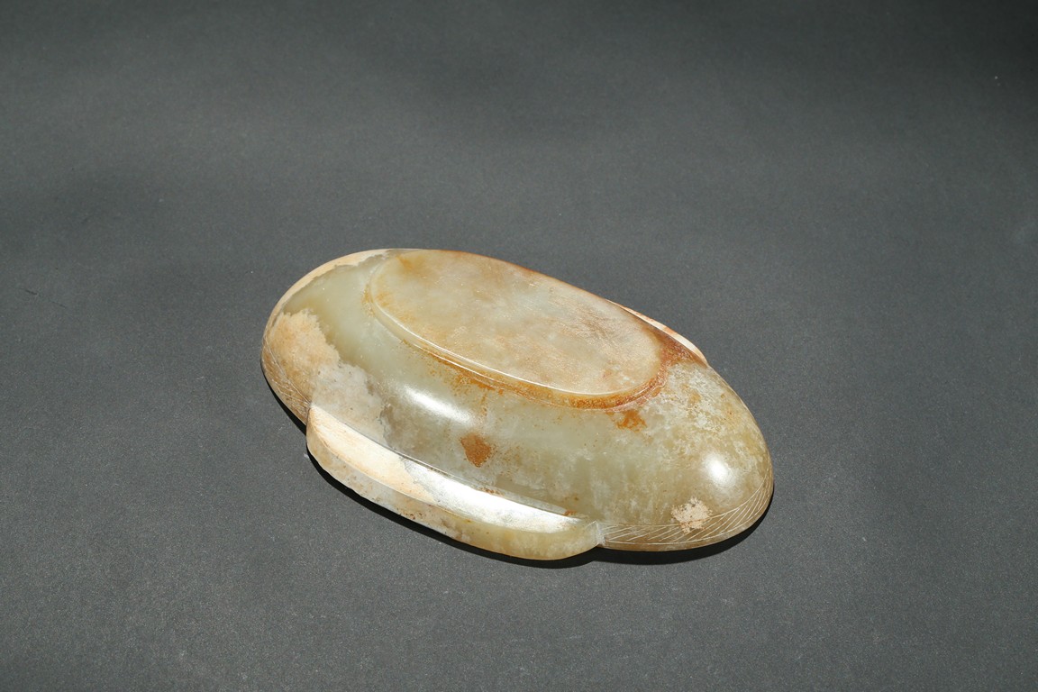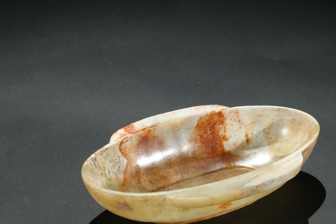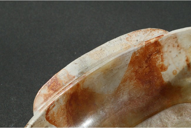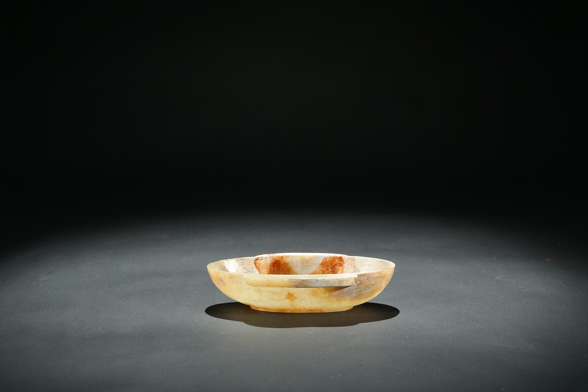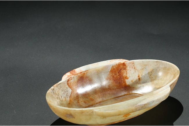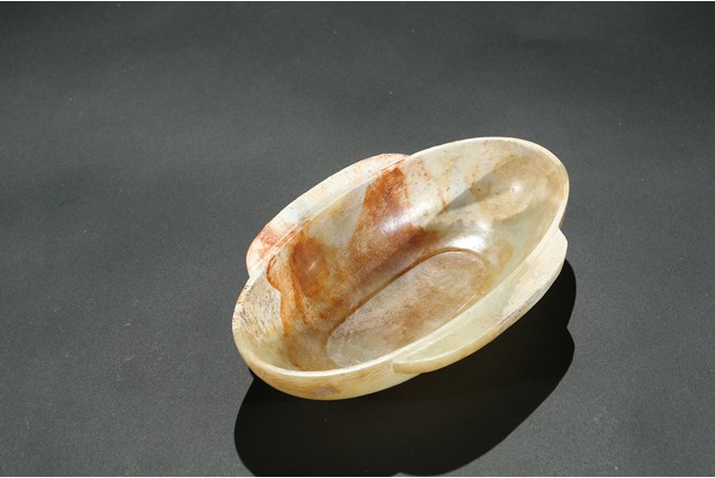 The shallow oval-shaped bowl rising from a short foot, flanked by a pair of elongated ‘C’-shaped ‘ear’ handles with later inscriptions extending just below the mouthrim. Han Dynasty period.