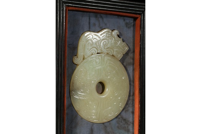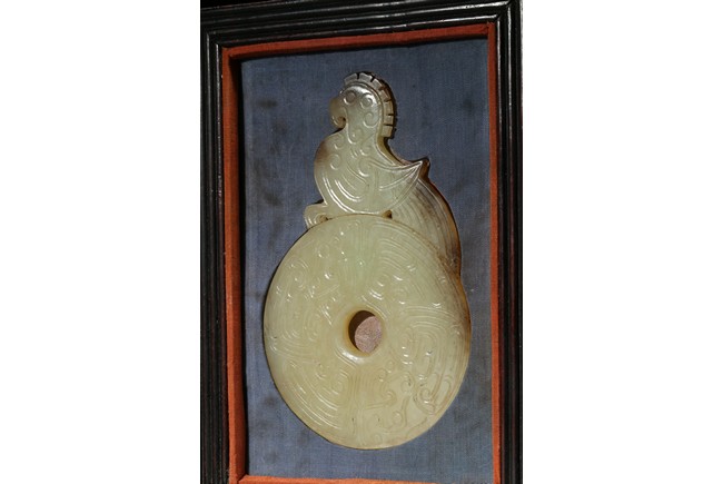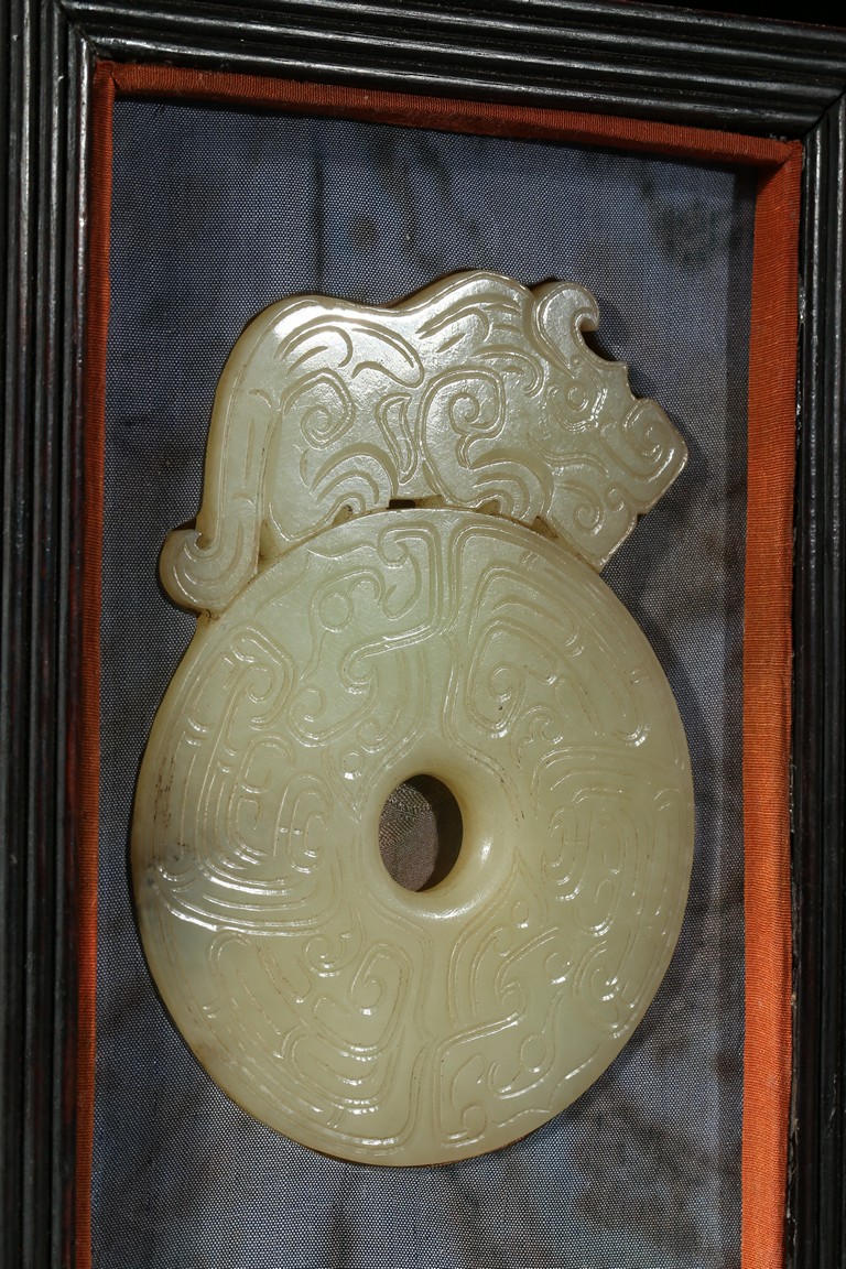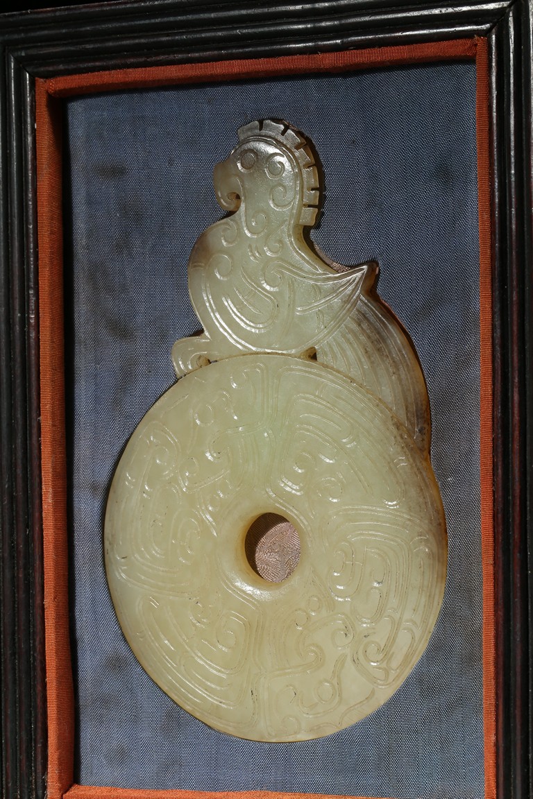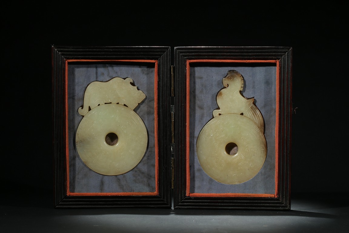 Comprising of two disc bi well incised on both sides with archaistic scroll pattern, each set to one side with a phoenix head and a mythical beast head respectively, accompanied with a fitted rosewood box. Qing Dynasty period.