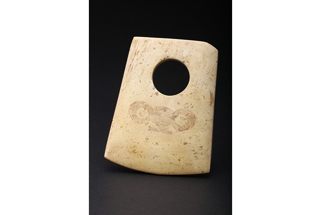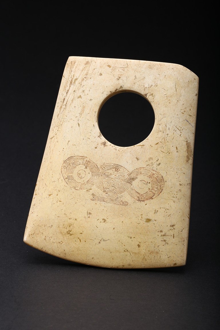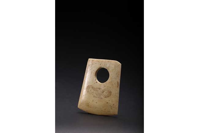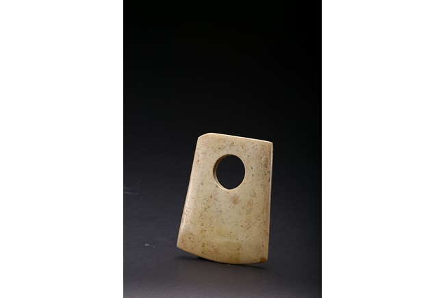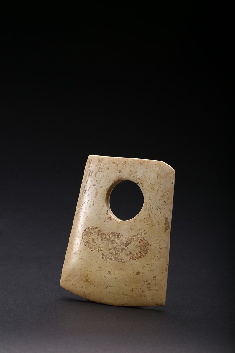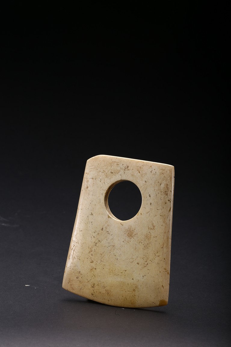 The blade with gently bevelled edges, pierced through with a large apertures, finely incised with a mythical taotie mask below, the calcified opaque stone of white beige tone. Shang Dynasty period.