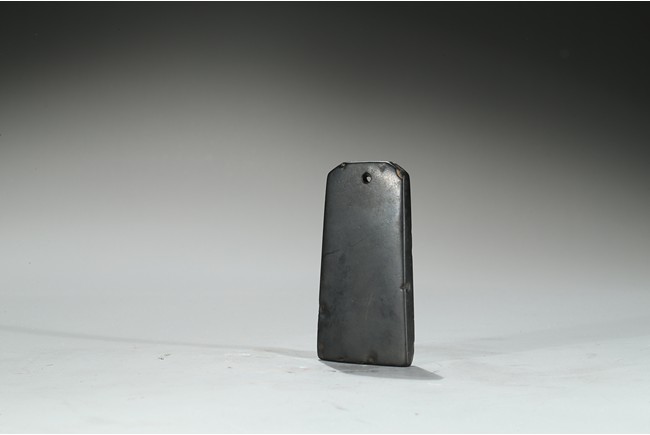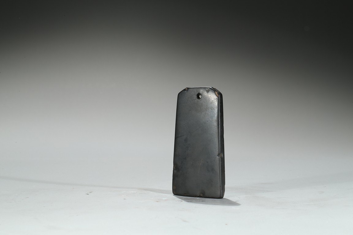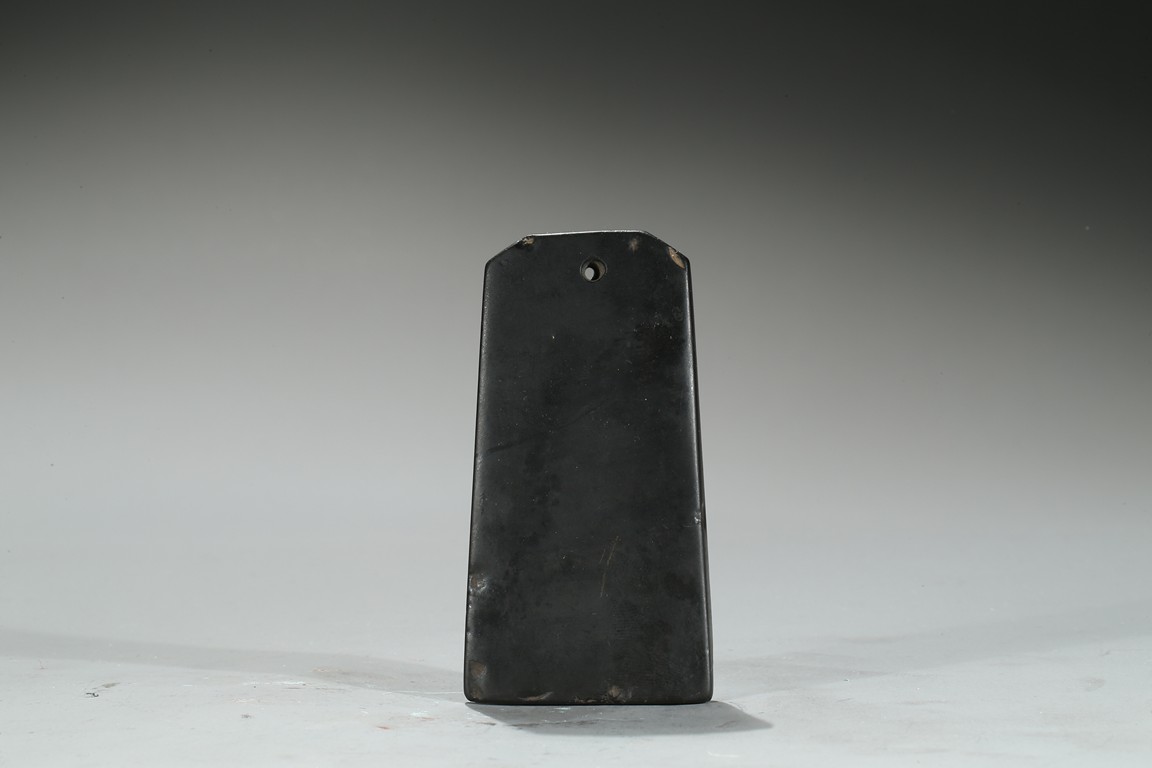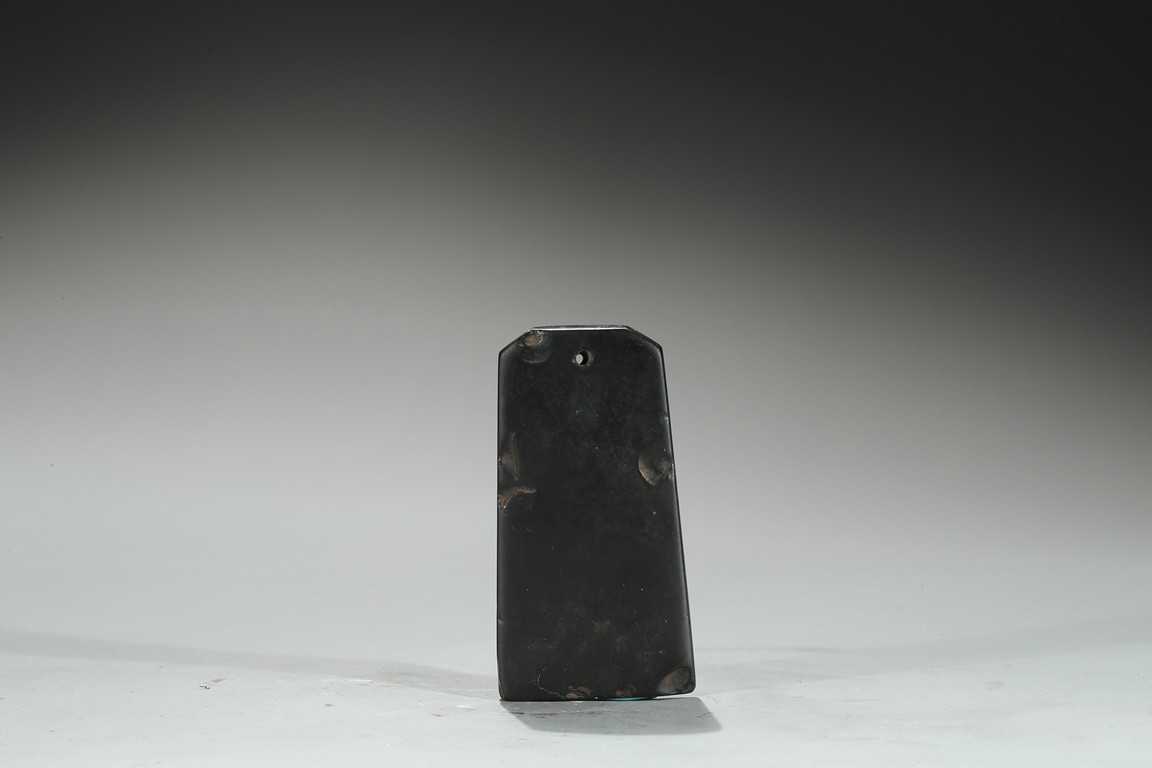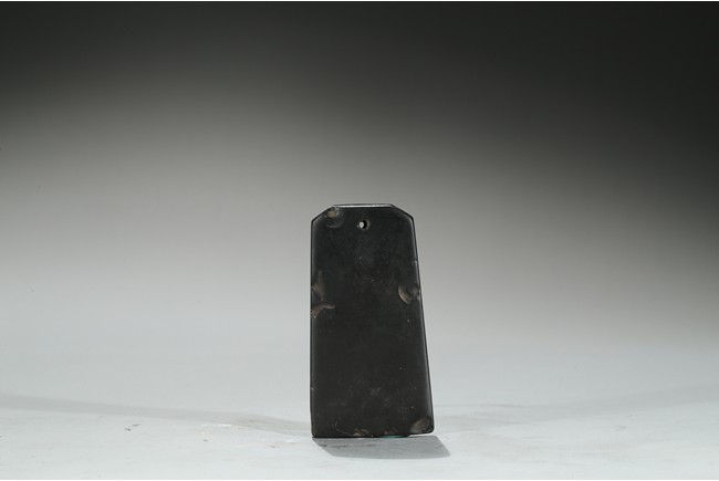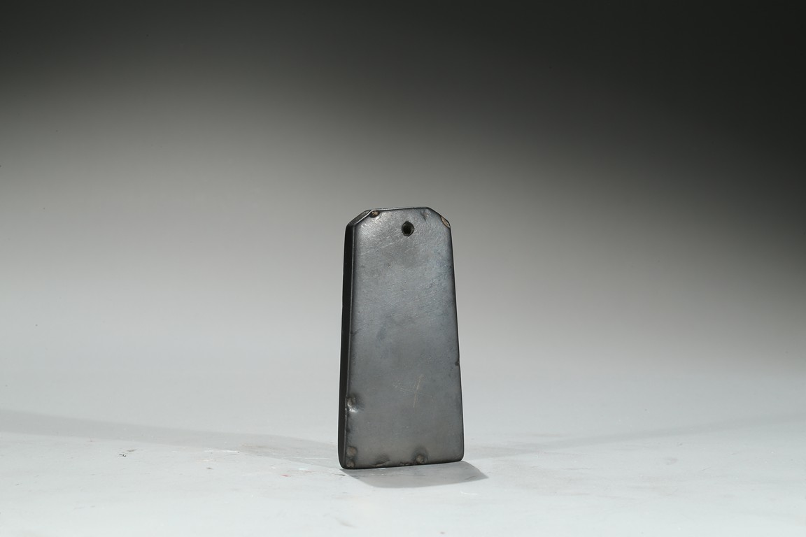 Of flattened trapezoidal form with a pierced aperture to one end. The stone is of opaque pure black color. Shang Dynasty period.