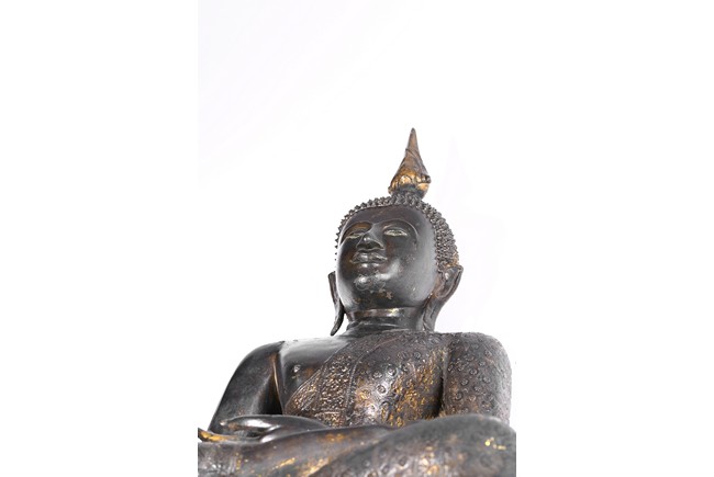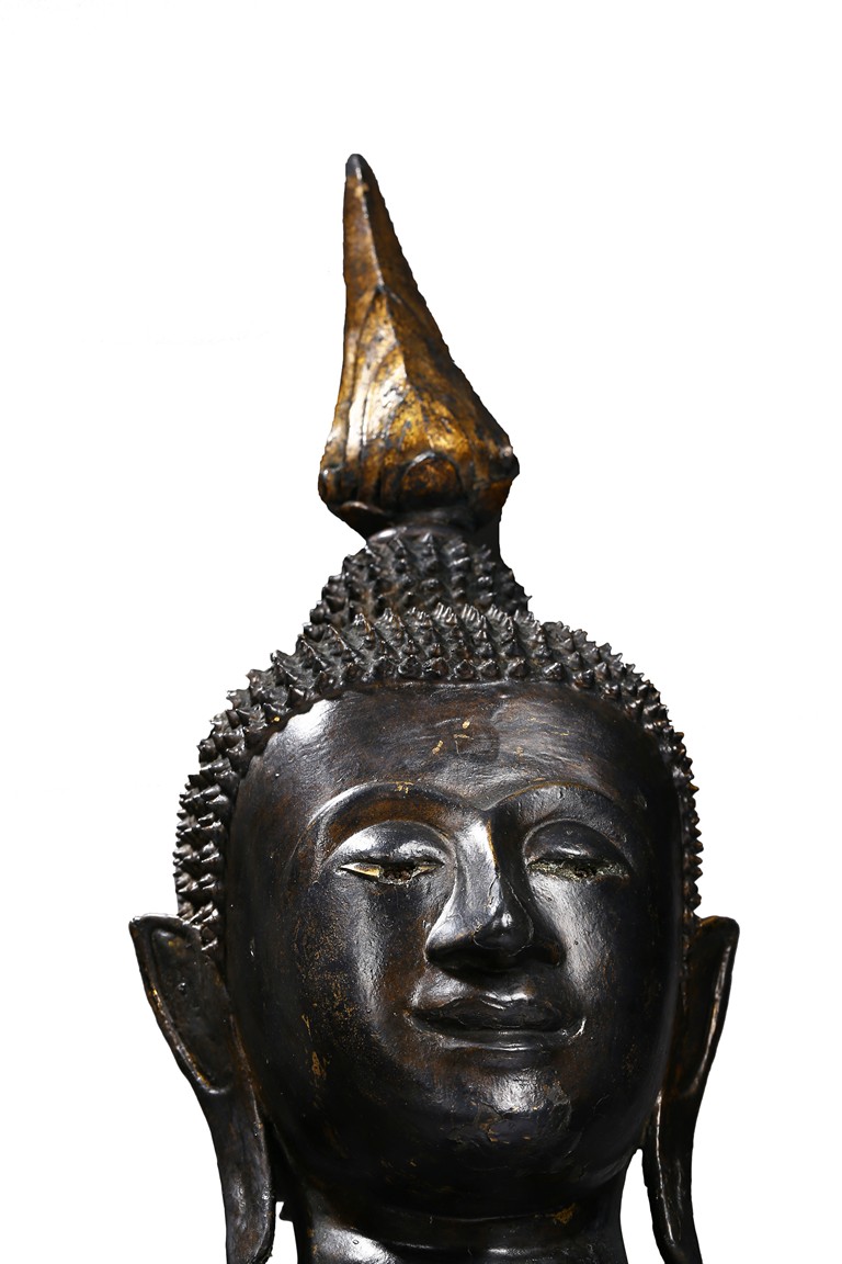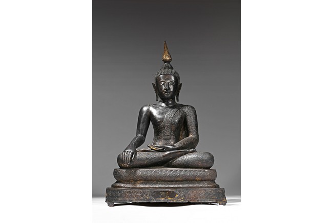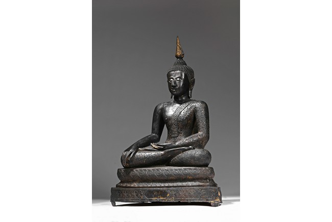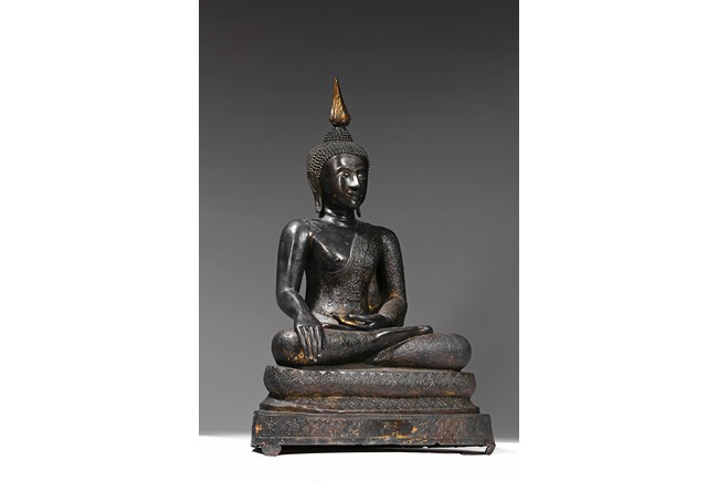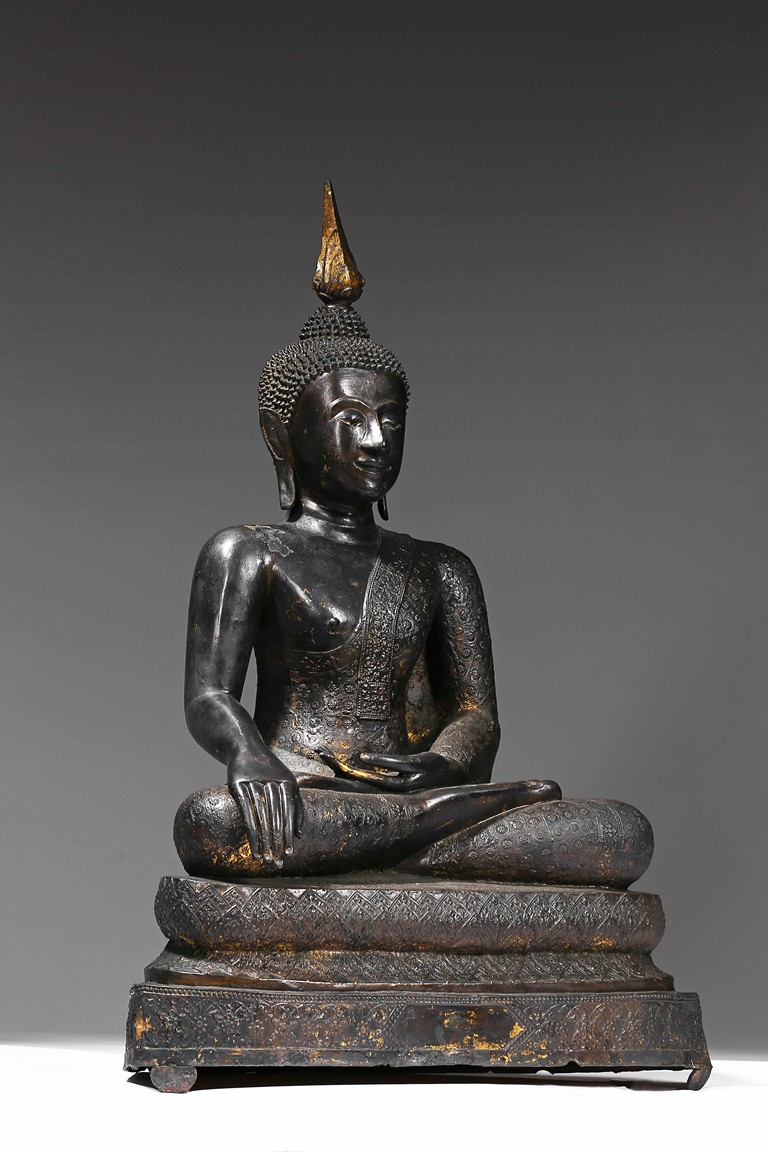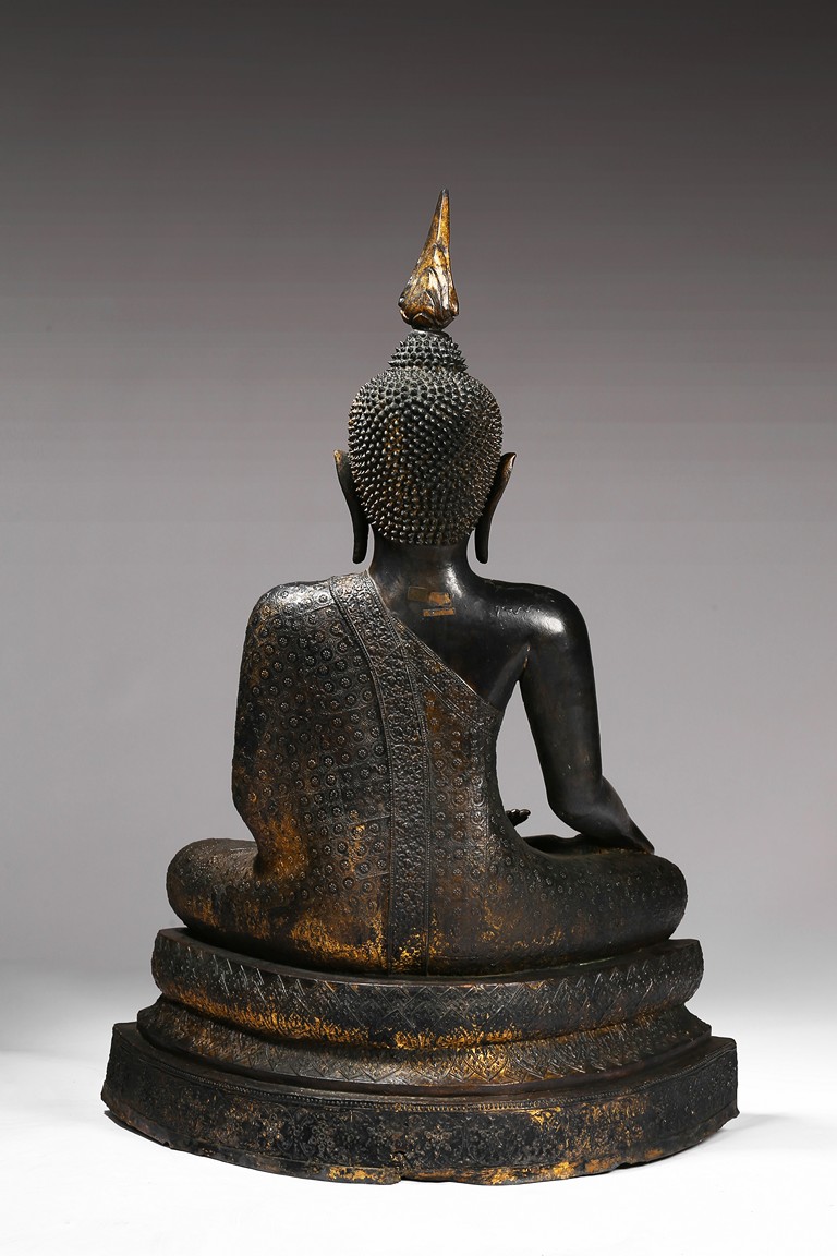 The Buddha is depicted seated on a elegantly stepped throne, his right hand placed in bhumisparsha, the 'earth-touching' gesture, his monastic robes covering one shoulder, the face with a meditative expression and the hair rising to form an ushnisha topped with a jar-shaped finial, body overall with traces of gilt. Thailand. 14th century.