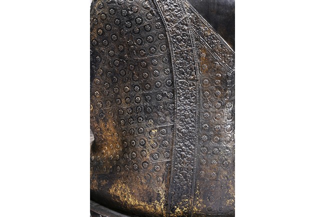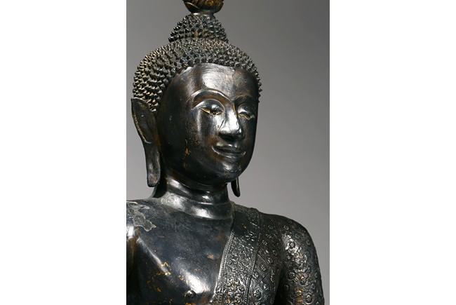 此尊16世紀釋迦摩尼坐像,品相完好,銅鑄局部鎏金。釋迦摩尼佛飾螺髮髻,頭頂塔型肉髻高隆,髻頂。面相橢圓,雙耳彎曲,眉如初月,雙目微張,低垂下視,嘴角上揚,略帶笑意,神態怡然。軀體勻稱,端莊大方,身著袈裟,上嵌繁密花紋,華麗非常。衣紋起伏凸顯,轉折流暢自然,古樸生動,具有極高的藝術和歷史價值。