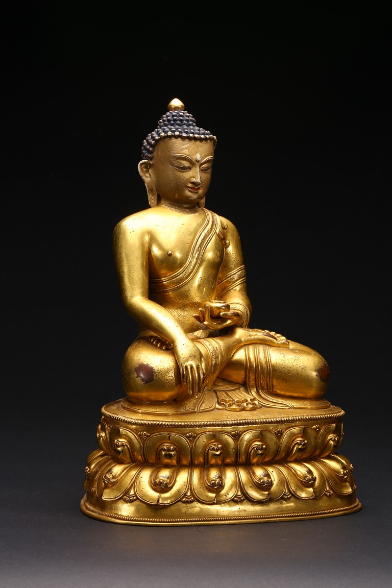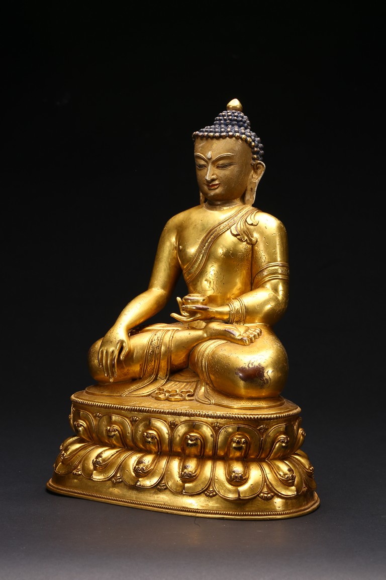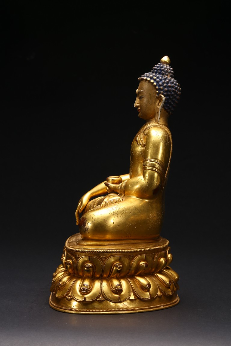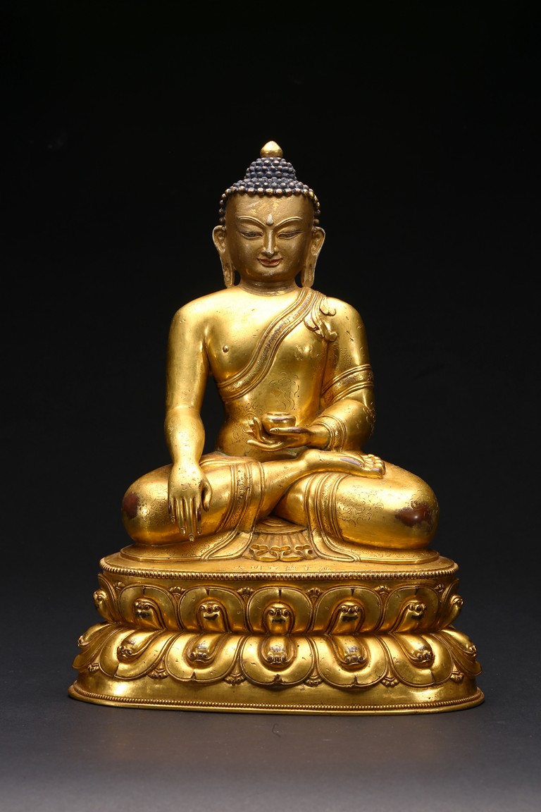 The bodhisattva is shown seated upon a double lotus throne in dhyanasana, the left hand holding alms bowl , wearing dhoti with incised hemt, the cold gilded face with benevolent expression and topped tall ushnisha, the base with a later inscription Yongle mark. Qing Dynasty period.