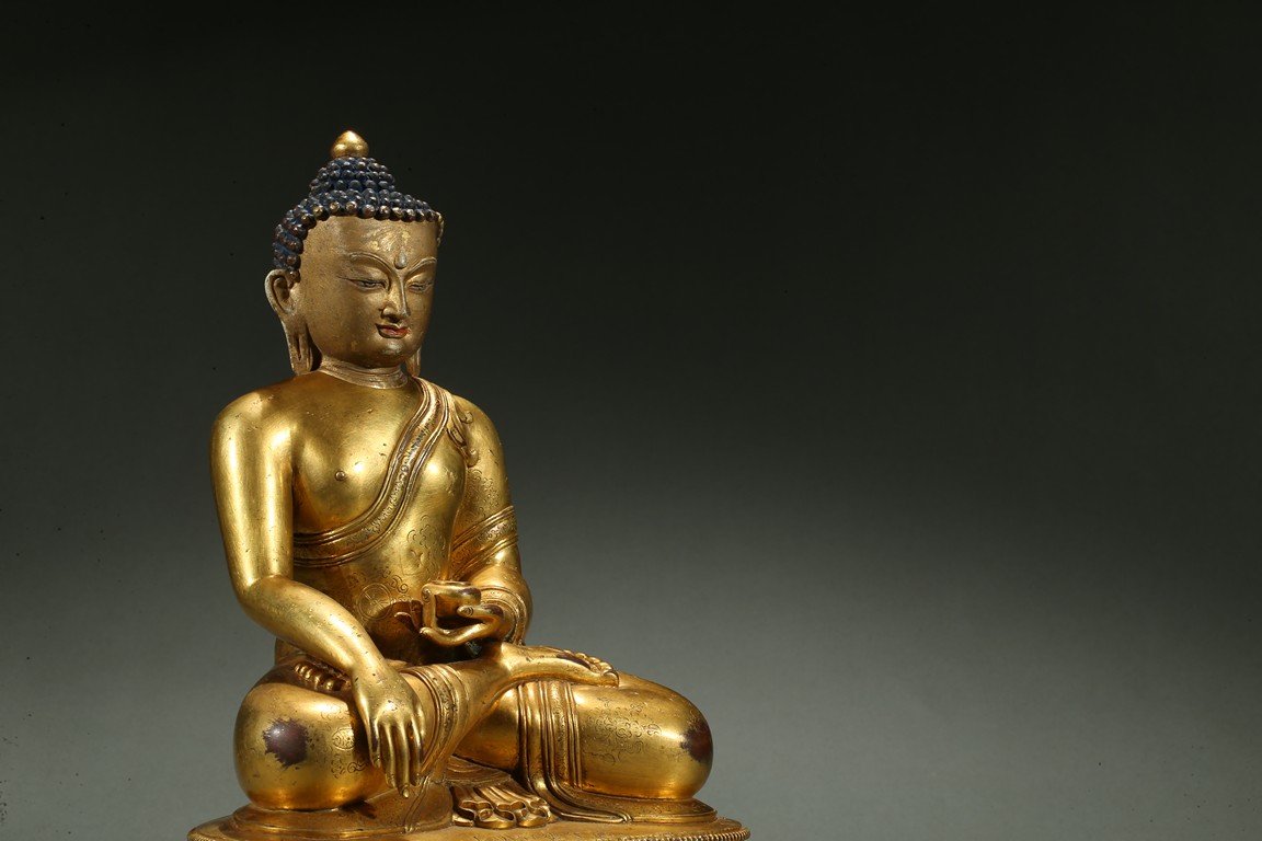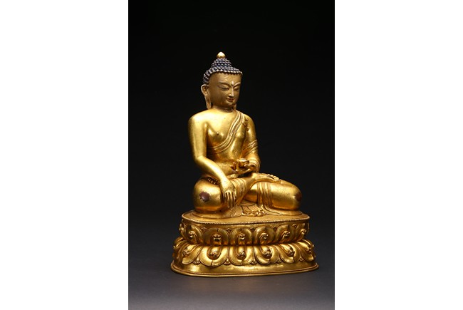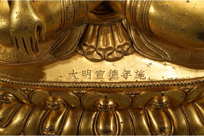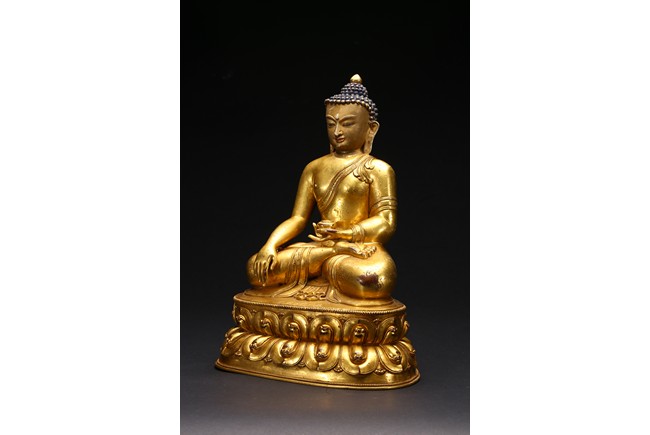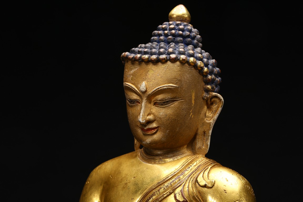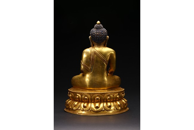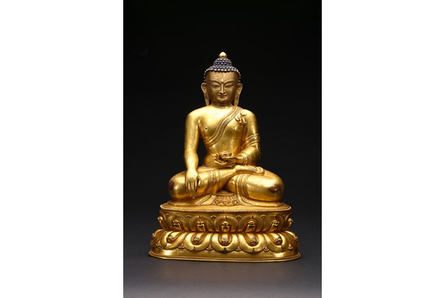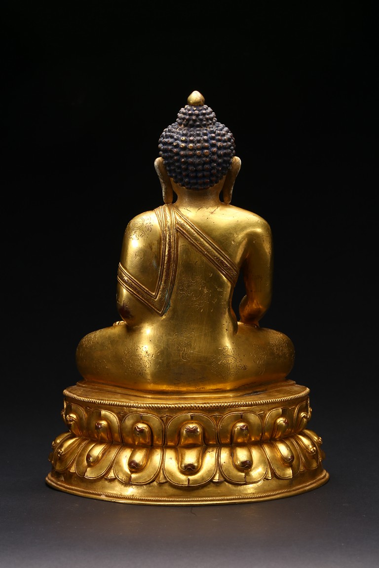 The bodhisattva is shown seated upon a double lotus throne in dhyanasana, the left hand holding alms bowl , wearing dhoti with incised hemt, the cold gilded face with benevolent expression and topped tall ushnisha, the base with a later inscription Yongle mark. Qing Dynasty period.