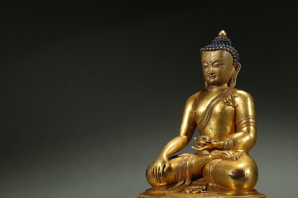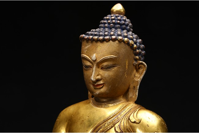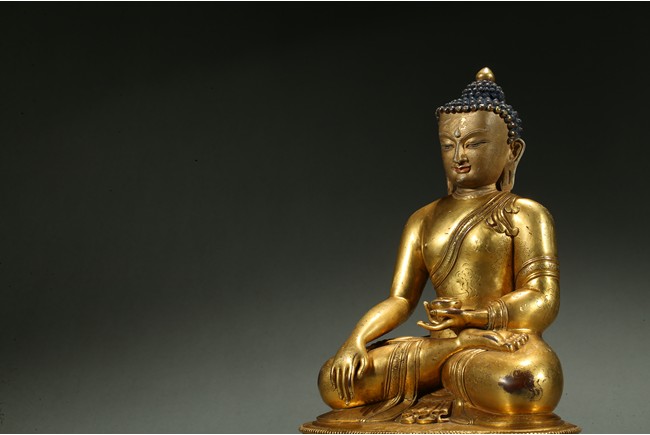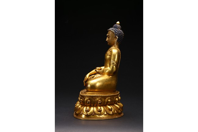 此尊為經典的藥師佛形象,鎏金飽滿,佛陀身體比例完美,雙肩寬厚,腰部纖細,四肢飽滿有力。佛陀肉髻高聳,寶珠頂嚴,頭飾螺發,排列整齊,兼容和煦,面額光潔寬廣,眉目上揚,目光下視且沉靜內斂,雙唇飽滿,嘴角微揚,露出無限智慧和寬廣的慈悲。雙腳結全跏趺坐,左手置於腹前,手捧藥缽,右手觸地印,為藥師佛的經典姿態。