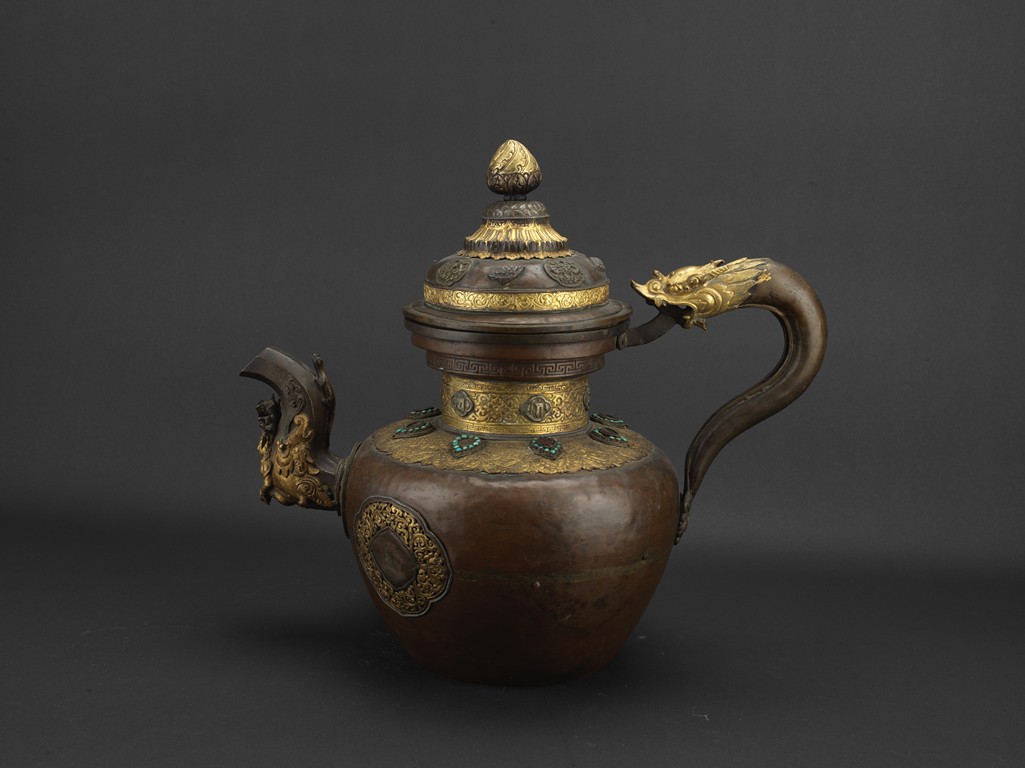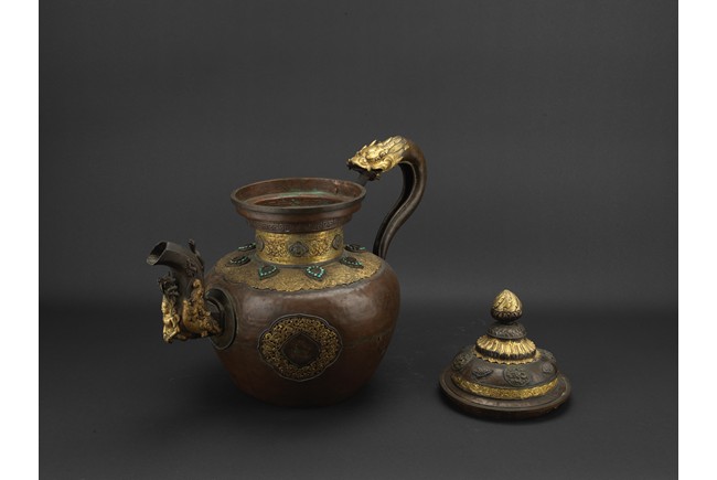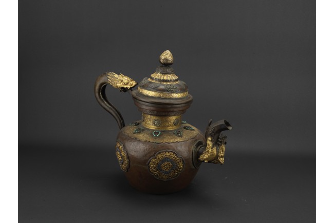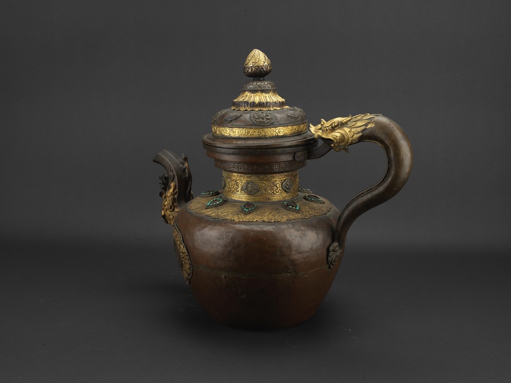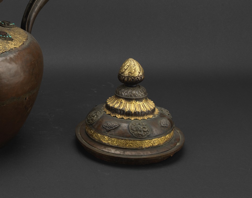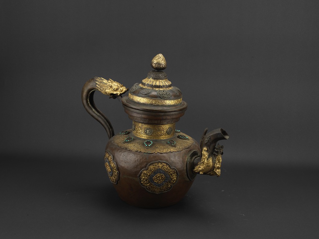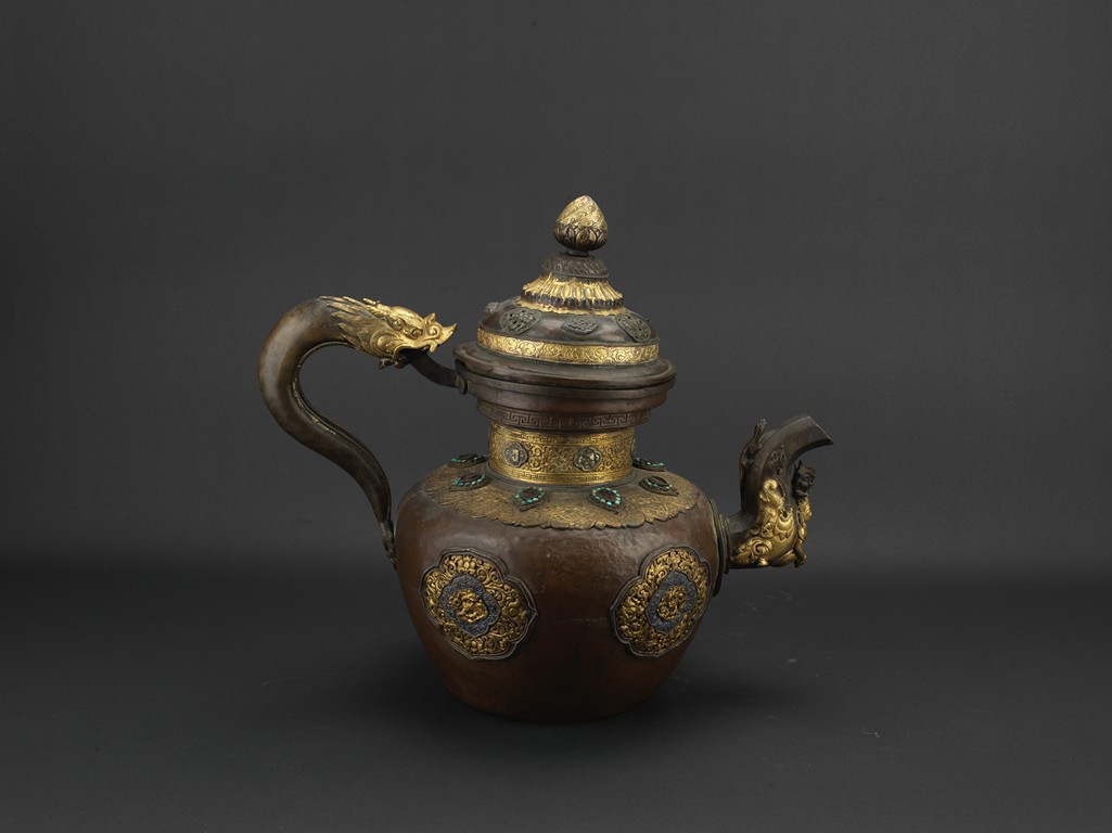 Tibetan. Rising from countersunk base, the globular body with a band of gilt inlaid band with turquoise beads, the raised neck fitted with a band of scroll-work, the handle with a gui-dragon, the spout shaped as the head and trunk of a makara, the domed cover with bud finial. 17th century.