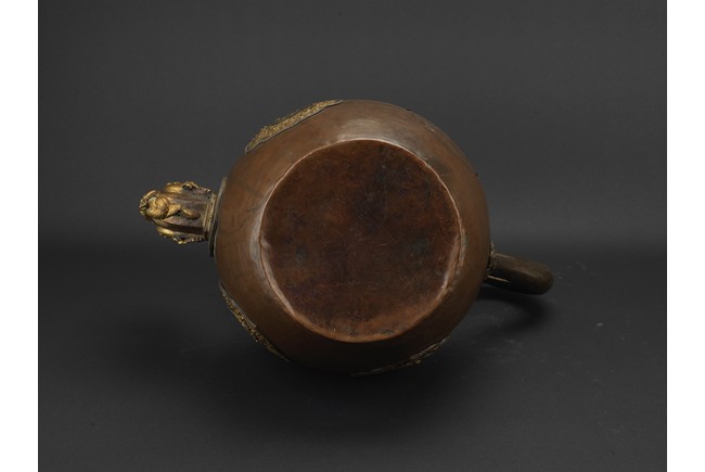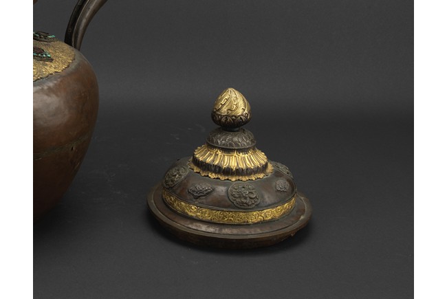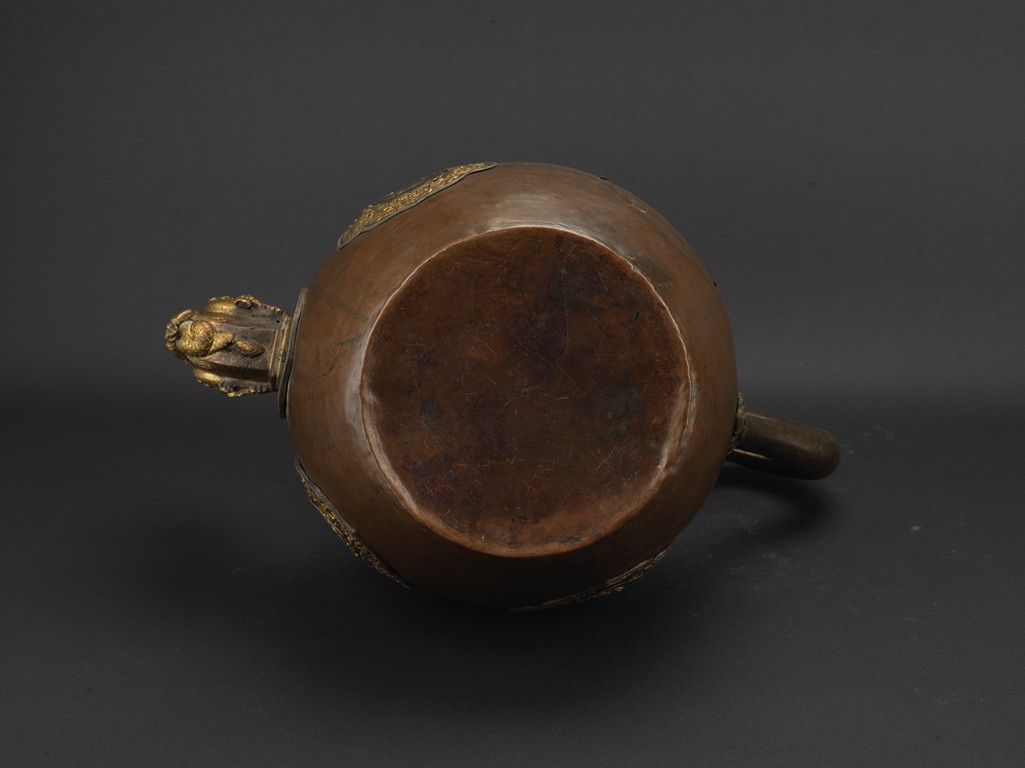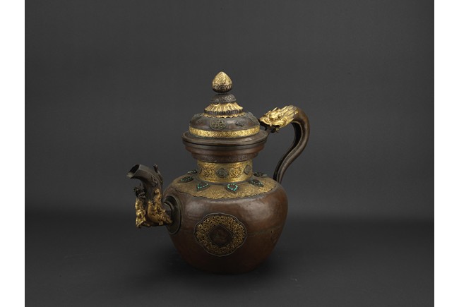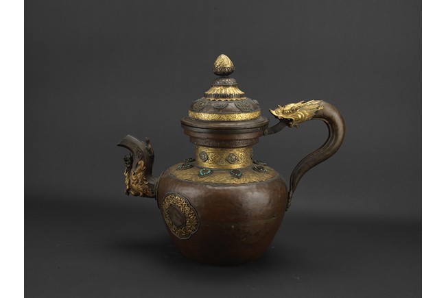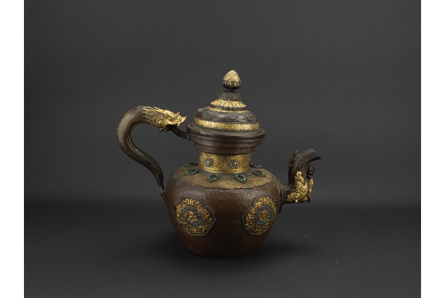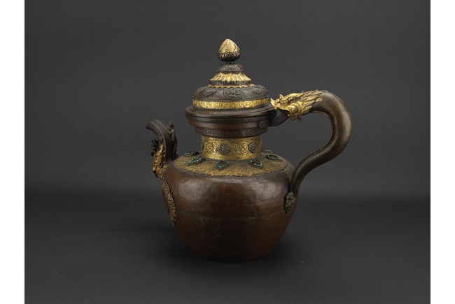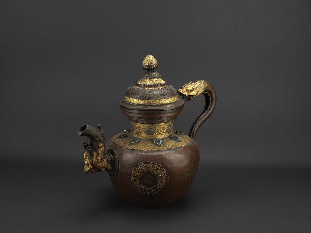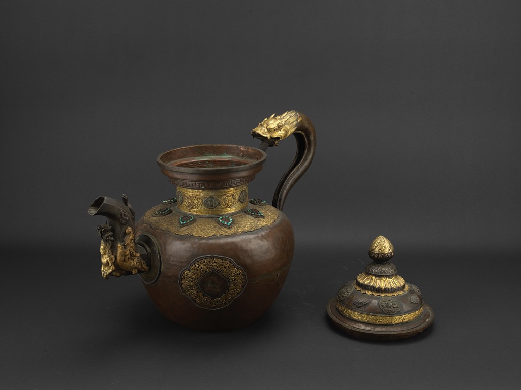 Tibetan. Rising from countersunk base, the globular body with a band of gilt inlaid band with turquoise beads, the raised neck fitted with a band of scroll-work, the handle with a gui-dragon, the spout shaped as the head and trunk of a makara, the domed cover with bud finial. 17th century.