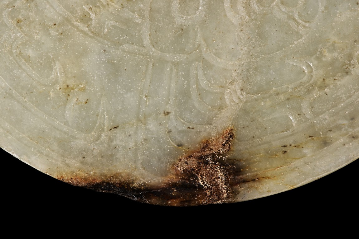 The circular jade disc bi finely incised with stylized pattern. Han Dynasty period.