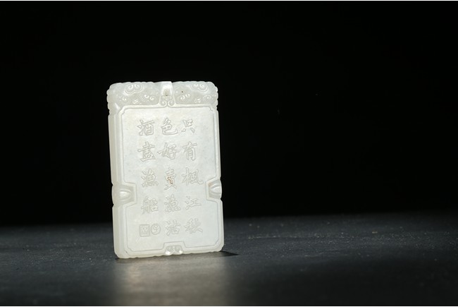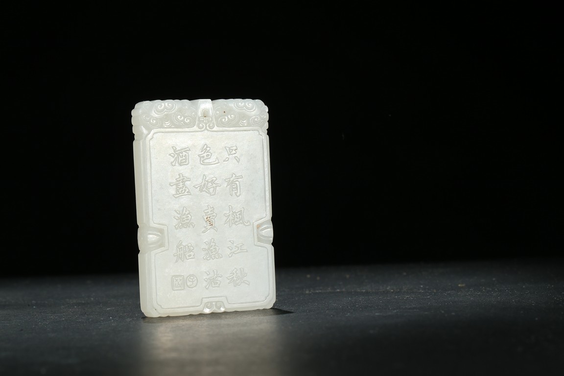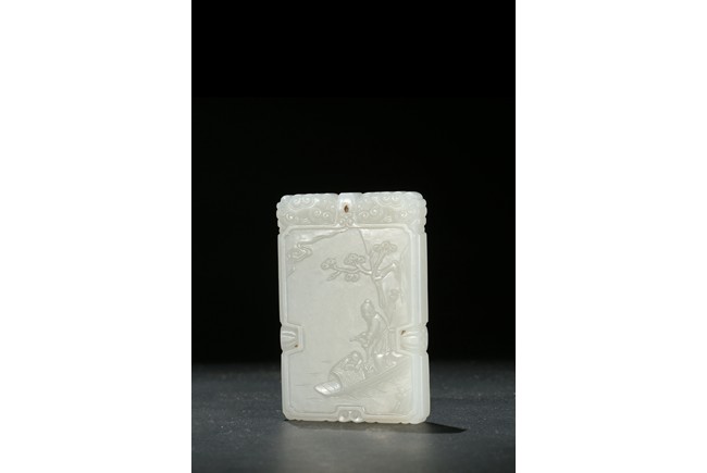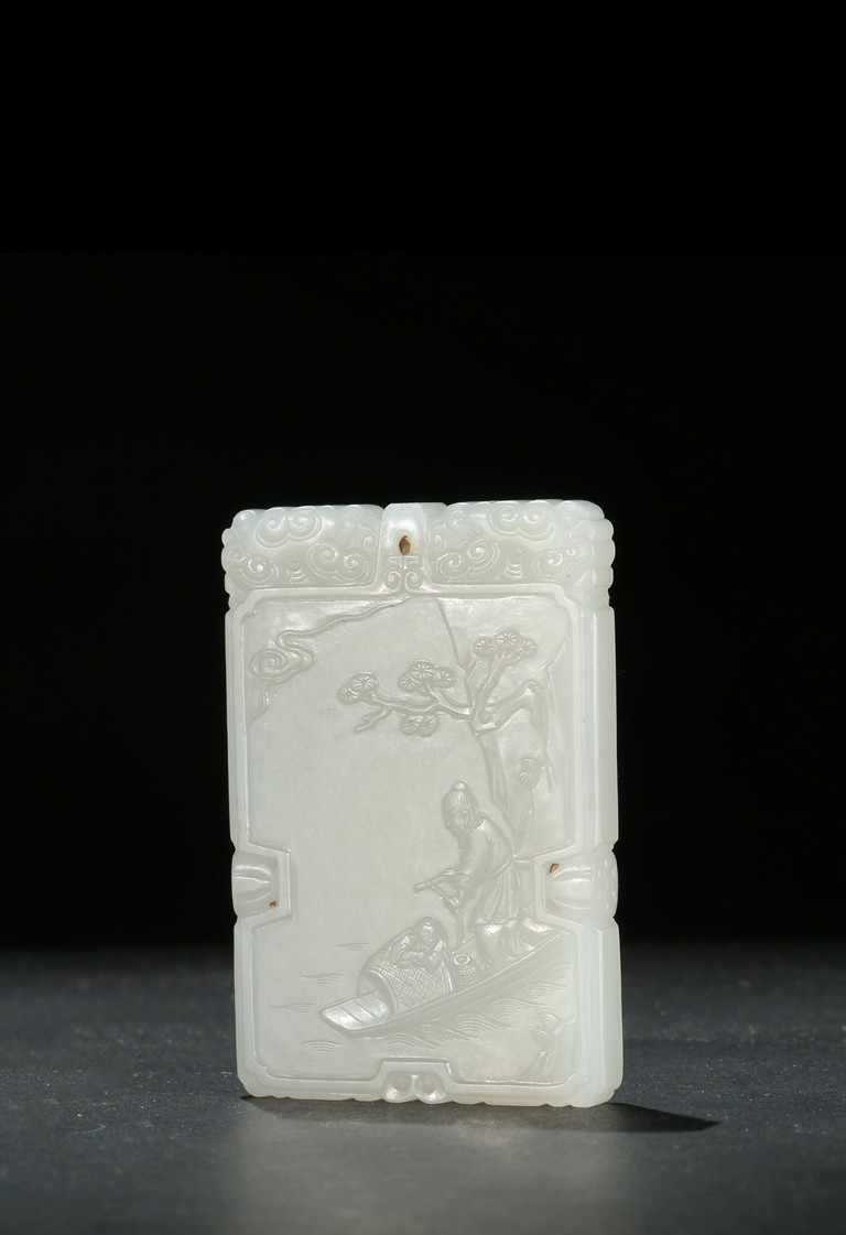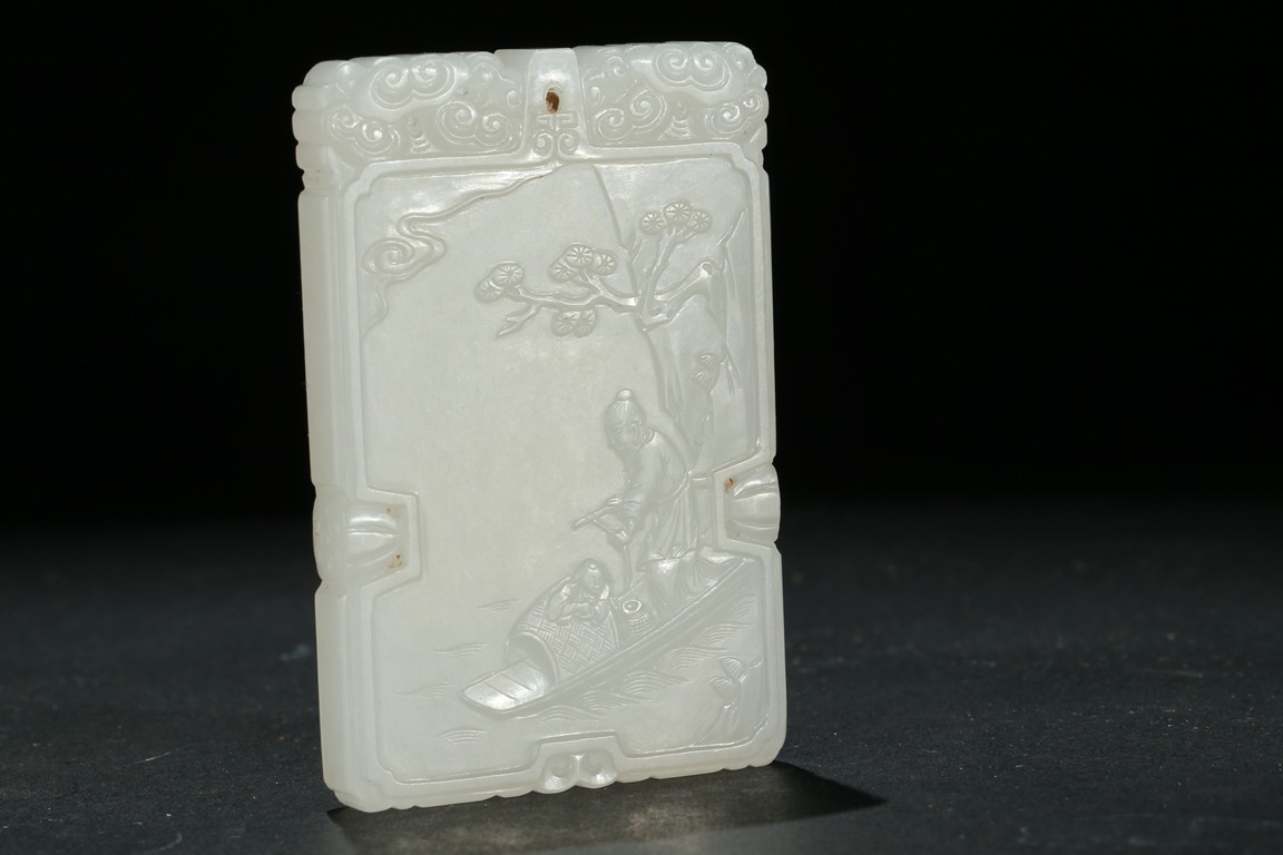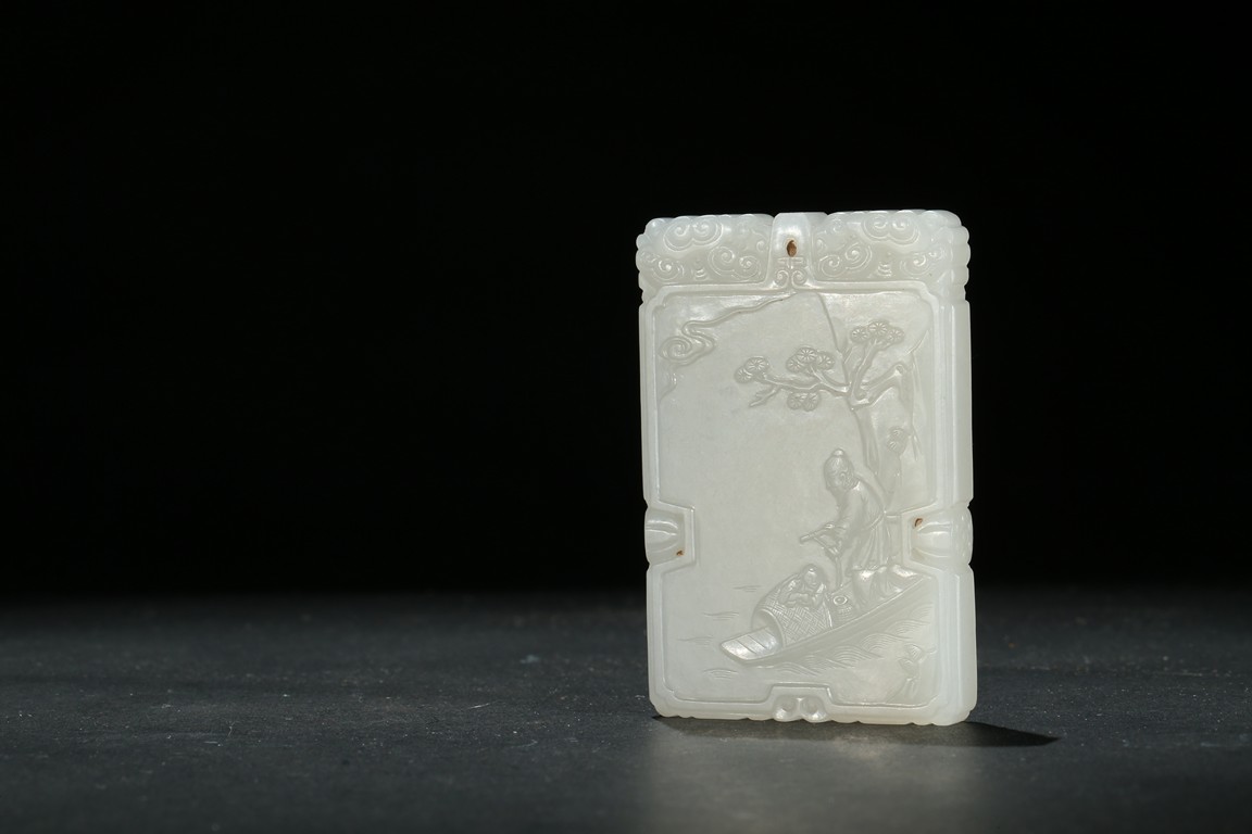 One face carved with an elderly figure accompanied by his attendant on a boat, the reverse with a long inscription followed by two seals reading Zigang, all below scrolled cloud design, the stone of an even white tone. Qing Dynasty period.