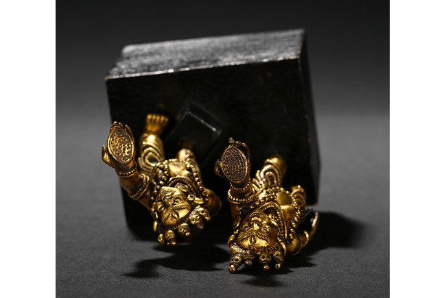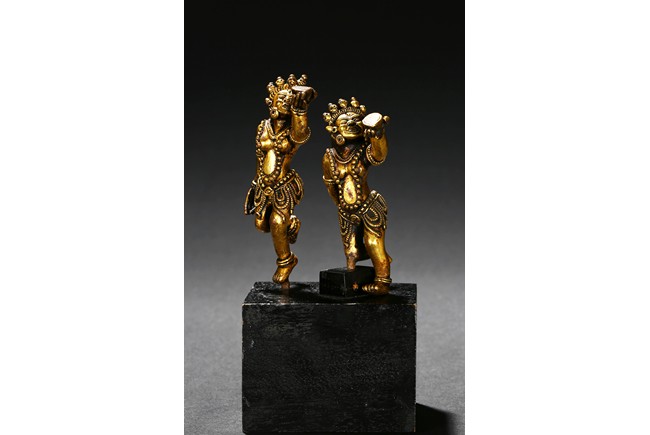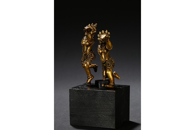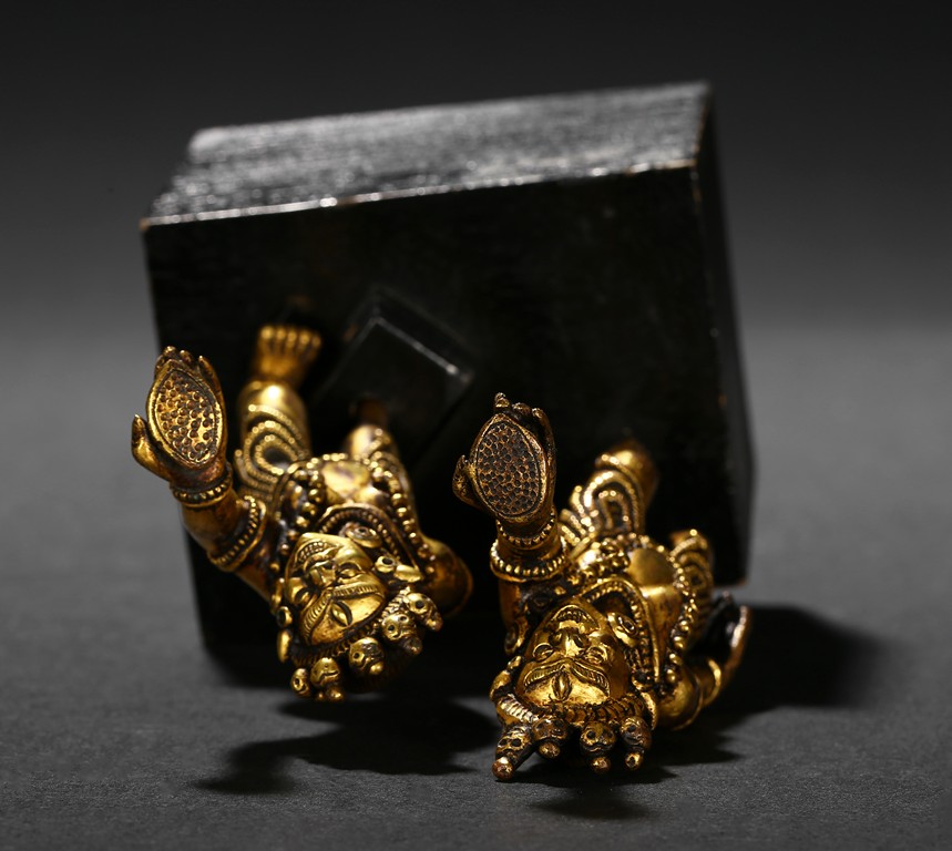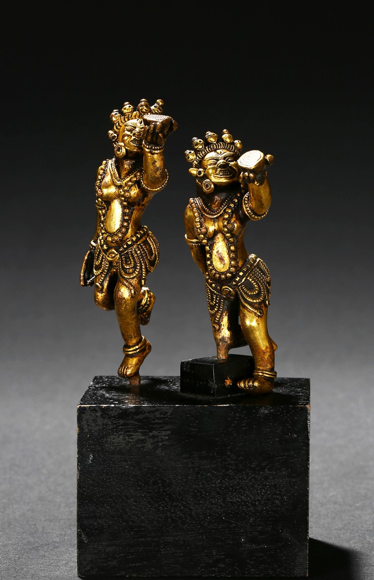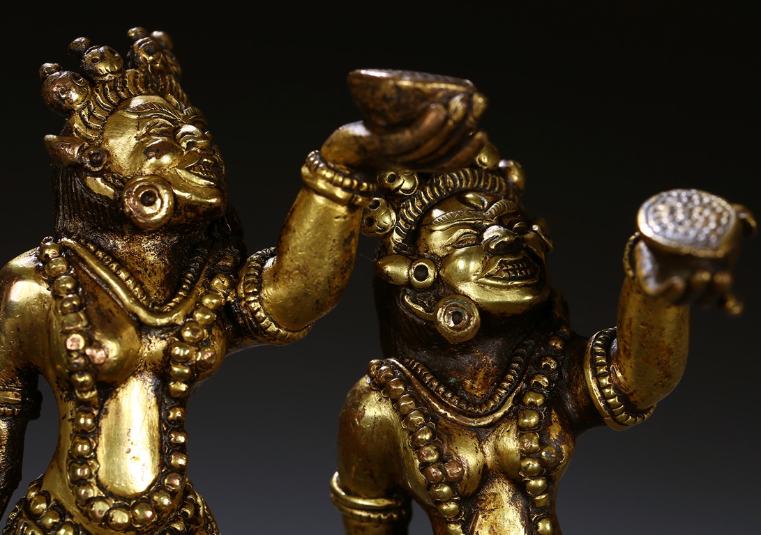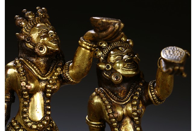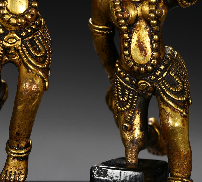 Each deity shown standing upon one foot, holding a tribute on one hand on left hand, body decorated with beaded jewellry, face with ferocious expression. Qing Dynasty period.