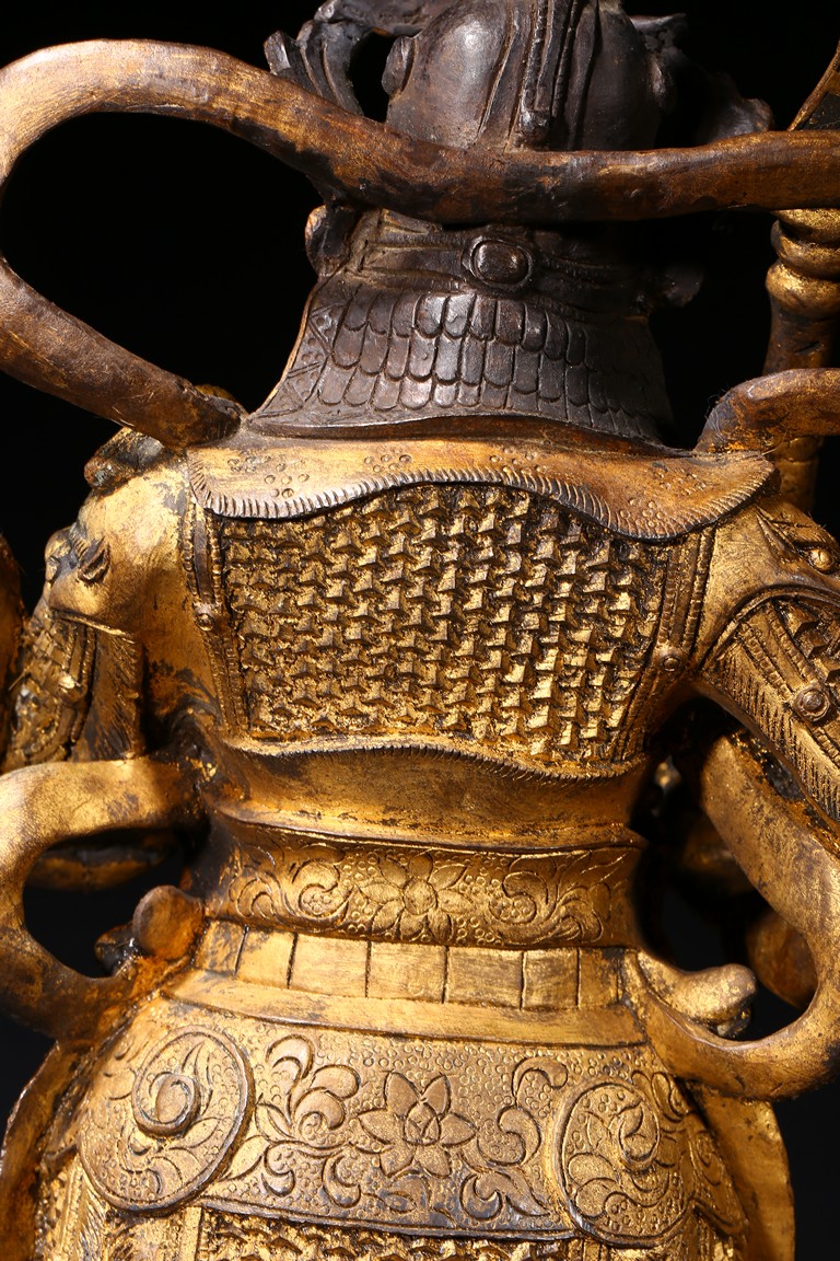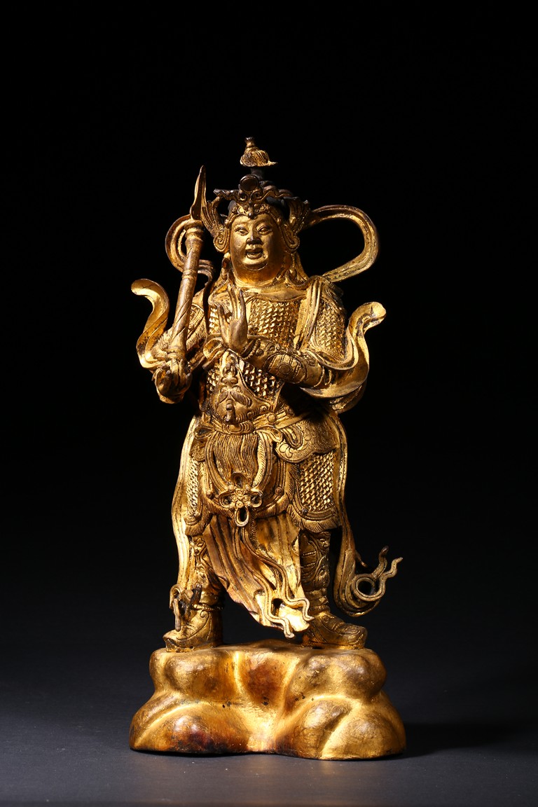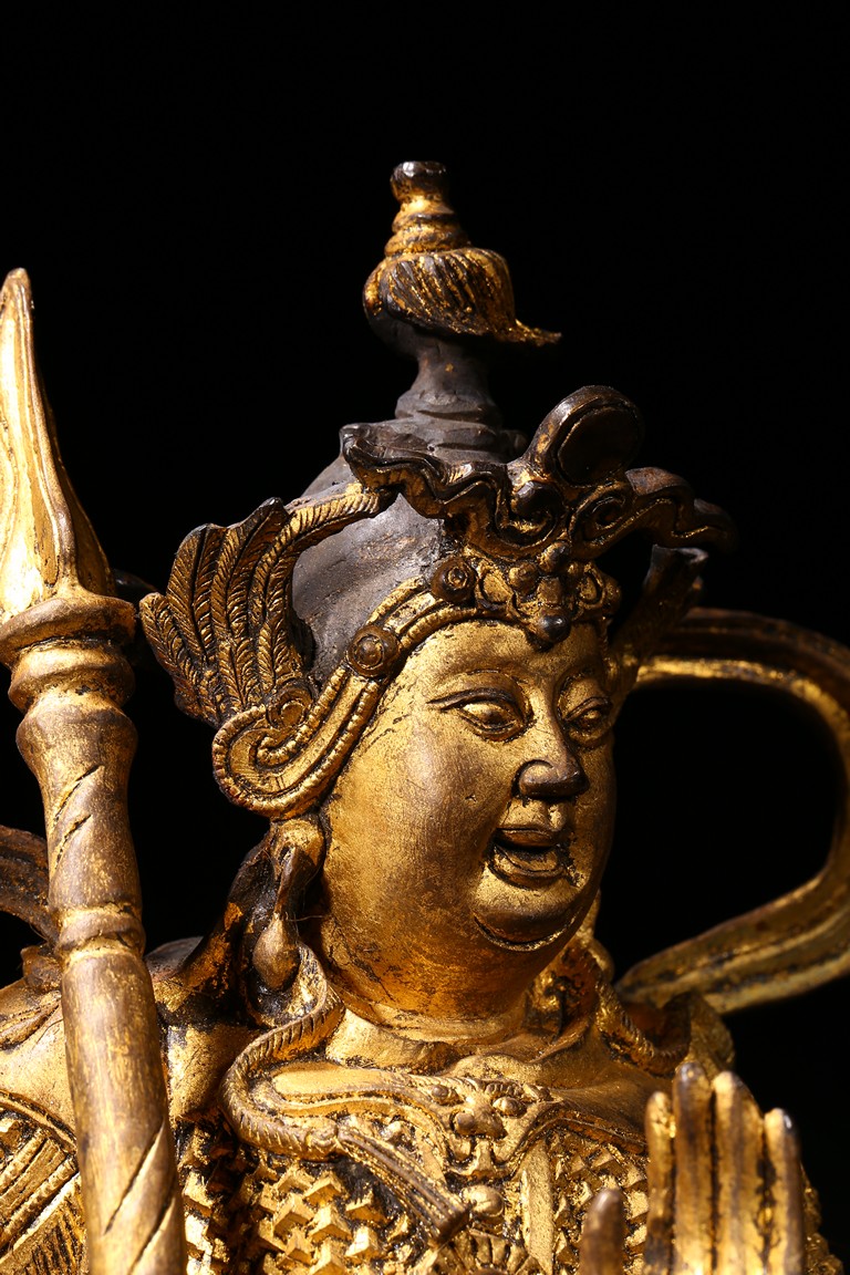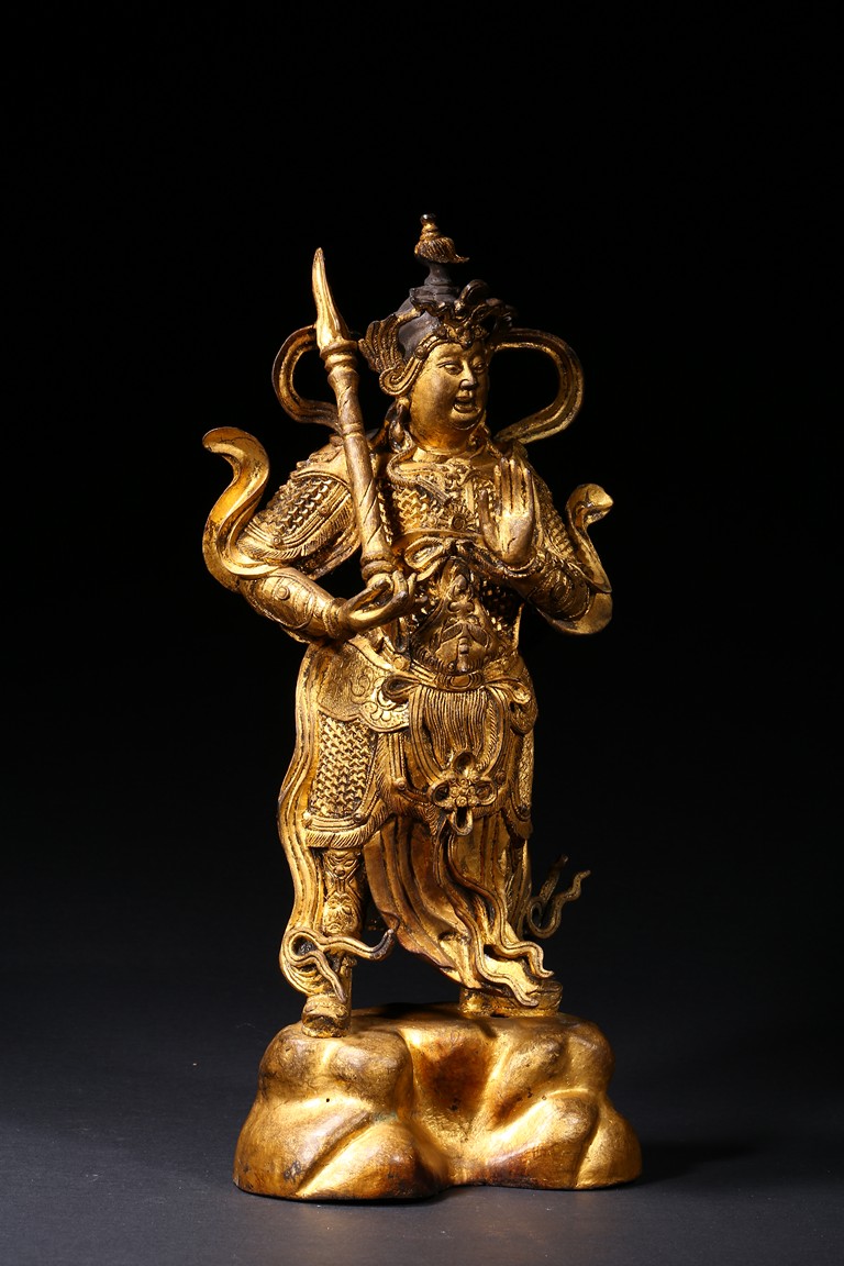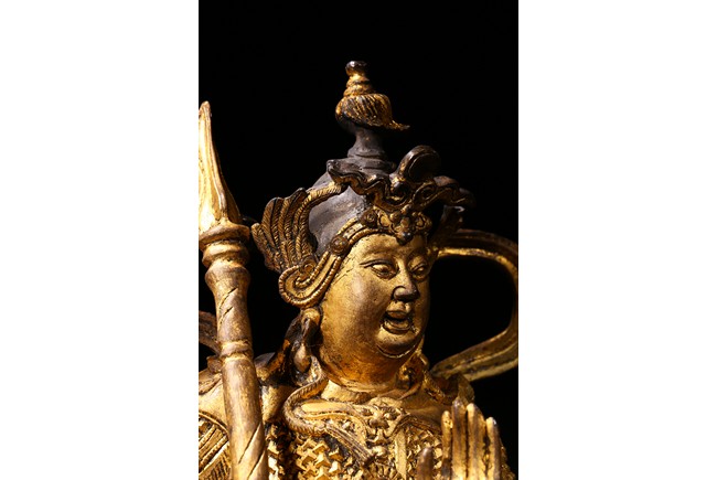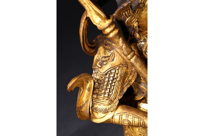 The skanda is shown standing and dressed in a scale-armor with a celestial ribbon across shoulders, his right hand holding a weapon in a non-threatening manner, the left hand raised, face with serene expression. Ming Dynasty period.