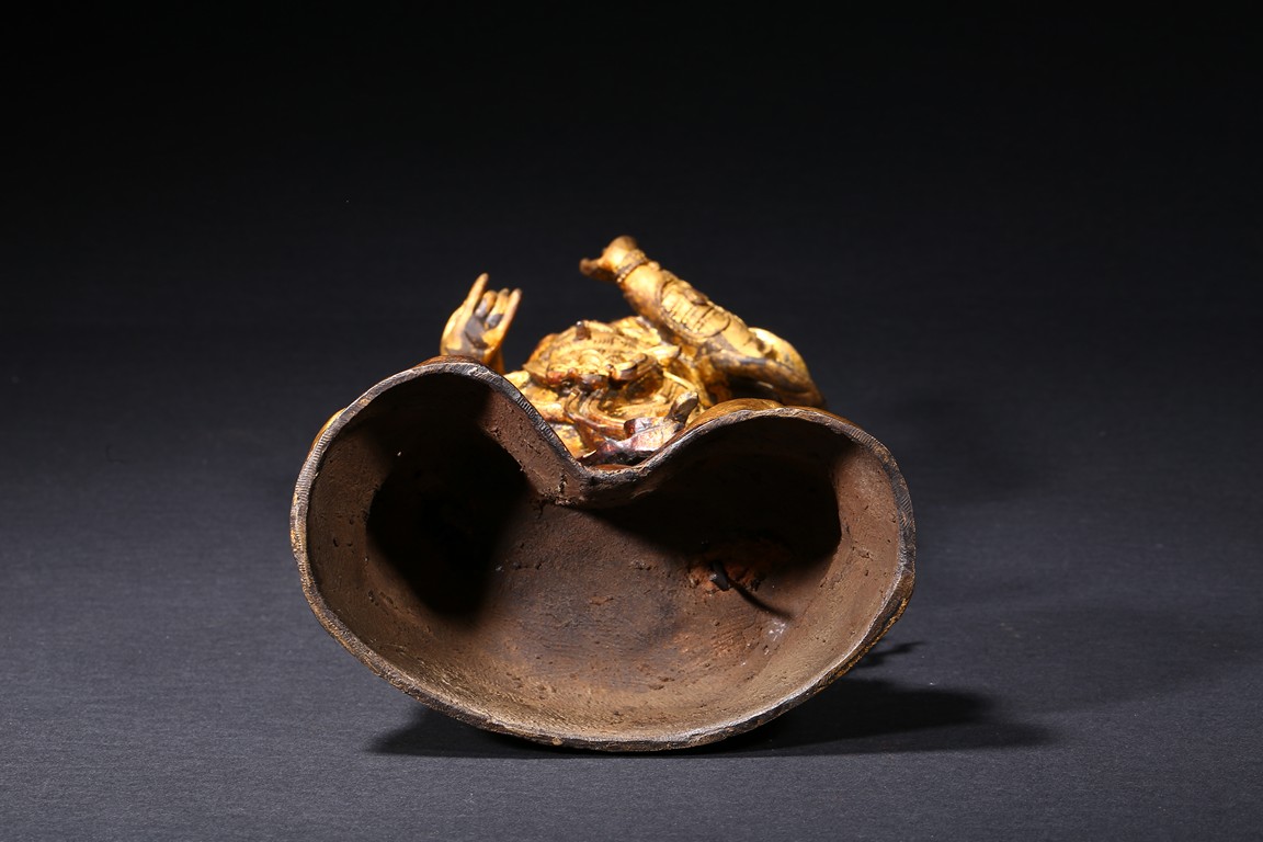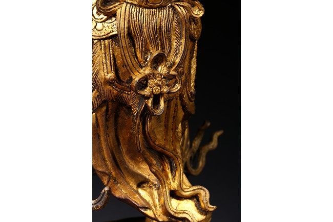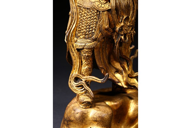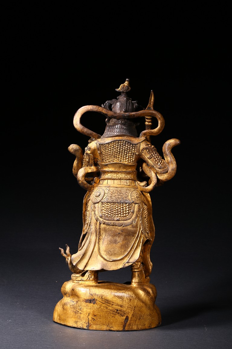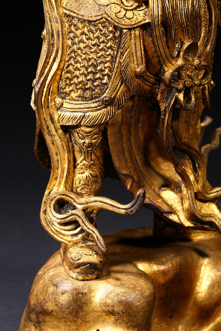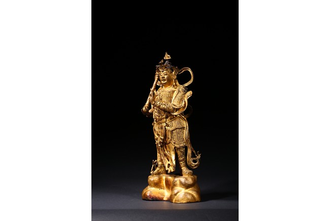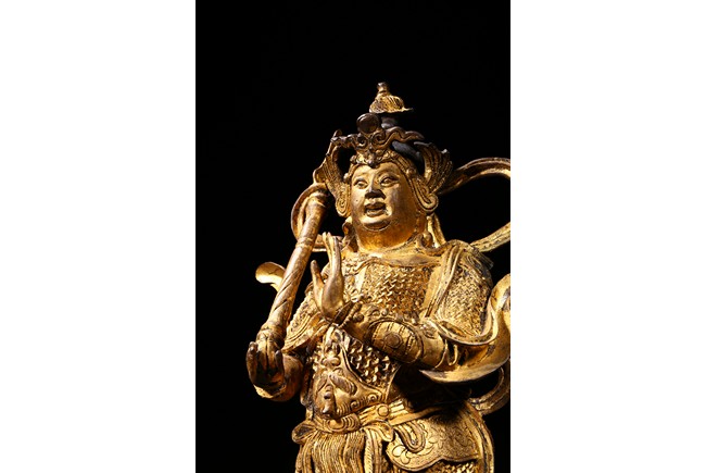 The skanda is shown standing and dressed in a scale-armor with a celestial ribbon across shoulders, his right hand holding a weapon in a non-threatening manner, the left hand raised, face with serene expression. Ming Dynasty period.