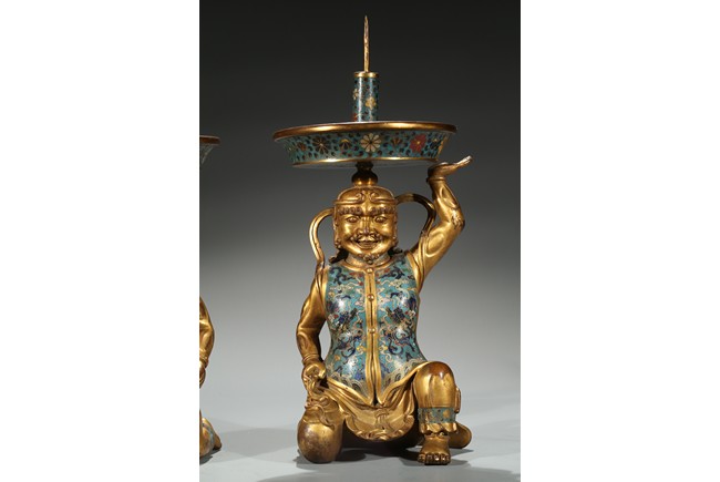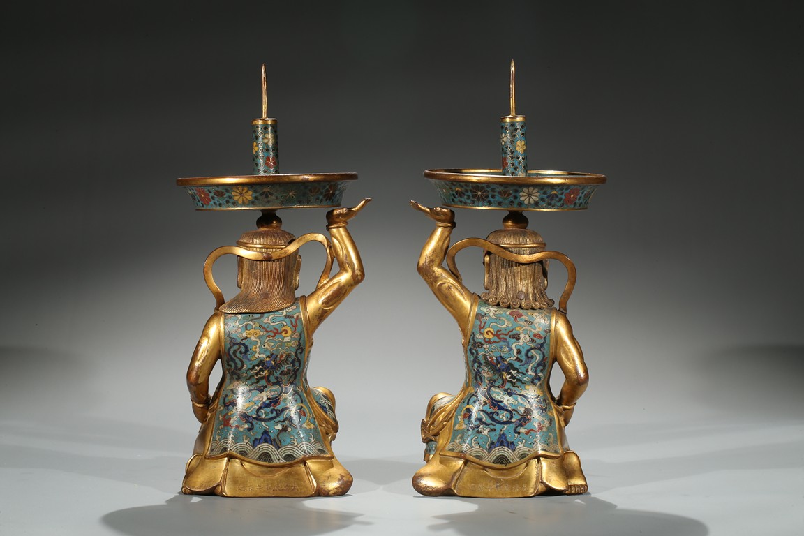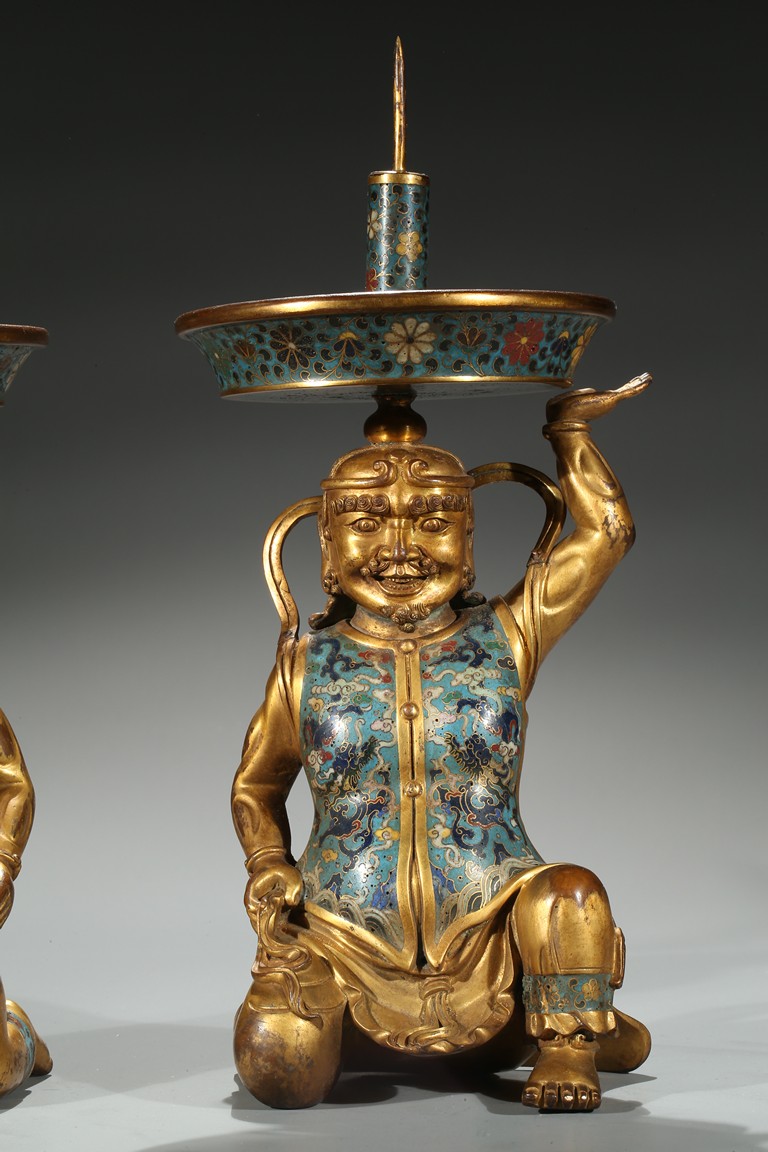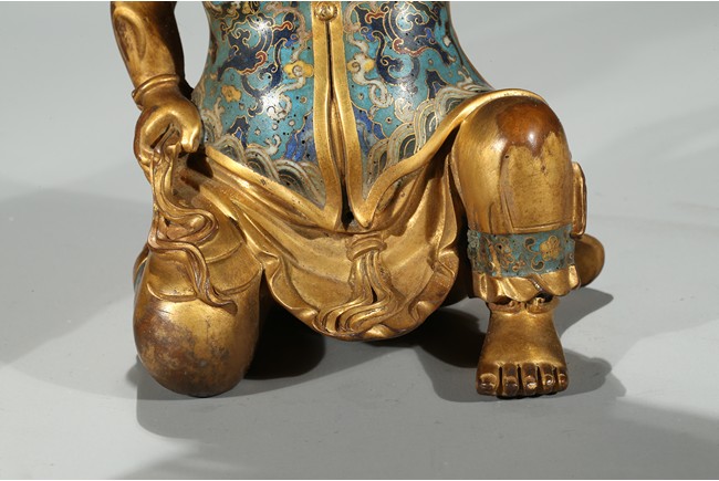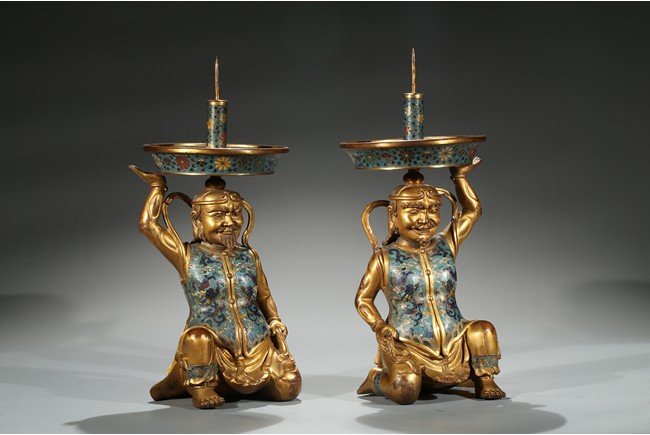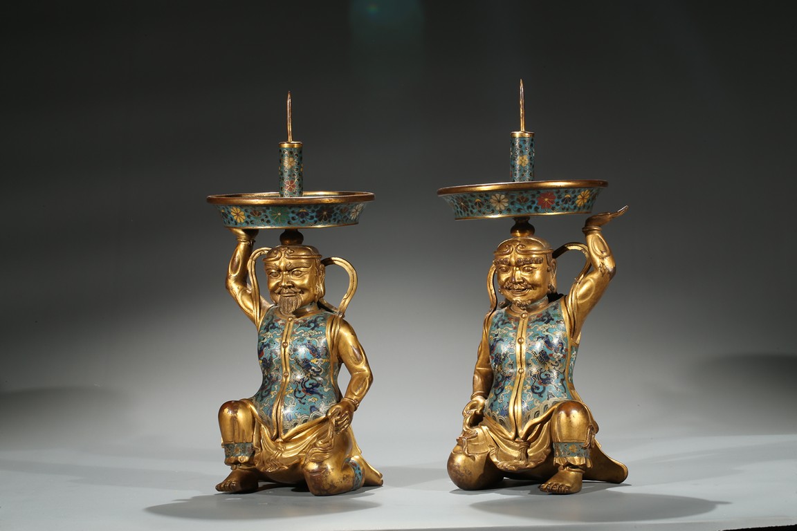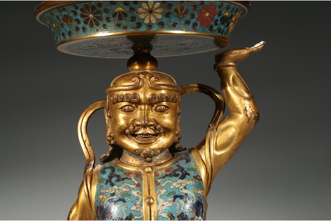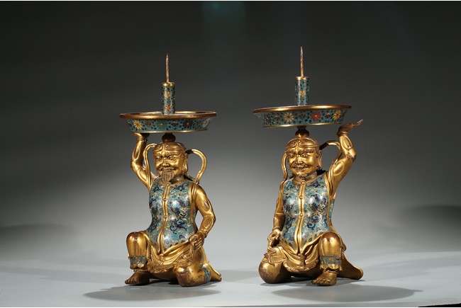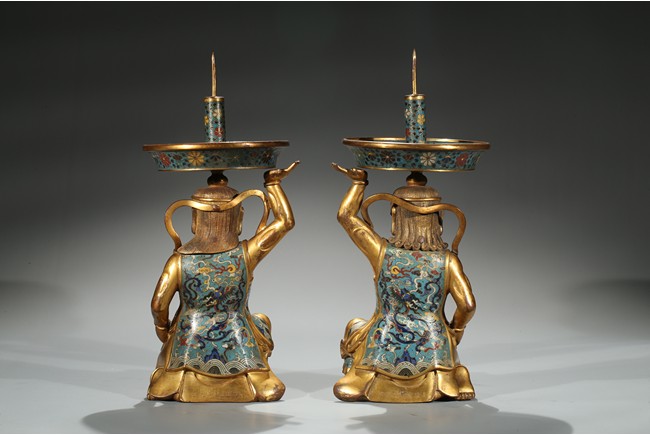 本品銅胎掐絲琺瑯器物,廣施鎏金,工藝繁複,所用藍料明亮鮮艷。胡人形象粗獷,眼若銅鈴,闊鼻直口,頭戴額箍,鬚髯捲曲,身著單衣,一手撐於腿部,一手上承燭台,單膝跪地,腳踩底座取“胡人獻寶”之意。胡人獻寶,又稱八蠻獻寶、波斯獻寶,象徵國立強盛、萬邦來朝、太平天下。背部刻“大清康熙年敬造”款識。