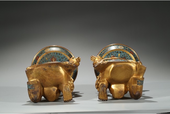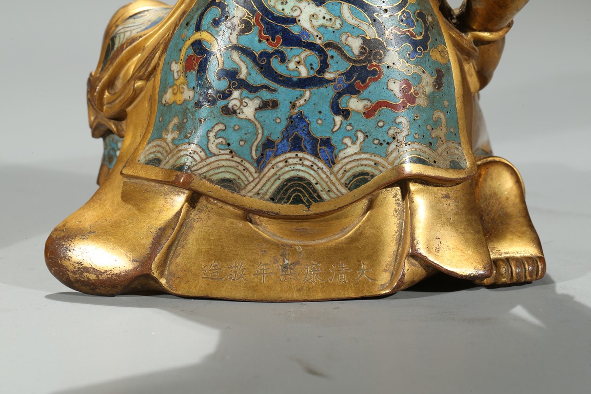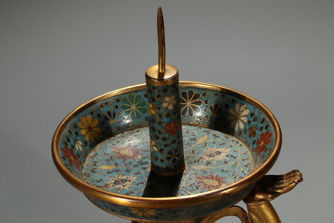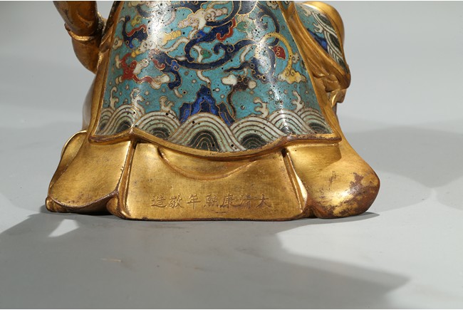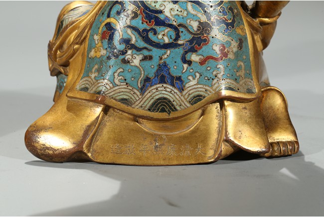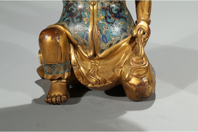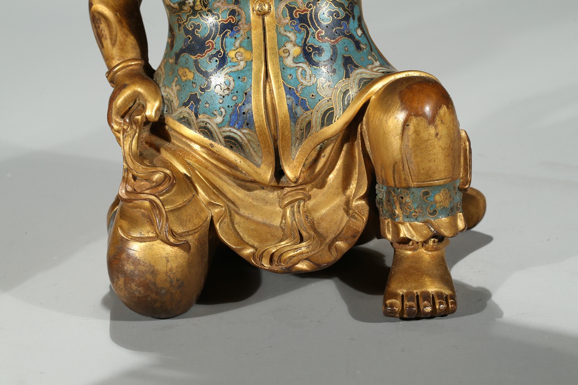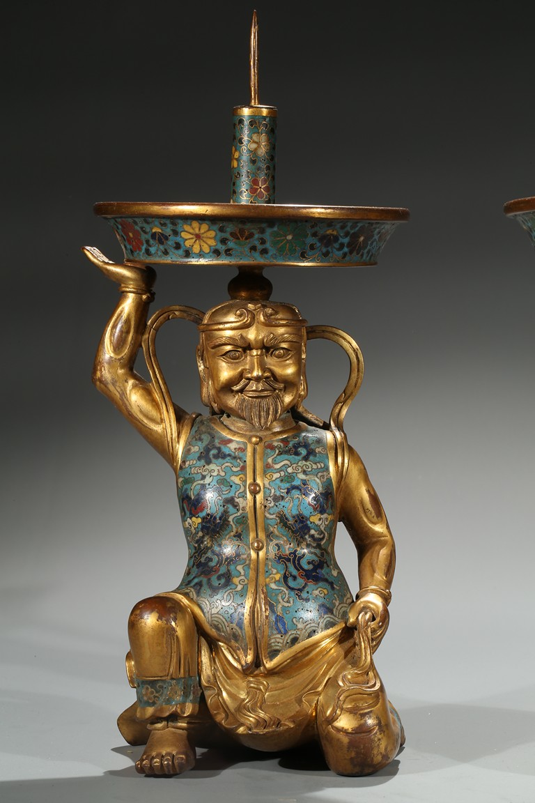 本品銅胎掐絲琺瑯器物,廣施鎏金,工藝繁複,所用藍料明亮鮮艷。胡人形象粗獷,眼若銅鈴,闊鼻直口,頭戴額箍,鬚髯捲曲,身著單衣,一手撐於腿部,一手上承燭台,單膝跪地,腳踩底座取“胡人獻寶”之意。胡人獻寶,又稱八蠻獻寶、波斯獻寶,象徵國立強盛、萬邦來朝、太平天下。背部刻“大清康熙年敬造”款識。