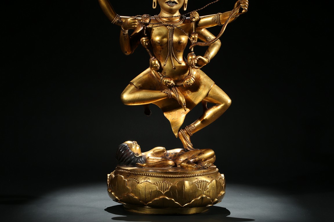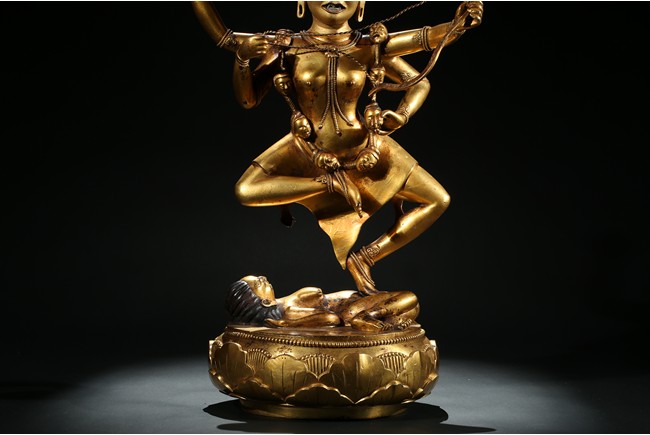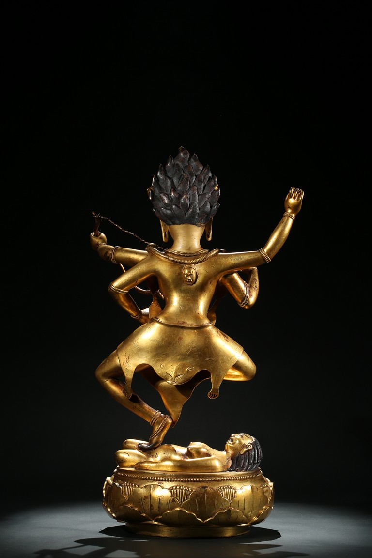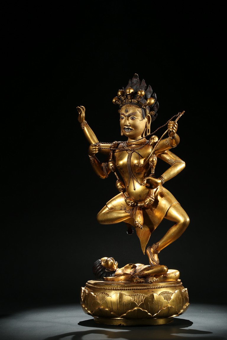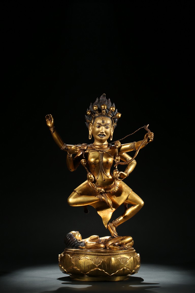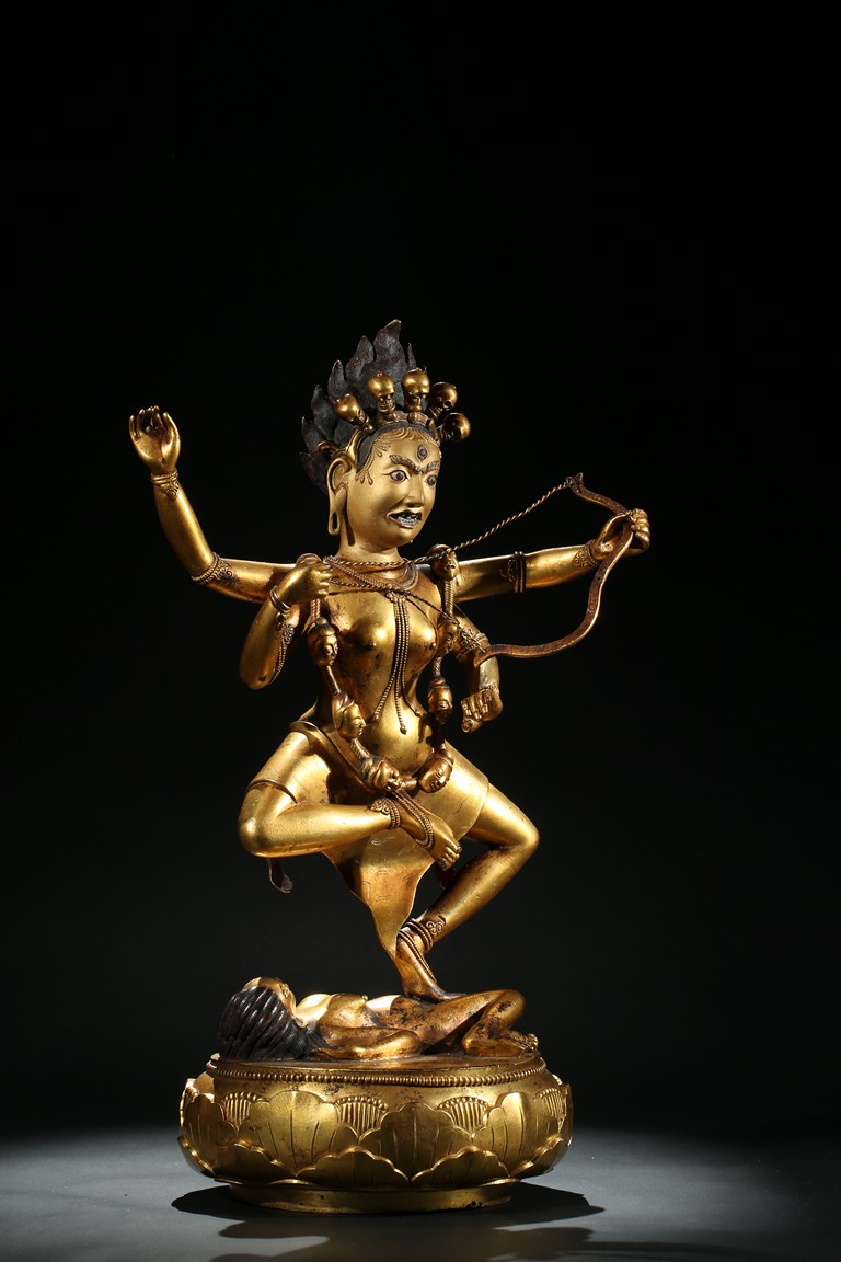 Standing in pratyalidhatandava upon the chest of a corpse, the primary hands holding a bow, the secondary hands outstretched, body wearing beaded jewelry, the cold gilt face wearing skull tiara and garland of severed heads, a ferocious expression beneath the third eye. Qing Dynasty period.