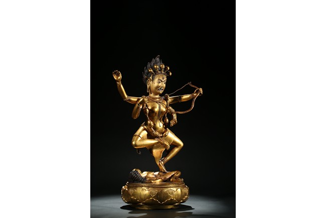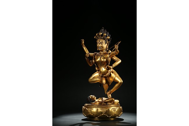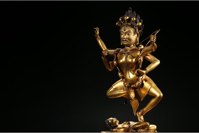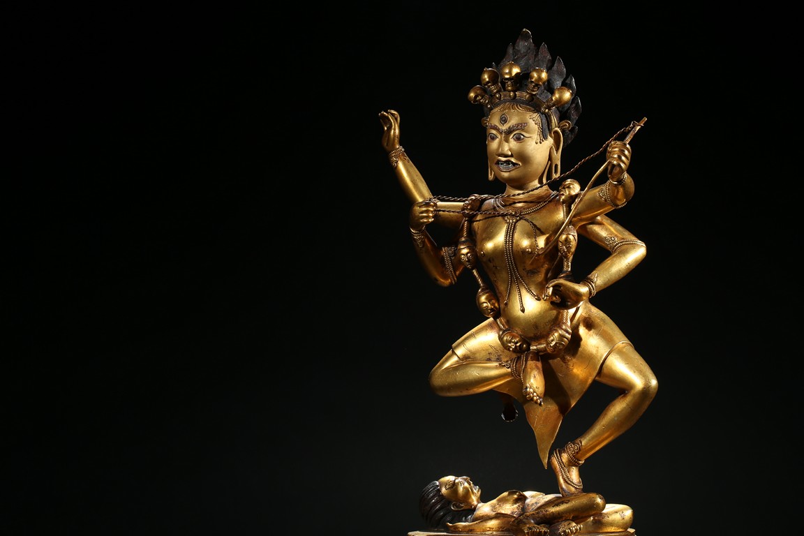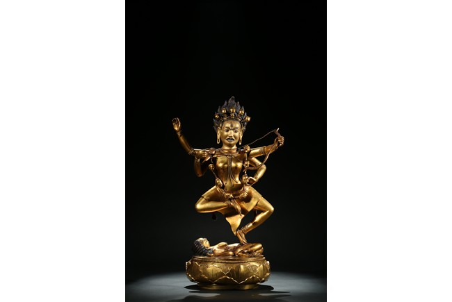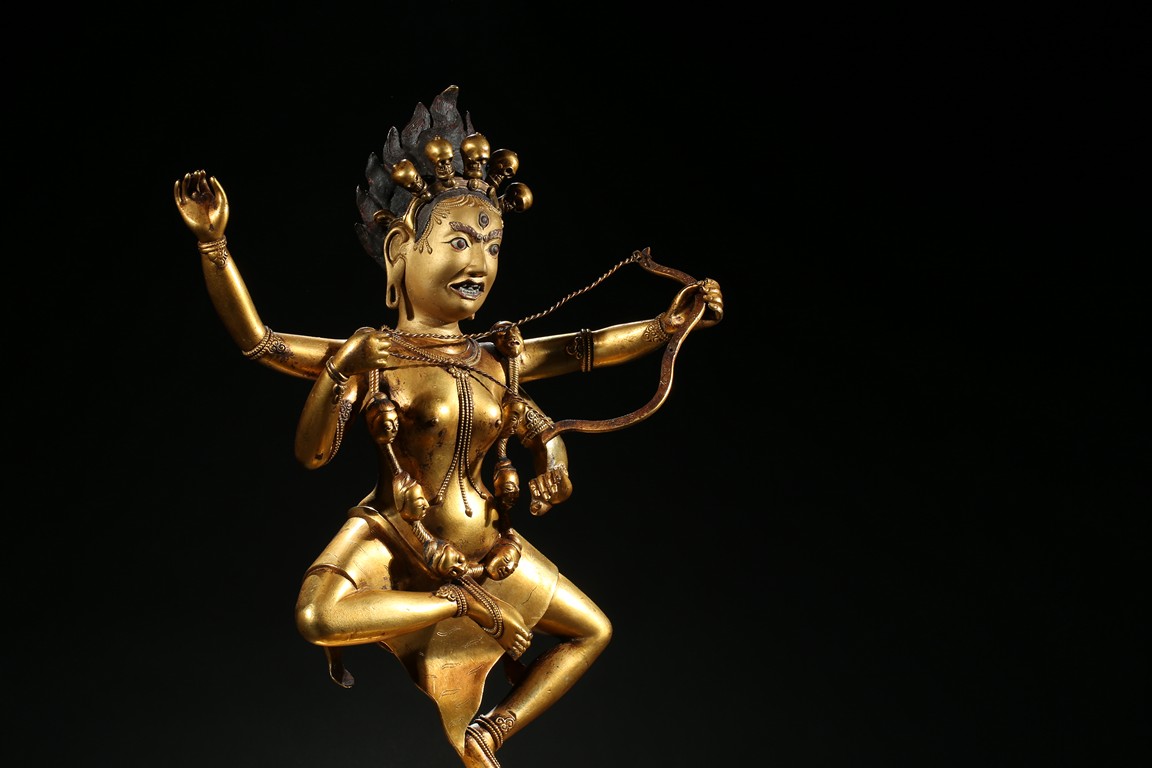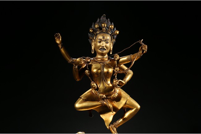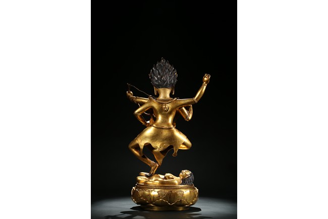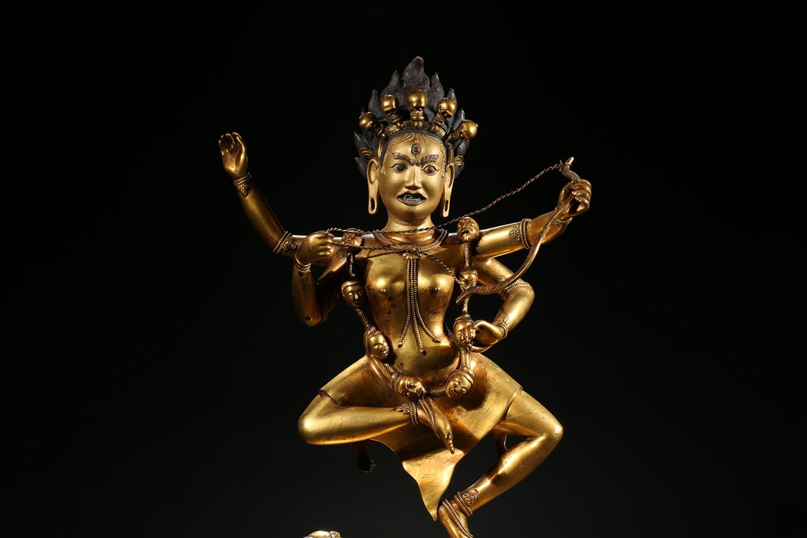 Standing in pratyalidhatandava upon the chest of a corpse, the primary hands holding a bow, the secondary hands outstretched, body wearing beaded jewelry, the cold gilt face wearing skull tiara and garland of severed heads, a ferocious expression beneath the third eye. Qing Dynasty period.