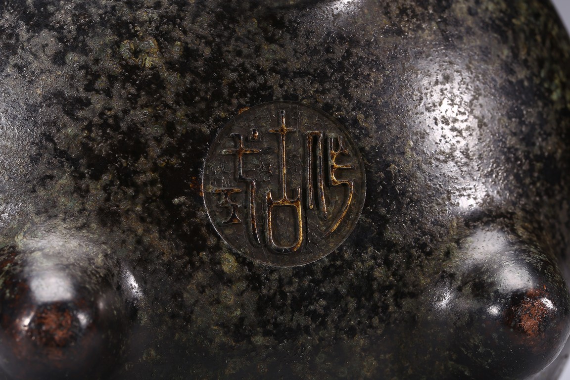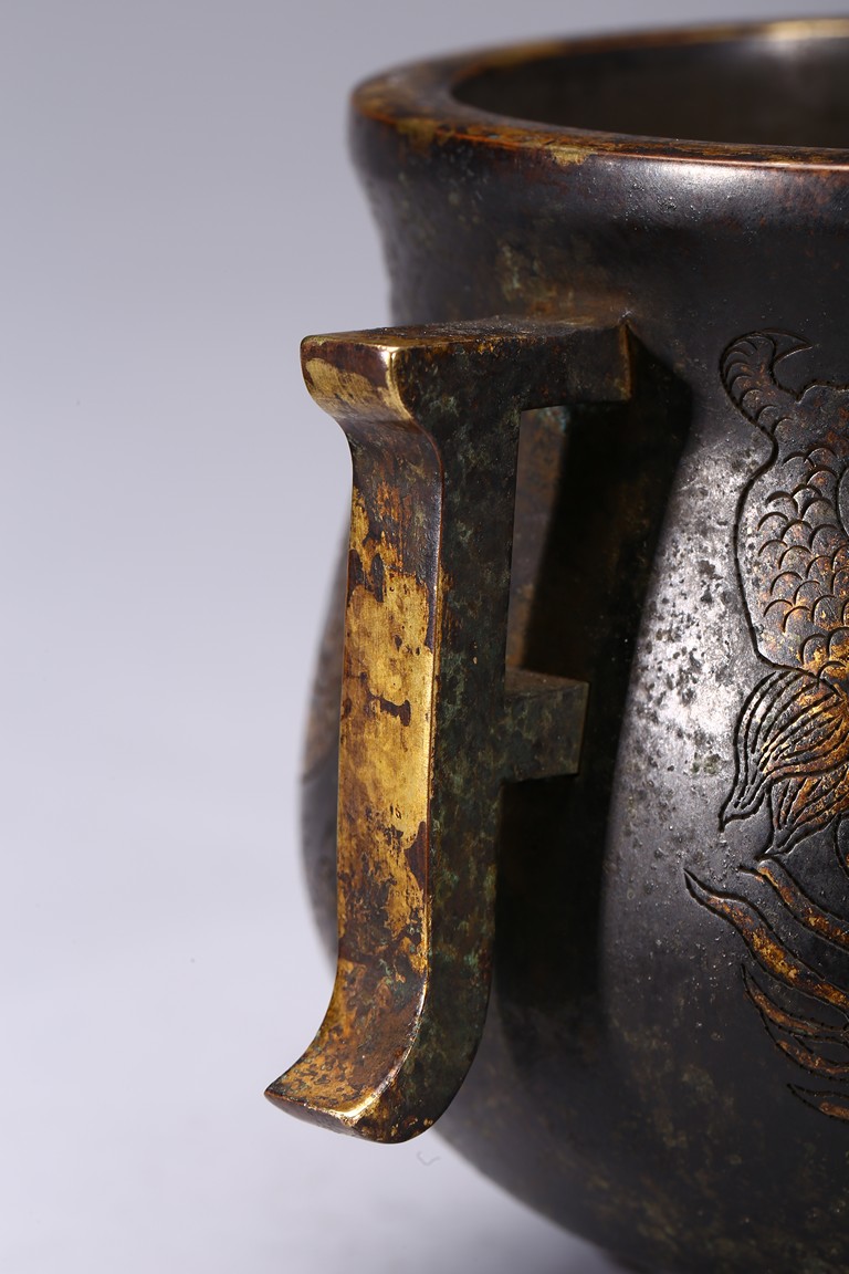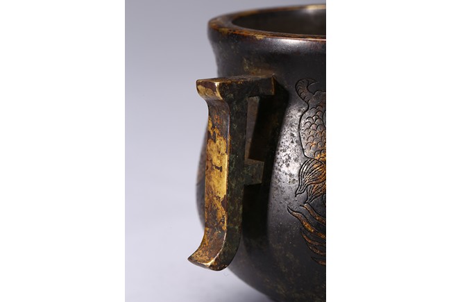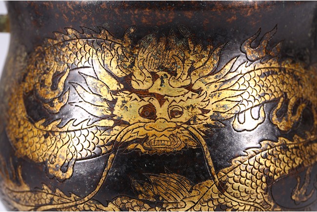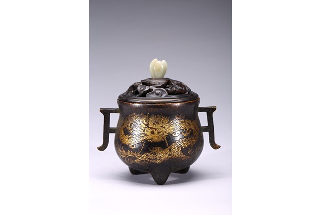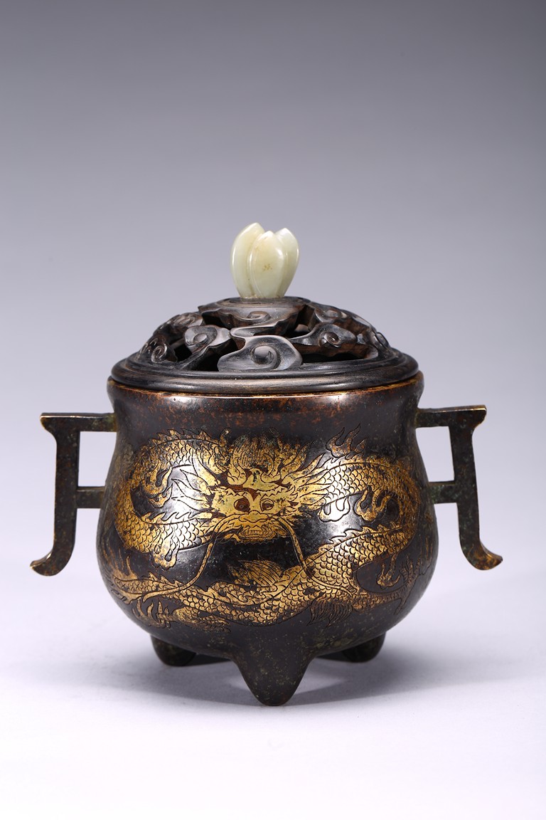 Of compressed globular body flanked by a pair of angular handles, the body decorated in parcel gilt with ferocious dragon, the base impressed with a three character mark, accompanied with jade mounted cover and wood stand. Qing Dynasty period.