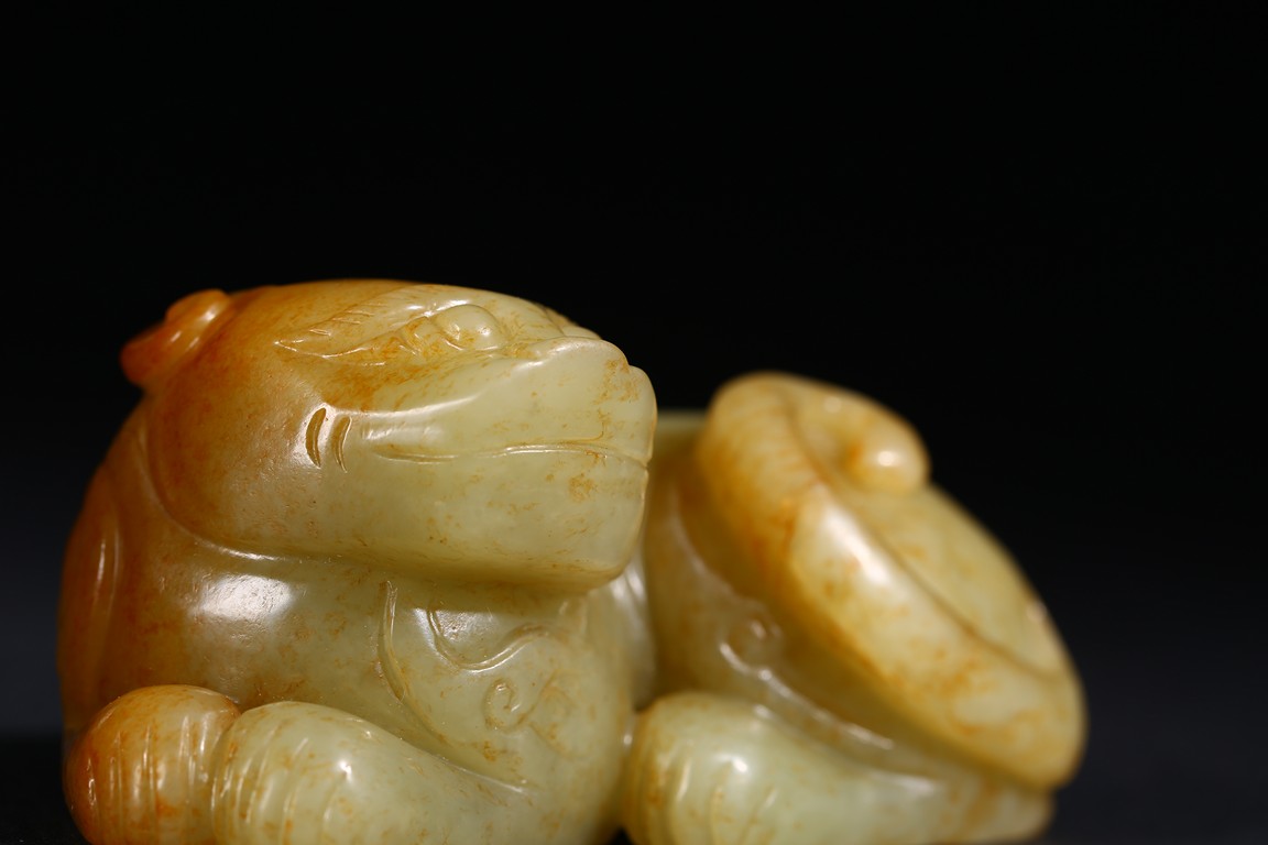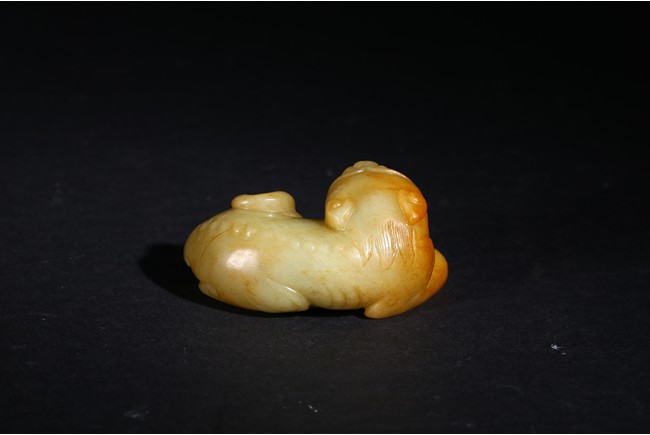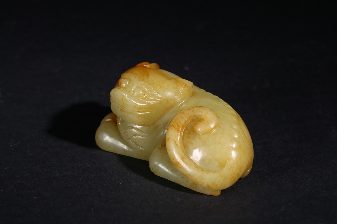 Depicted recumbent with the head turned to its left and resting on its front paws,the mythical beast portrayed with bulging eyes and an wide snout,its back rendered with a prominent spinal column terminating in a long tail swept against its haunches,the pebble of a warm yellow colour attractively highlighted with extensive russet patches. Qing Dynasty period.