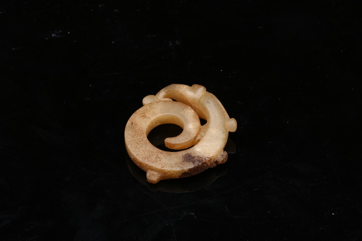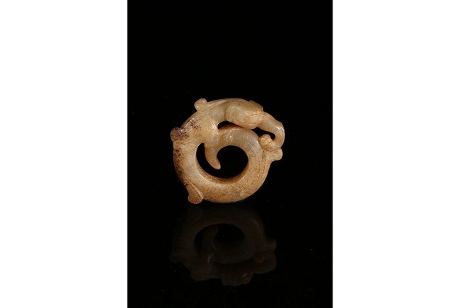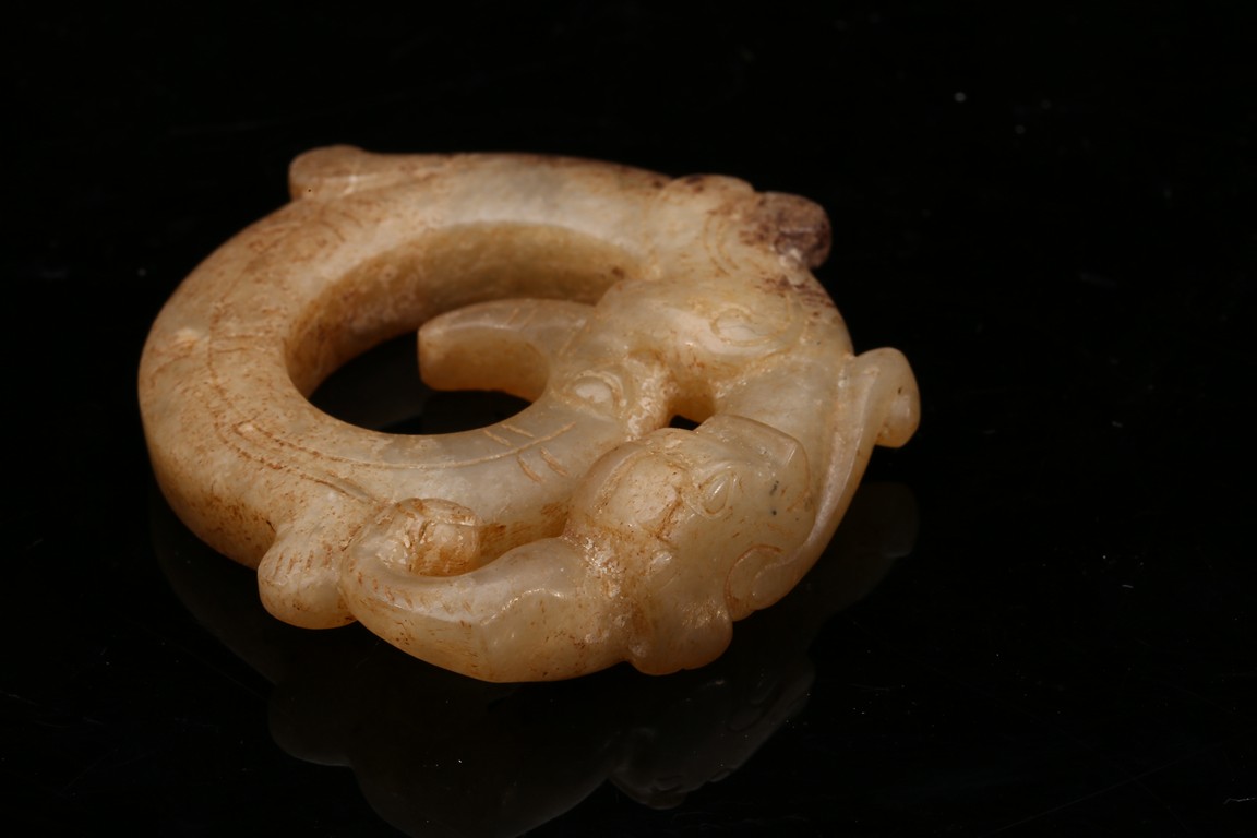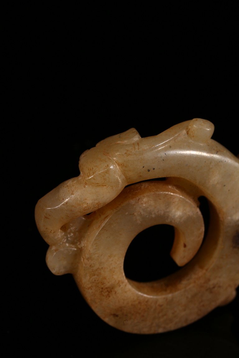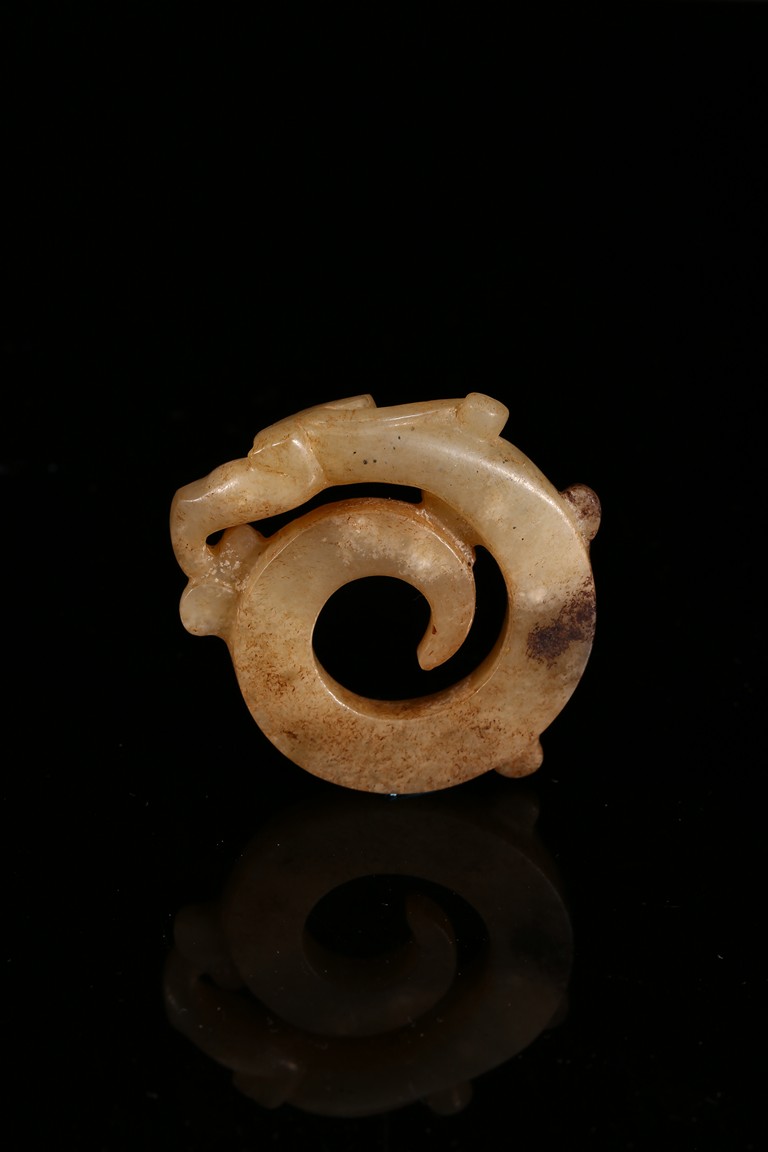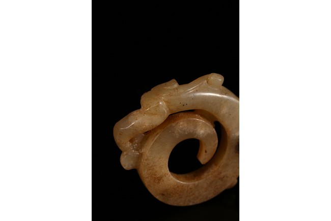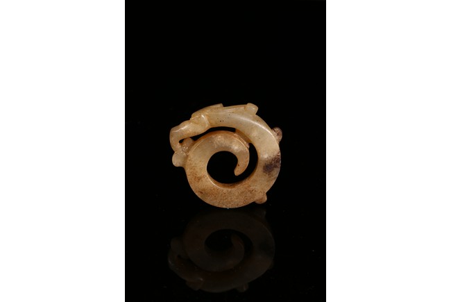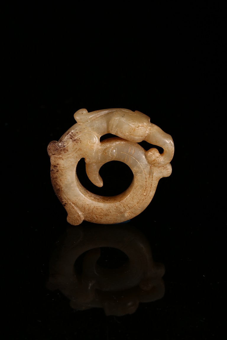 Modelled in the form of curled mythical beast with incised pattern. The stone is of mottled white and russet tone with dark inclusions. Shang Dynasty period.