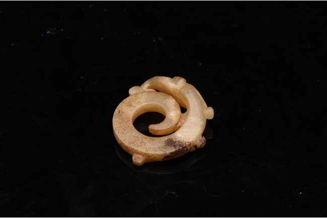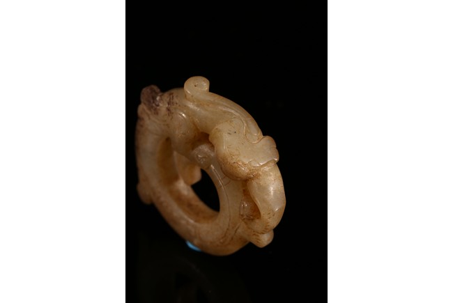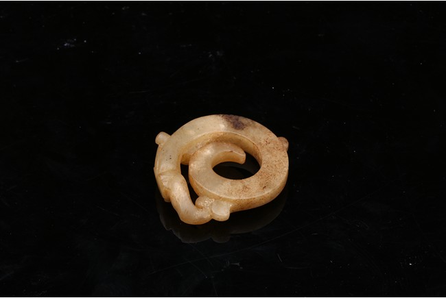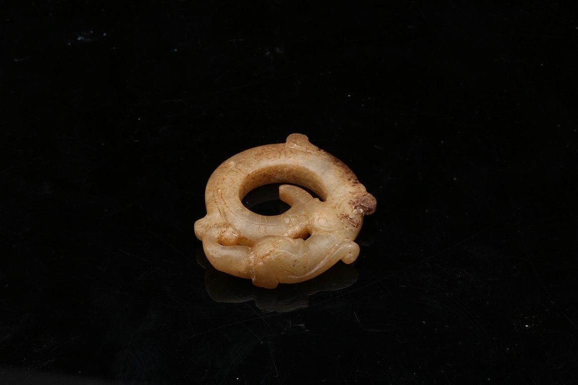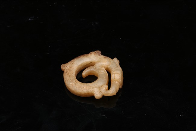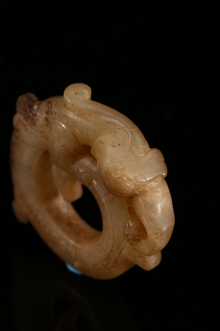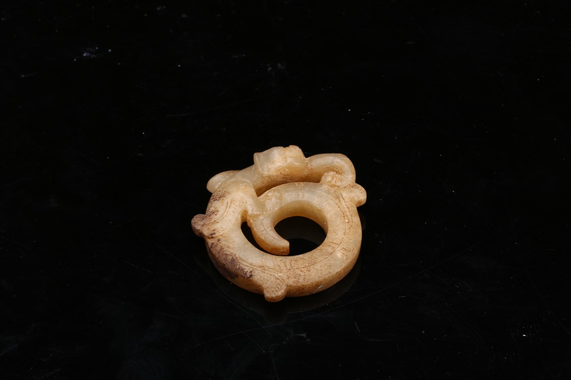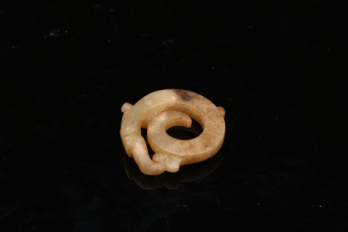 Modelled in the form of curled mythical beast with incised pattern. The stone is of mottled white and russet tone with dark inclusions. Shang Dynasty period.