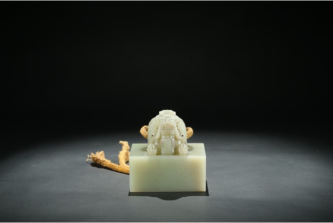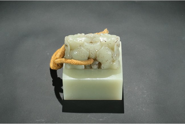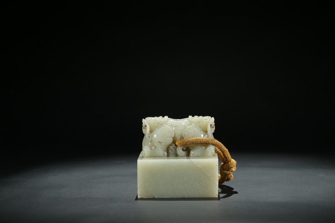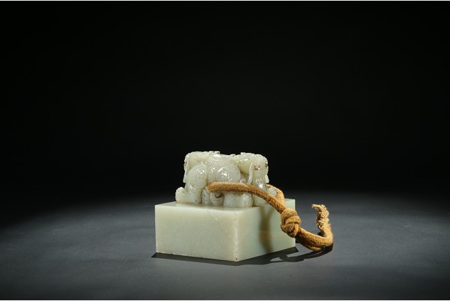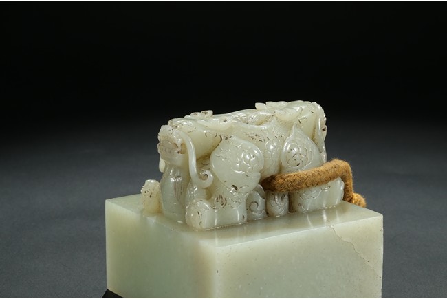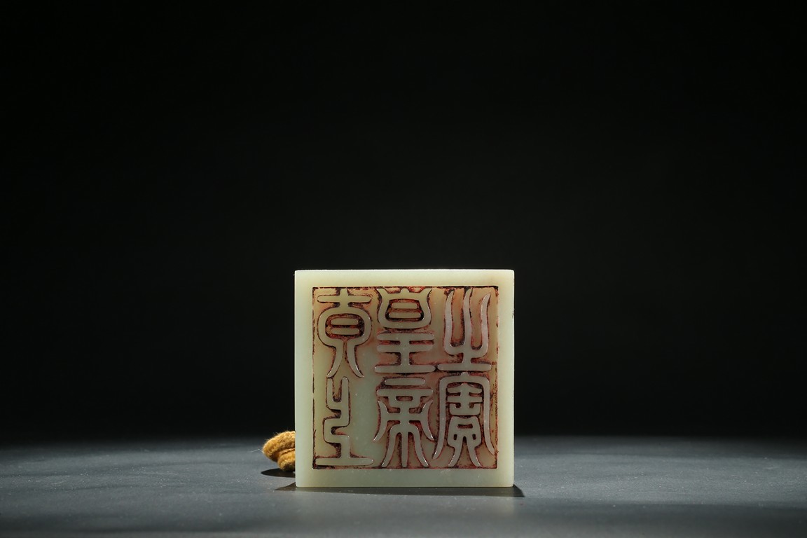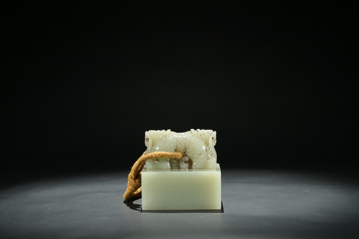 Of square section,the top carved with pair of recumbent dragons crouching on haunches,with scaly bodies,large bulging eyes,and sharp fangs. The seal face carved with six characters. The stone is of even white tone. Qing Dynasty period.