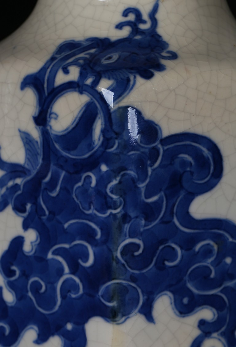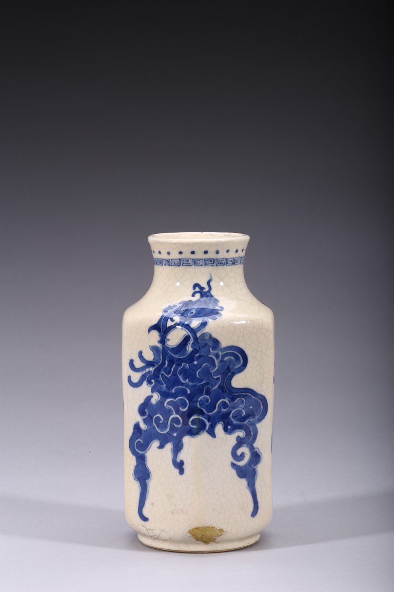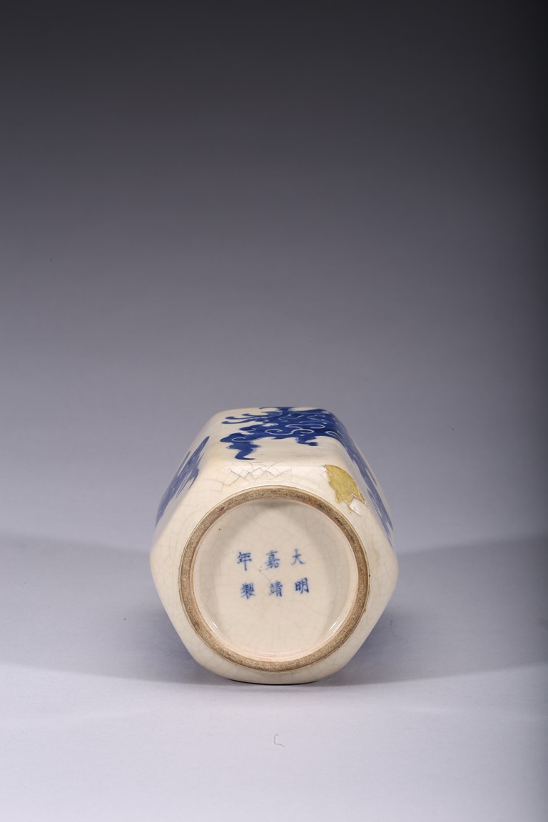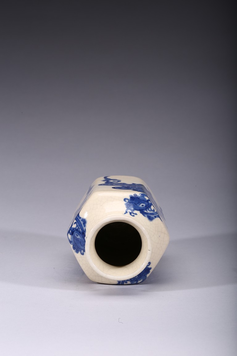 Of pentagonal form, painted around the body with phoenix emerging from clouds, all reserved on white ground with fine crackles. Qing Dynasty period.