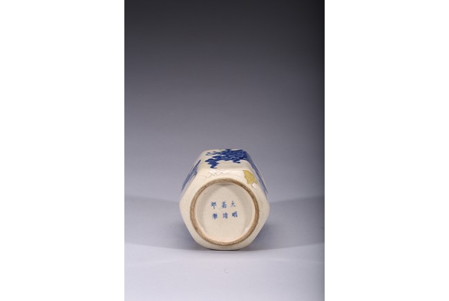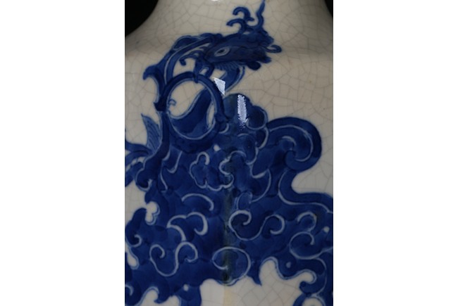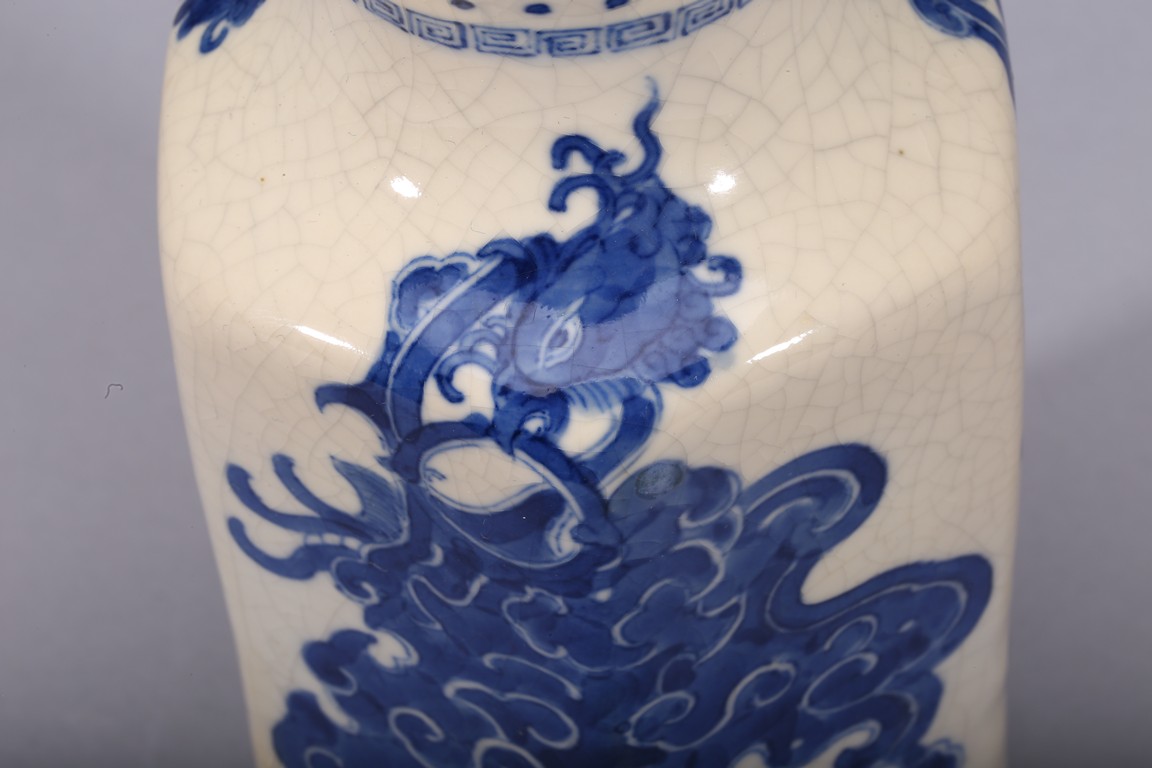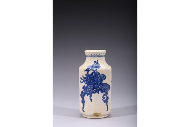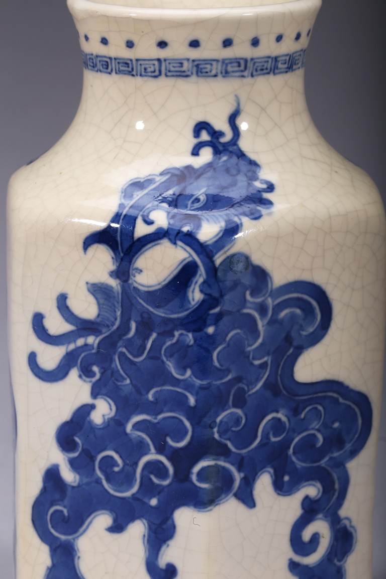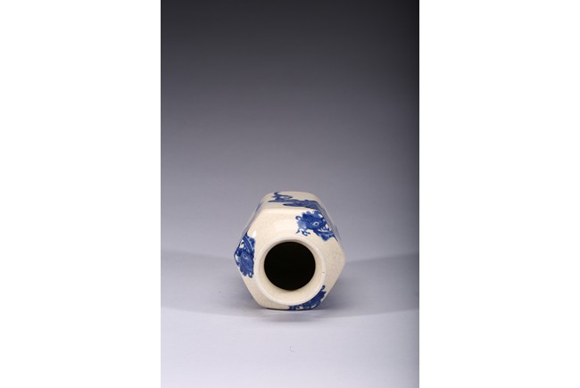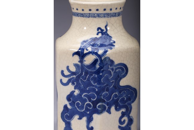 Of pentagonal form, painted around the body with phoenix emerging from clouds, all reserved on white ground with fine crackles. Qing Dynasty period.