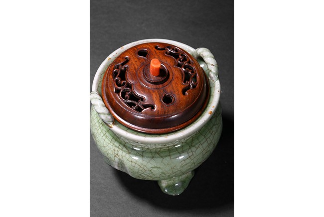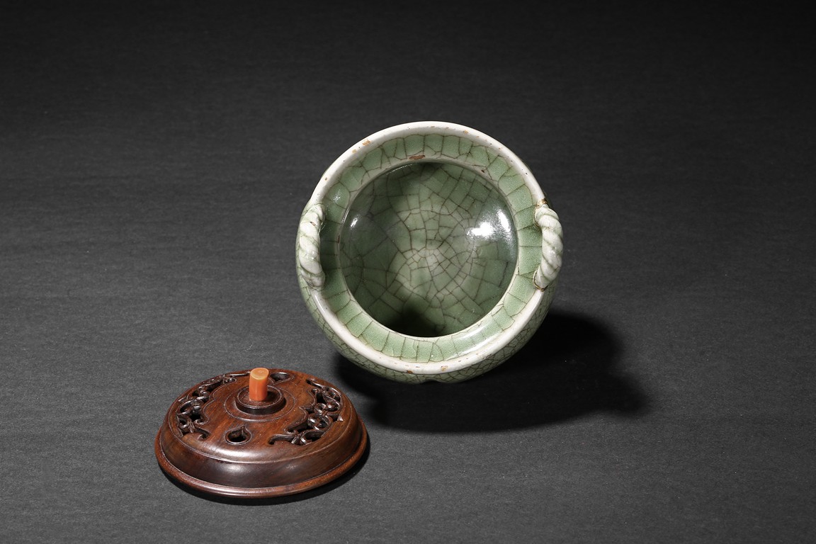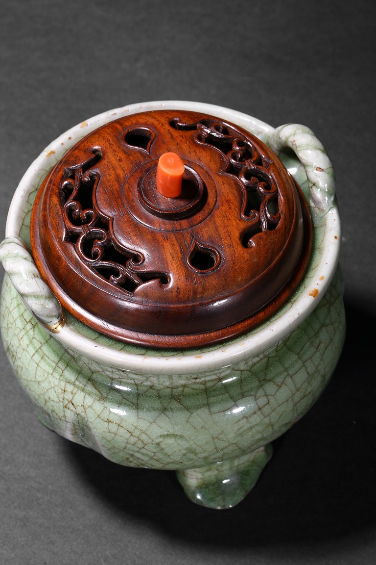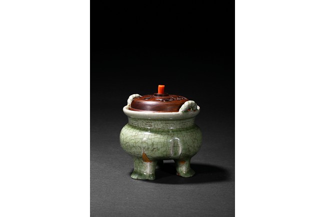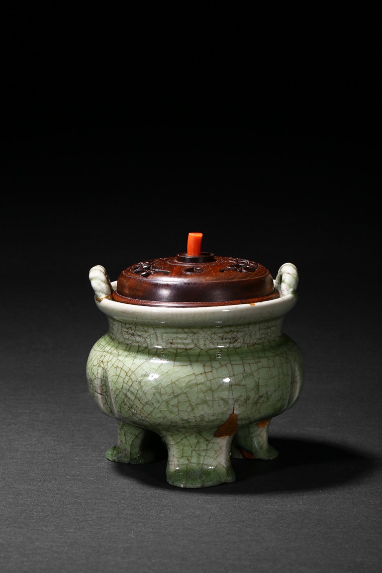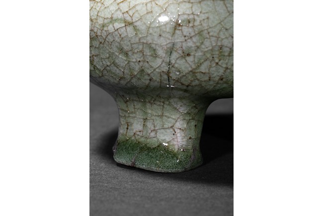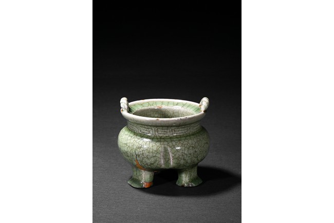 The vessel supported on three wide spreading feet to a compressed globular body, the wide straight neck with everted rim set with two robe-twisted formed handle, covered overall in an attractive olive green glaze with fine crackles. Some gold lacquer repair. Ming Dynasty period.